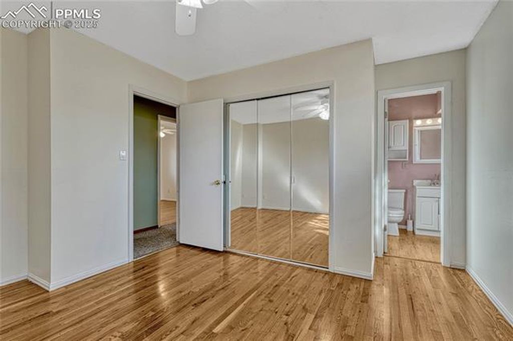 Five Bedroom Home with Hardwood Flooring and Large Backyard...A Perfect Home to live in While Making Updates...Main Level has Large Living Room, Kitchen with Eating Area, Full Hall Bath, Primary Bedroom with Half Bath plus Two Additional Bedrooms...And the Lower Level has a Large Family Room, Two More Bedrooms, Another Full Bath and a Laundry/Workroom with Windows, Sink, Refrigerator and Lots of Cabinets...There's also a One Car Garage, Covered 25 X 12 Patio and Great Storage Shed...Free Standing Air Conditioning Units are in the Garage...Location is Convenient to Petersen AFB and the Powers Corridor...If Updating is Your Thing This is Your Next Home!