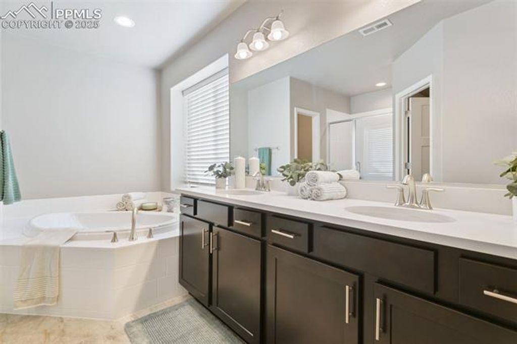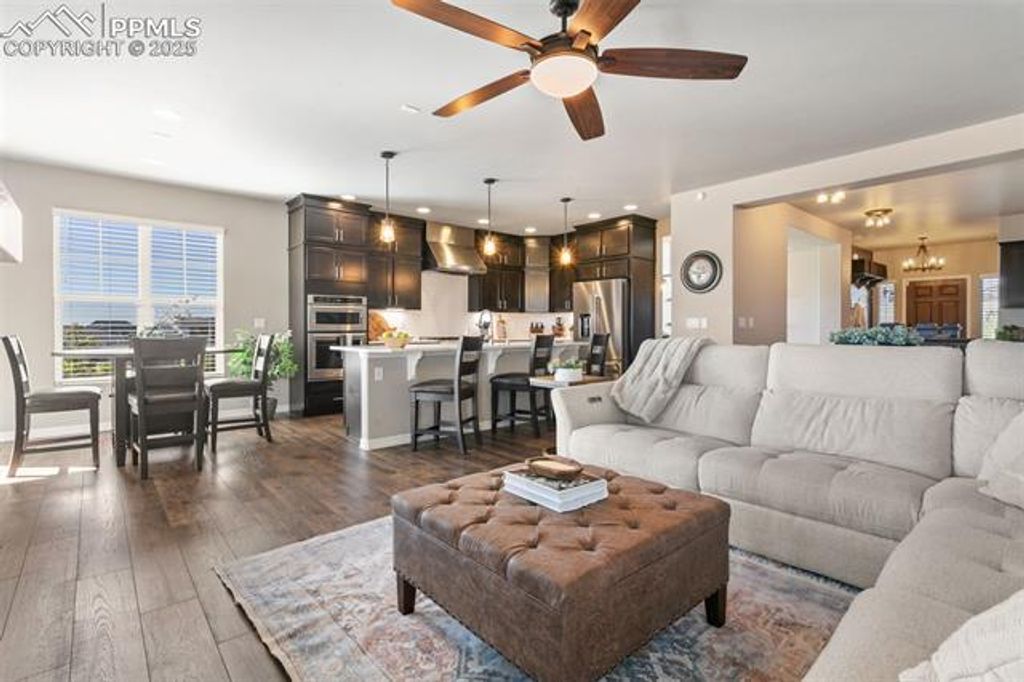 Welcome to Your Next Home in Cordera! Located in one of Colorado Springs' most desirable neighborhoods and within top-rated District 20 schools, this luxurious 2020 Campbell Homes walk-out ranch (Emerson Floor Plan) blends upscale living with comfort and flexibility. Offering two primary suites, 4 bathrooms, 2 additional bedrooms/office spaces, a fully finished walk-out basement, and a finished 3-car garage, this home is ideal for families, entertainers, or multigenerational living. Main Level: Enjoy 9-ft ceilings, open-concept design, and a spacious great room with a floor-to-ceiling stone fireplace. The gourmet chef's kitchen boasts quartz countertops, a large island, KitchenAid appliances, double ovens, gas range, and abundant storage. The covered deck is perfect for grilling or relaxing. Retreat to the primary suite with dual sinks, a walk-in glass shower with dual shower heads, vanity, and two walk-in closets"”one an oversized custom closet with center island. A secondary bedroom/office with custom shelving and wardrobe completes the main level and separate guest bathroom. Lower Level: The expansive walk-out basement has 9-ft ceilings and features a large recreation room, wine bar, and home theater area. A second primary suite offers dual sinks, garden tub, glass shower, and large walk-in closet. Another bedroom/office, full hallway bath, storage, and a covered lower patio backing to open space provide plenty of room for family or guests. Outdoor & Garage: Professionally landscaped corner lot with lush grass, trees, and shrubs. Covered front porch captures stunning Pikes Peak views. The 3-car finished garage includes epoxy floors, ceiling-mounted storage racks, workshop-ready outlets, and commercial-grade openers. Upgrades: Whole-home humidifier, radon mitigation system, dual 50-gallon water heaters, and a Class 4 hail-resistant roof with ridge vents. This rare Cordera gem offers the perfect blend of luxury, location, and lifestyle, truly move-in ready.