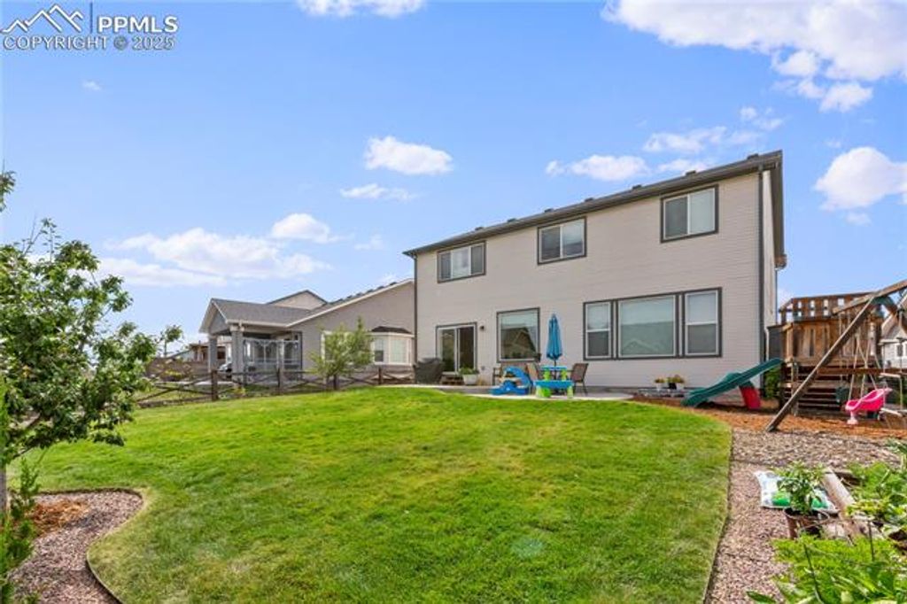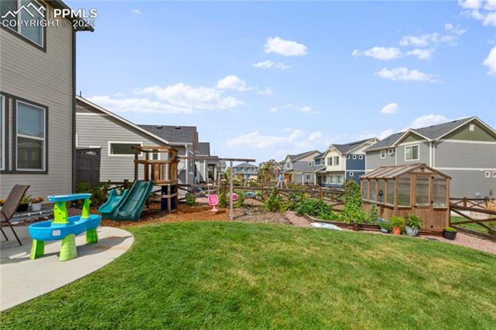 Welcome home to this 6 bedroom, 4 bathroom, 2 car garage classic home located in the heart of beautiful Banning Lewis Ranch! This home offers beautiful luxury vinyl plank flooring throughout the main traffic areas to include the entry, kitchen, drop zone and dining room! Notice the warm natural light throughout as you tour this beautiful home! The main level office is conveniently located on the main level and comes with great built-ins! The large living room has nice carpeting as well as huge windows to let the beautiful Colorado outside in! The spacious dining room is adjacent to the kitchen and offers a nice coffee bar! The kitchen is the heart of the home with a huge pantry, oversized island for seating as well as a gorgeous country built-in sink! Tons of cabinets as well as beautiful quartz countertops, all stainless steel appliances and natural gas stove for the chef in your family! Convenient drop zone as you enter this home from the garage for your shoes and coats as well as a nice sized 1/2 bath complete this level! Head upstairs to find the spacious master suite with cove ceiling, beautiful 5 piece master bath and huge walk-in closet! There are 3 additional large bedrooms on this level as well as the laundry room and a full bathroom! Head to the basement to find two additional large bedrooms, a huge family room and the final full bathroom! The backyard has been nicely landscaped with a children's play area, tons of grass, a spacious patio, storage shed and a garden area with greenhouse for the green thumb in your family! With A/C for this warm Colorado summer days, there is nothing left to do here but move in!