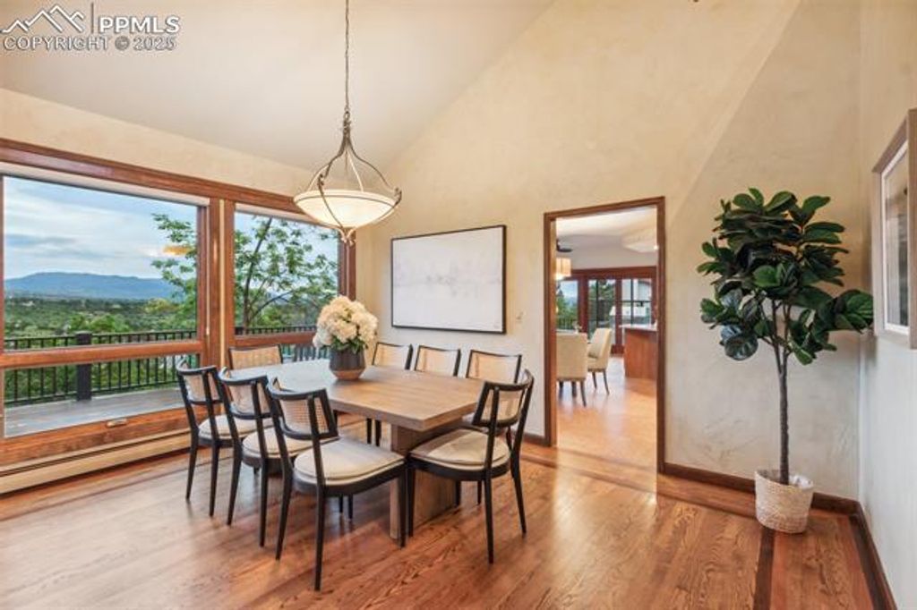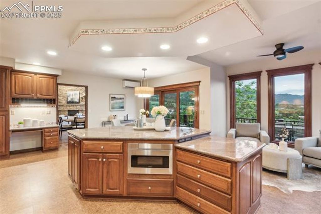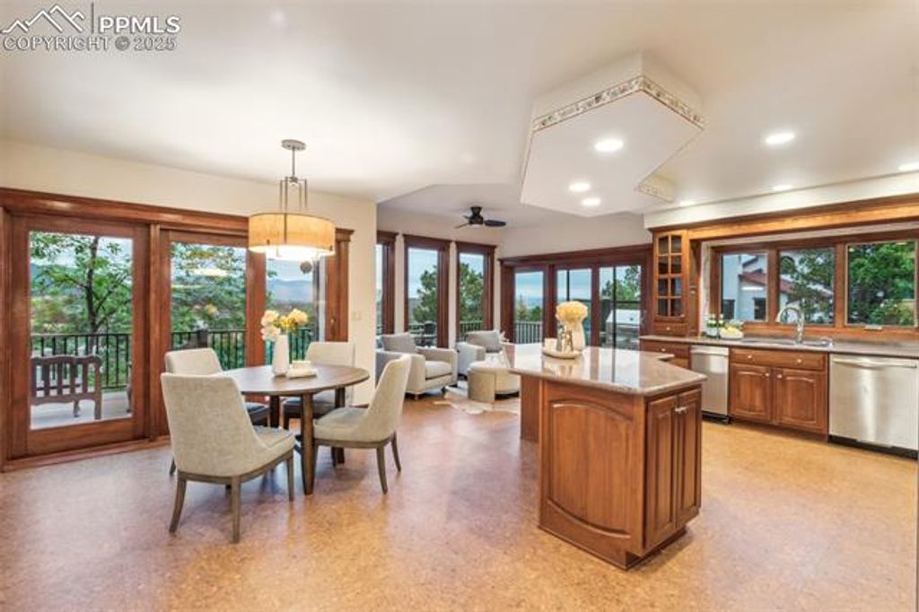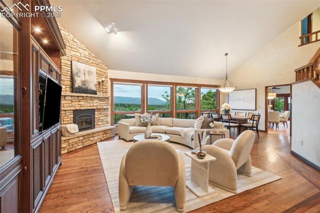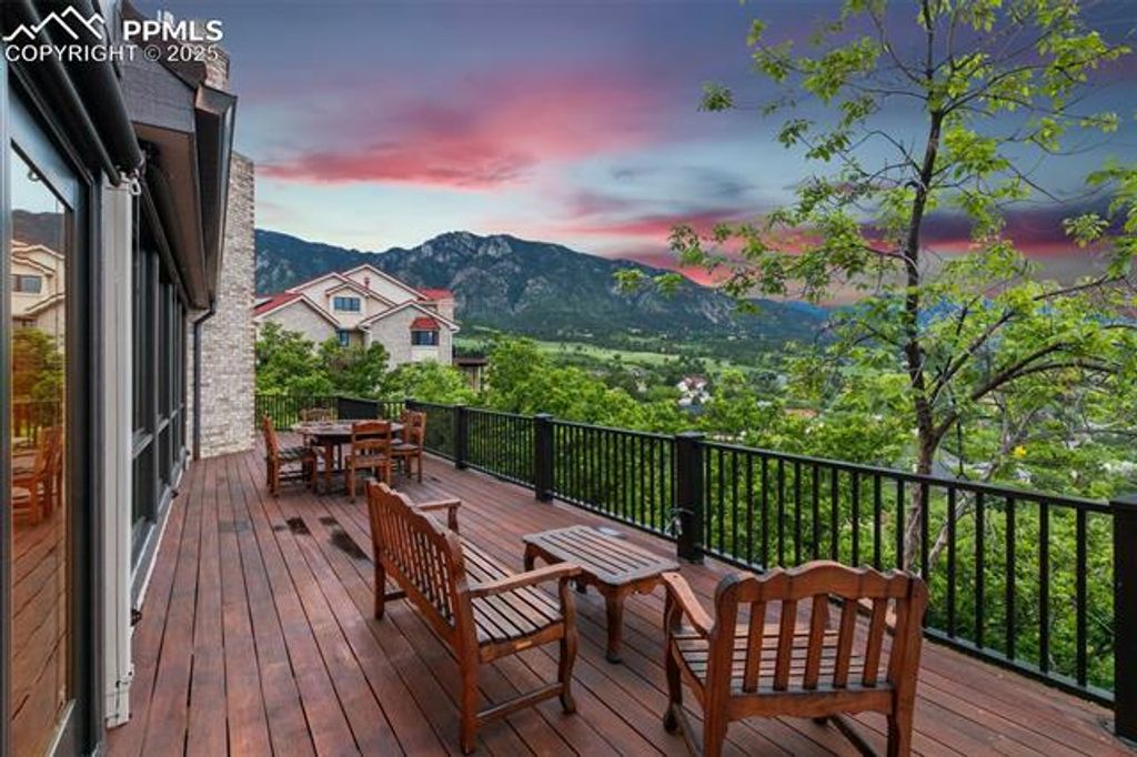 Experience the perfect mix of luxury and intelligent design in this masterfully upgraded home, where energy efficiency meets modern sophistication. Nestled in a serene, quiet neighborhood, this residence offers not only a beautiful interior but also cutting-edge systems that enhance comfort & minimize utility costs. At the heart of the home is a Zehnder Heat Recovery Ventilation (HRV) system"”a gold standard in indoor air quality"”working in harmony with a hydraulic boiler-powered radiant heat system for consistent, even warmth. Complementing this is a newly installed in-ceiling mini-split heat pump system, offering zone-by-zone temperature control, so every room can be individually heated or cooled to personal preference. The home also features a high-performance attic fan, and all windows were replaced just four years ago, which significantly boosts insulation and reduces heat loss. Mobile app-controlled thermostats enable you to manage comfort, and the 200-amp electrical service with two 220V outlets in the garage ensures EV readiness for your future-forward lifestyle. Step outside onto a wrap-around Brazilian hardwood deck overlooking an incredible panoramic view that extends from Cheyenne Mountain all the way North to the Palmer Divide, accompanied by an extraordinary full-steel outdoor gas grill with connected gas line. The beautifully updated primary bathroom features a travertine slab and one of the two gas fireplaces upstairs, with a wood-burning fireplace downstairs. The built-in sound systems and the TV stay. Fresh paint throughout, new modern lighting fixtures recently added, and stylish window coverings are included throughout. The backyard features new custom-built steps, a tranquil covered patio with a water feature. The lower level features a walkout with auto-coiling security shutters for added peace of mind. In addition to the private lot, a 1/4 interest in the adjacent northern lot is included, thereby securing this incredible view in perpetuity.