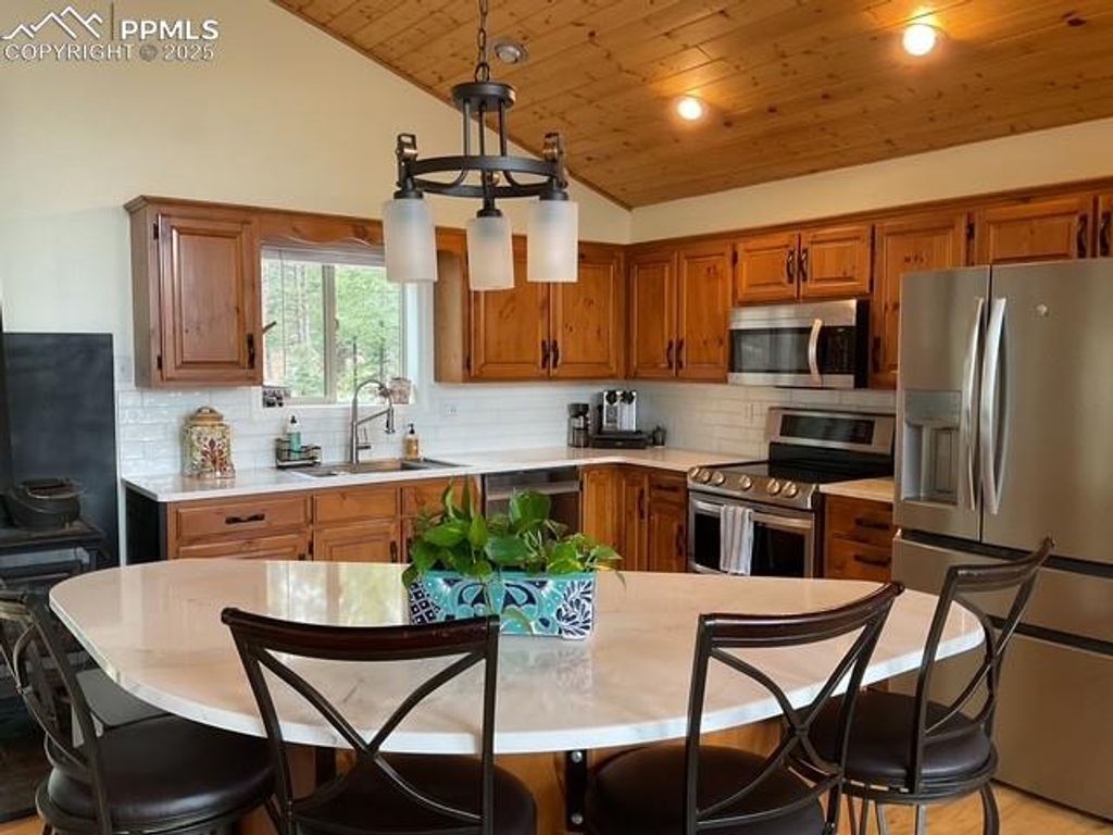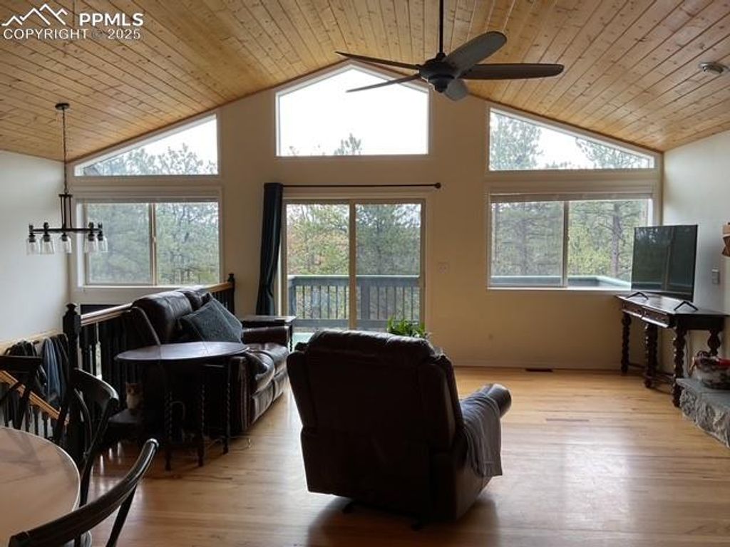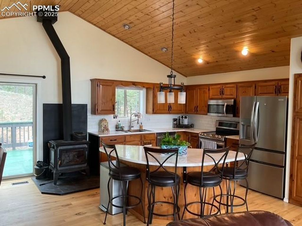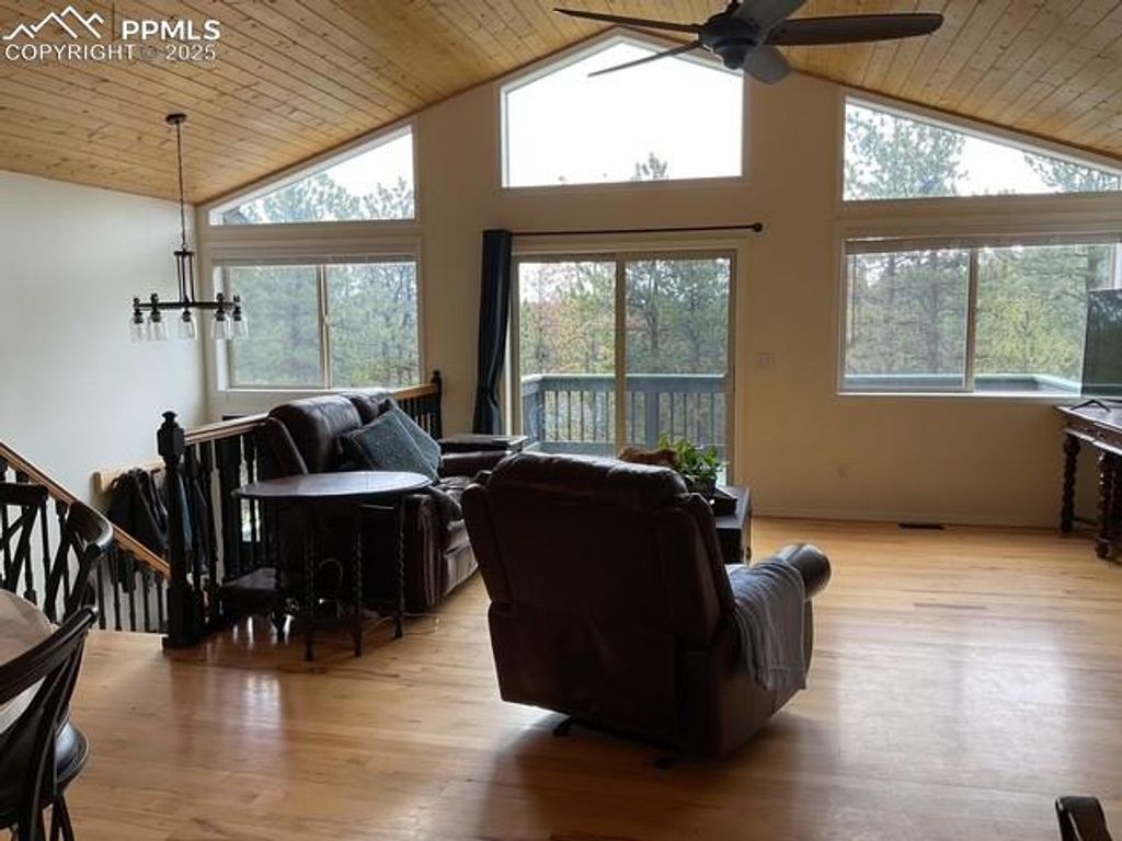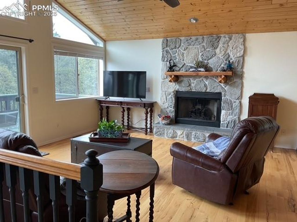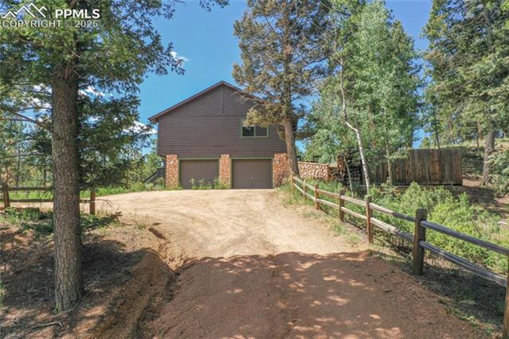 Charming Updated Bi-Level Home on 5 Acres Near Woodland Park; If you're in the market for a beautifully maintained, open-concept home just minutes from Woodland Park, your search ends here; this inviting property seamlessly blends modern upgrades with cozy mountain charm; From the moment you arrive, the freshly painted exterior and decks welcome you with style and curb appeal. These outdoor spaces are perfect for relaxing with a morning coffee or entertaining guests amidst the natural surroundings; Inside, you'll be greeted by gleaming hardwood floors and an abundance of natural light streaming through large windows; The spacious open layout is enhanced by recessed lighting and ceiling fans throughout, offering comfort and energy efficiency year-round; The heart of the home the kitchen has been thoughtfully updated with new stainless-steel appliances, including a Frigidaire refrigerator, LG stove and microwave, Samsung dishwasher, and a Glacier Bay sink. A central island with a breakfast bar offers the perfect spot for casual meals and conversation; The living room features a stunning stone-faced wood-burning fireplace and a Hearthstone Radiant wood stove, adding both warmth and rustic elegance; The main level primary suite boasts a private bath and a walk-in closet, while two additional bedrooms offer brand-new carpet, track lighting, and ample space for family or guests; A full guest bathroom features slate tile flooring and a granite countertop; Lower level, enjoy a massive media room, 4th bdrm, or family room ideal for movie nights, game days, or extra guest space with it's own entrance; The lower level also includes a dedicated laundry area with pantry storage and convenient access to the two-car attached garage; There's even an RV turnaround for added flexibility in the drive cutout; Additionally property has been fire midigated, USB outlets, and a blend of stylish fixtures and upgrades throughout; Don't miss the opportunity with potiential seller concessions!