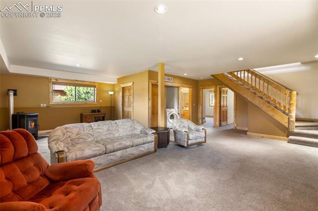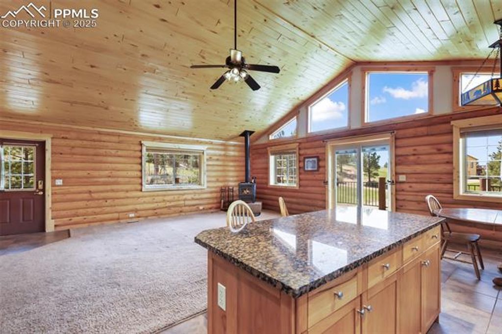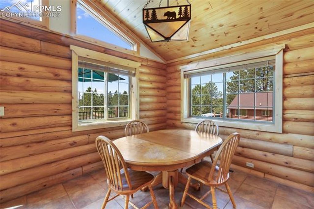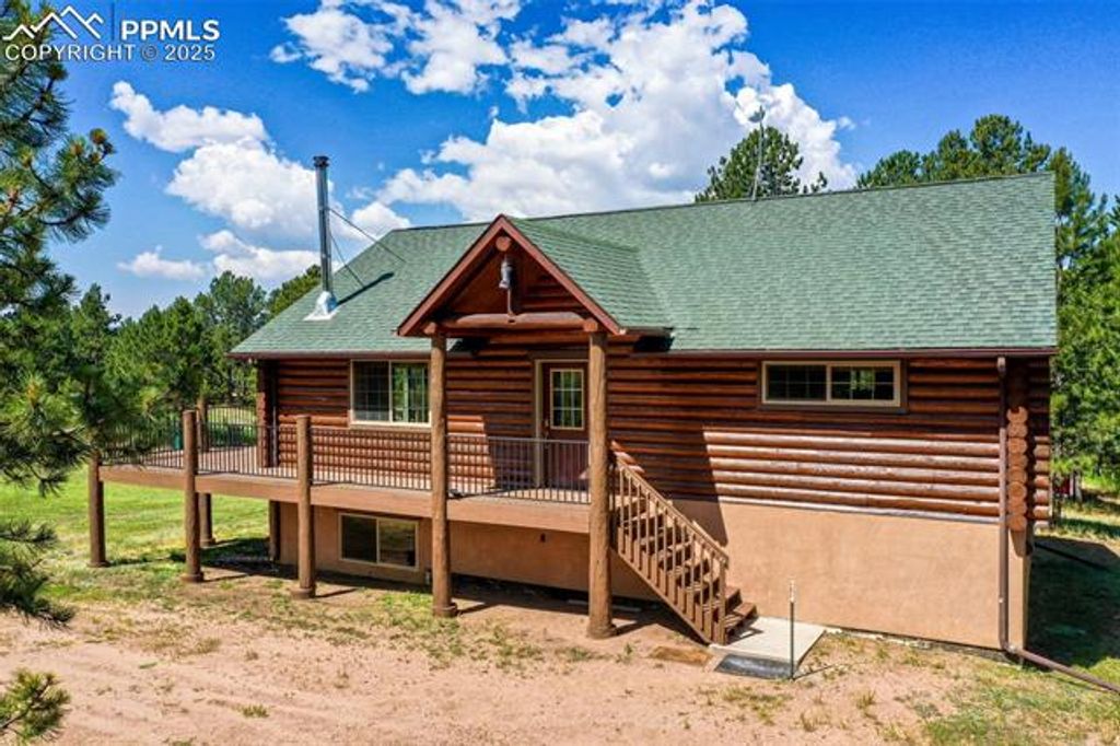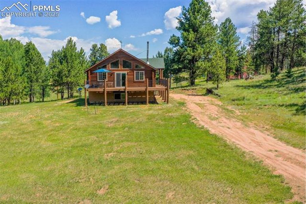 Charming Full Log Home on Private, Level Lot - Mountain Living at Its Finest! Escape to your mountain retreat with this beautifully maintained full log home, freshly stained and nestled on a serene, level lot. Offering over 2,350 square feet of warm and inviting living space, this home blends rustic charm with modern amenities. Step into the spacious great room, featuring stunning knotty pine walls, beamed ceilings, and a cozy wood-burning free-standing fireplace. The open-concept design flows effortlessly into a trendy kitchen adorned with granite countertops, stainless steel appliances, and an island with a breakfast bar - perfect for entertaining. The adjoining dining area opens to an expansive wraparound deck, ideal for relaxing or hosting under the stars. The main-level master suite includes a private full bath and a generous closet, while a convenient half bath completes the main level. A custom log handrail leads you downstairs to the bright and spacious garden-level family room, warmed by a pellet stove. This lower level also includes two additional bedrooms and a full bath"”perfect for guests or family. Located just minutes from Florissant and 25 minutes from Woodland Park, this home offers easy access and is less than 2 miles from Teller 1. Enjoy nearby hiking and trail riding, with world-class fishing and premier ski resorts less than an hour away. Whether you're looking for a full-time residence or a weekend getaway, this log home delivers the quintessential Colorado lifestyle.