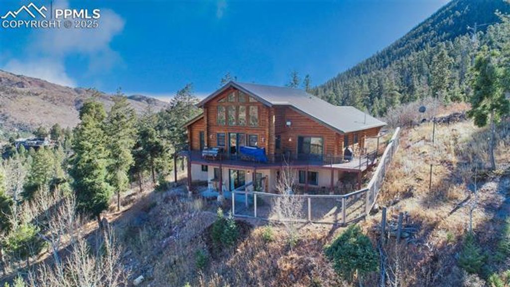 Fantastic log home perched high on the mountain sitting on over an acre. Amazing views of Ute Pass, Pyramid Mountain and Rampart Range. Home has upgrades throughout and is in move in condition. Alder cabinets in the kitchen, quarts countertops, newer stainless-steel appliances, gas range, smart refrigerator and hardwood oak flooring flows throughout most of the living areas on the main floor. Vaulted ceilings are pine tongue and groove and have log beam accents that traverse the main and upper floors. Dining area is roomy with a glass slider that leads to the wrap around deck. Cozy living room has a Lopi wood burning stove and a walk-out door to the deck. Main level owner's suite, 5 piece bathroom and a walk-in closet. Hall bath on the main level is half and is centrally located in a convenient area. Main level laundry/mud room has cabinet storage, wash sink and is located between the garage and kitchen. Half round log staircase takes you up the spacious loft. A wall of windows to enjoy the views. Loft could be used as a bonus room and still would accommodate an office on one side. Lower-level family room is a walkout and has no basement feel to it. All three lower level bedrooms are oversized and have excellent closet space. Full bath in lower level with double vanities. Storage room in the lower level for all the decorations. Heating system is natural gas, hot water baseboard and is very efficient. Metal roof and driveway is paved. Fenced in dog run on the west side of the home. Garage is oversized and finished. Away from the home is a second deck on the ground level to enjoy the outdoors. Current owners have done extensive tree mitigation. This home sits just one lot away from Pike National Forest and you can walk from the house to an access point to "Ring The Peak Trail". From here, many miles of trails can be hiked. This home is a true Colorado dream home, come and take a look.