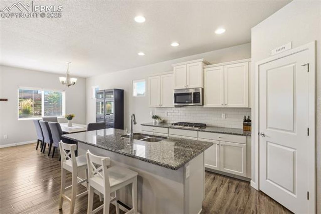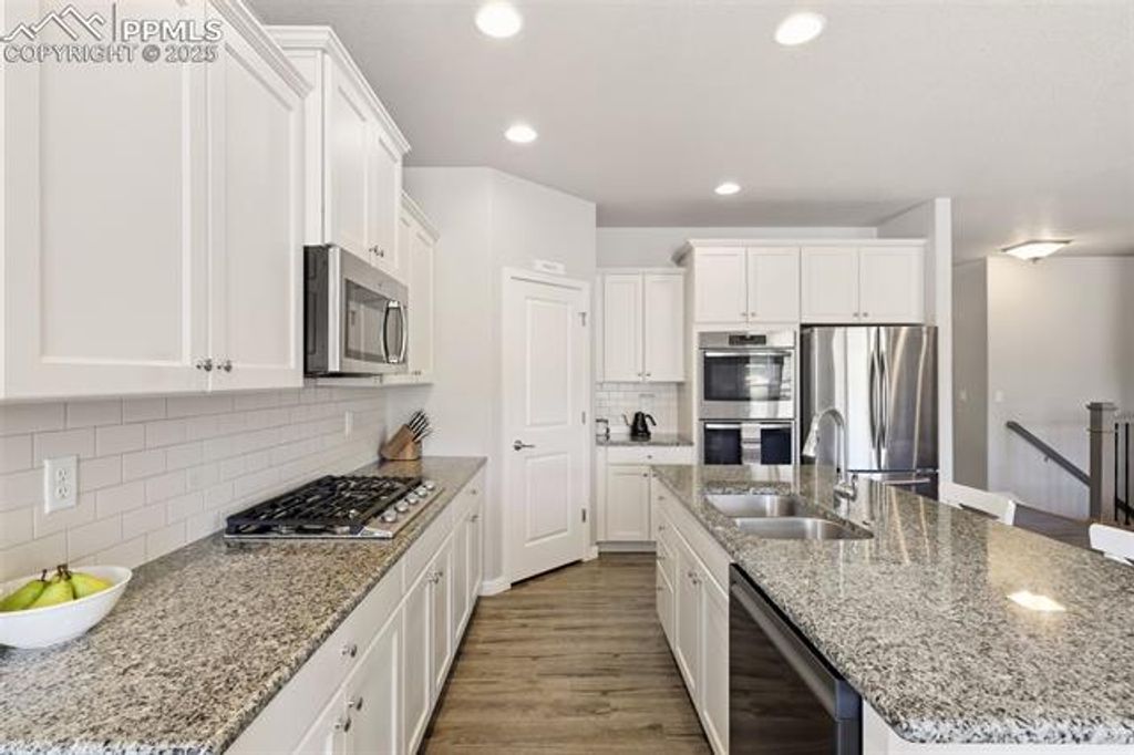 This beautiful home is open, bright, and spacious. The open-floor plan brings provides harmonious living for the kitchen, dining room, and living room. A gas fireplace and large windows sit opposite the spacious kitchen with an extended island. The kitchen has upgraded counter tops over soft-close cabinets along with double ovens, a walk in pantry, and a gas range. The kitchen is a cook's dream. The main-level master has a tall ceilings, large windows, and an en-suite bathroom. The master bathroom has a massive shower with double shower heads and bench seating. The master also features a walk-in closet with plenty of space. Two other bedrooms plus a full bath and laundry finish out the beautiful main level. The finished basement features a large living area with plenty of space to enjoy. Two more bedrooms and a full bathroom provide ample space for everyone. The basement also features an unfinished storage area, a huge bonus to the home. The backyard has new turf, professional landscaping, and a smart sprinkler system, which connect to the covered patio. This home is full of light and space inside the desirable Wolf Ranch community. Community features include a pool, recreation center, dog park, miles of trails, parks, and a lake. Enjoy living close to town while in a relaxed, amenity-filled home.