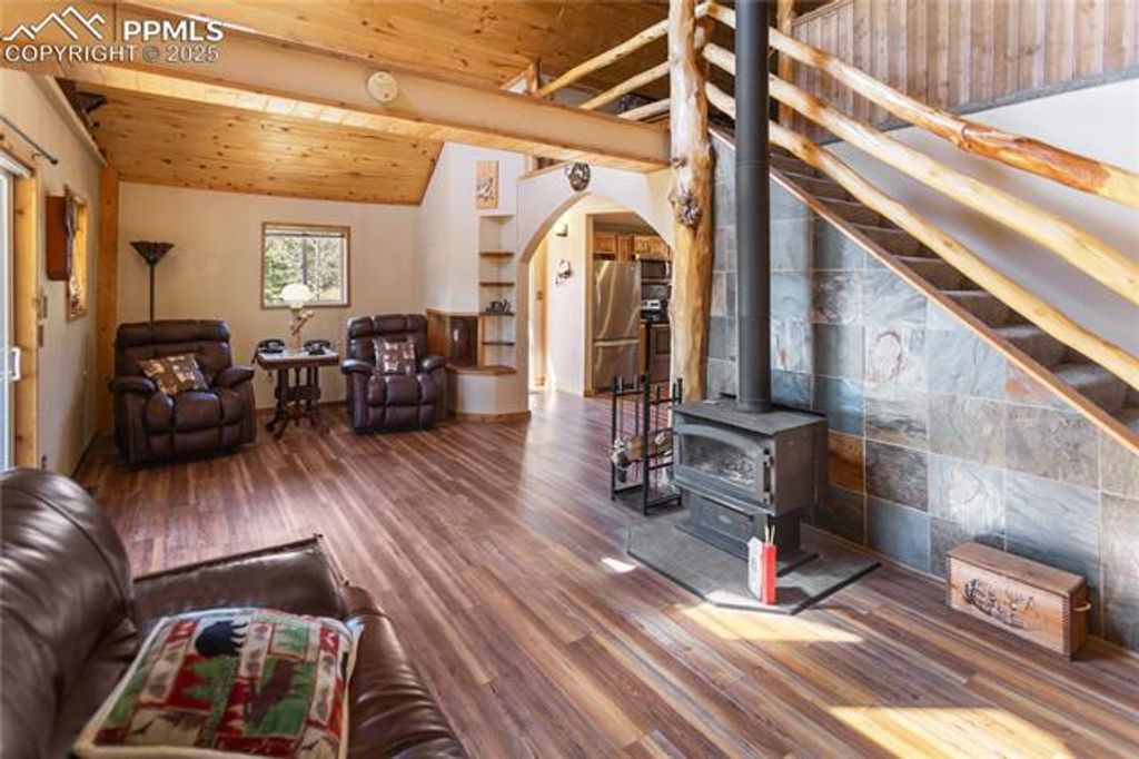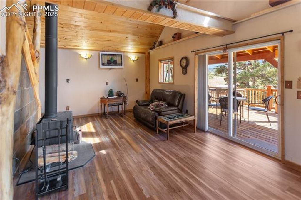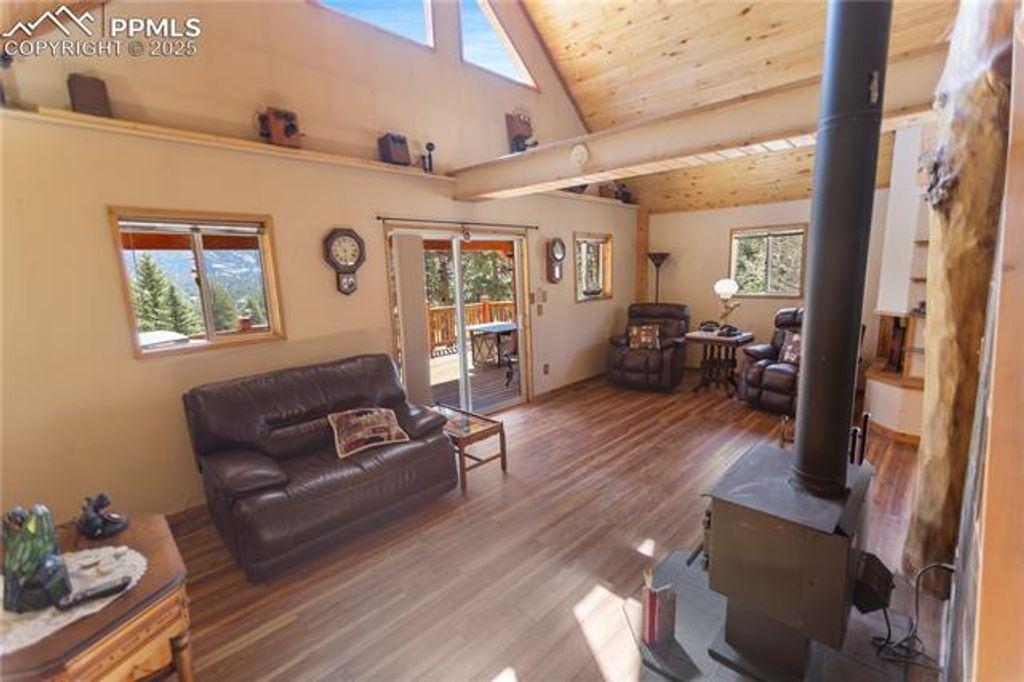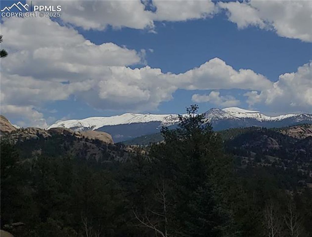 This charming mountain property offers stunning Pikes Peak views and comfortable living with 1705 sq ft. Situated on a 2+ acres with a mix of pine and aspen. Need more space, the adjacent 2-acre parcel is available. The home features an open 12x24 living with breathtaking Pikes Peak views, vaulted wood ceilings, a cozy wood-burning stove and log post and railings. The adjacent kitchen has granite countertops and stainless steel appliances, The dining is perfect for a relaxing meal. On the lower level is the primary bedroom, also with Pikes Peak Views and a Rinnai heater for added comfort. The en-suite bath has heated porcelain floors, a jetted whirlpool tub with a unique dolphin water spout, a freestanding shower, and a single vanity with a granite countertop. A third bedroom is also located on the lower level with ample closet space and a separate access to the primary bath. The lower-level laundry room features ceramic flooring and includes a washer and dryer. Upstairs, a loft-style bedroom and bath offers vaulted wood ceilings, a mix of carpet and premium vinyl flooring, a single vanity, and a tub/shower combo. Outdoor, the property includes a 2-car detached garage and a separate 1-car detached garage that could double as a workshop. Multiple seating areas are scattered about, perfect for enjoying the serene surroundings and the impressive Pikes Peak vistas. A fire pit provides a wonderful gathering spot. You can also expect to see some friendly "4-legged neighbors" adding to the peaceful atmosphere. Recent updates include new roofs (2018), exterior paint (2021), bathroom remodel (2022), a deck update (2022), new LED lighting (2022), recessed lighting (2023), deck refinishing (2024), and mitigation (2024). Only 5 minutes to Evergreen Station and within a short drive to Cripple Creek or Florissant, Divide and Woodland Park. Plus close proximity to hiking, biking, fishing, OHV, and rockhounding areas. The adjacent 2+ acres is also available. MLS: 8729409