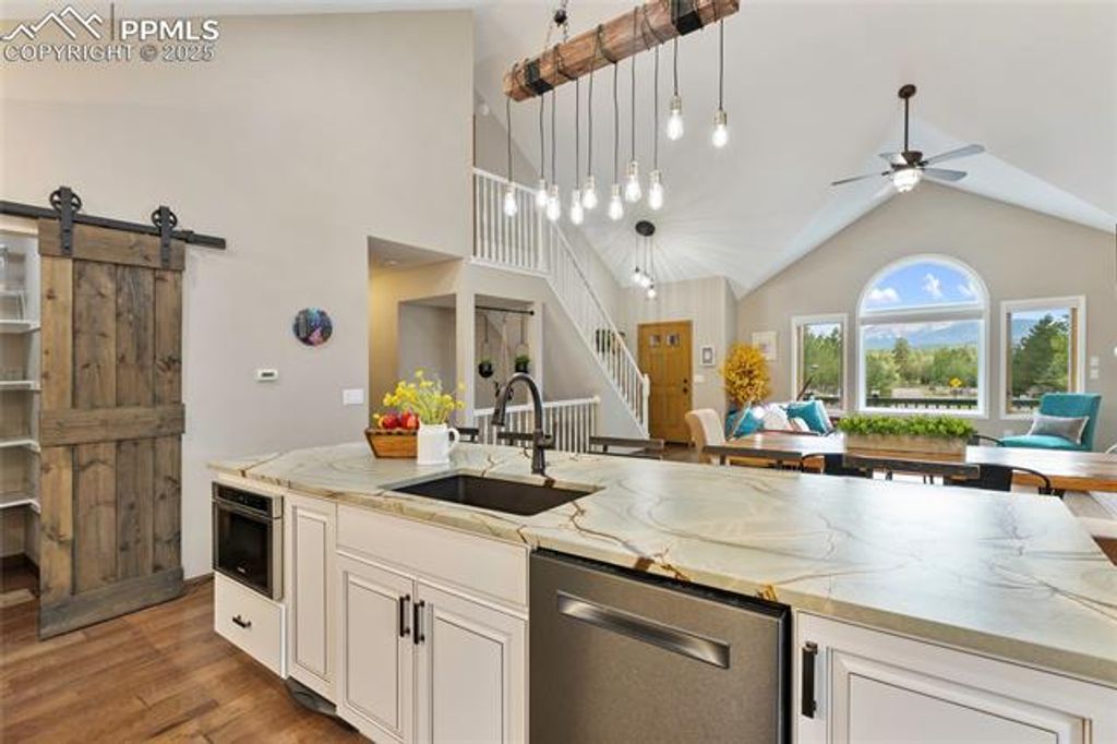 Elegant Woodland Park Home with Breathtaking Pikes Peak Views. Welcome to this stunning home in the desirable Crestwood Park neighborhood"”perfectly located near schools, parks, and trails. Designed for both comfort and style, this home combines thoughtful upgrades with a functional open layout, perfect mountain living. Step into the vaulted great room, where expansive picture windows frame an unobstructed view of iconic Pikes Peak. The professionally designed gourmet kitchen is a true showpiece, featuring Bosch black stainless appliances, a recirculating hood, and drawer microwave. Blue Roma leather finished slab countertops with a 10-ft island, pull-out spice and appliance cabinets, dedicated coffee station, bronze touch faucet, and a walk-in pantry with barn door create the ultimate cooking and entertaining experience. This home offers two luxurious en-suite bedrooms. The spacious main-level suite boasts hand-scraped hickory floors, a private bath with walk-in shower, and its own entrance from the back deck. Upstairs, the second suite offers a spectacular Pikes Peak view, private bath with double vanity, and walk-in custom tile shower. The finished lower level includes two additional bedrooms with a shared bath, plus a large unfinished flex space"”perfect for a home theater, office, gym, or guest kitchen. Enjoy Colorado's outdoor lifestyle with the Lovell Gulch Trail right behind your home and the Centennial Trail, Manitou Lake, Crestwood Park, and the Woodland Aquatic Center all within walking distance. Downtown Woodland Park, Memorial Park, and excellent public and charter schools are just a few minutes away. Mueller State Park is a quick 20-minute drive, Colorado Springs only 30 minutes, and world-class skiing less than two hours from your doorstep. Whether as your full-time residence or a lucrative rental, this home offers the perfect balance of mountain serenity, modern convenience, and unbeatable location. Call today to schedule your private showing.