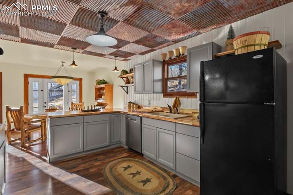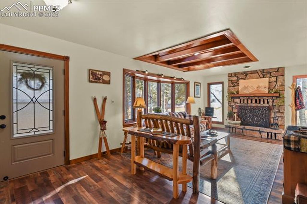 Nestled in the highly sought-after Westwood Lakes neighborhood of Woodland Park, this inviting mountain retreat welcomes you with curb appeal. A brand-new asphalt driveway and freshly painted exterior set the tone. As you enter, soaring vaulted ceilings and rich natural wood accents immediately evoke the Colorado mountain ambiance. Abundant natural light pours through windows and skylights. The spacious living room centers around a cozy gas fireplace, perfect for chilly evenings. The kitchen has been updated with new cabinetry, warm butcher-block countertops, and plenty of workspace for the home chef. The adjacent dining area is generous enough for large gatherings and opens directly to a sunny patio ideal for summer barbecues or morning coffee. Head upstairs to the tranquil primary suite, complete with its own private balcony. The attached bath offers convenience and comfort. Two additional bedrooms share a second balcony and a well-appointed full bathroom, providing plenty of space for family or guests. The walk-out lower level feels like a second living area: a large family room warmed by a gas-burning stove, a convenient half bath, and a luxurious sauna"”your personal oasis after a day on the trails. A spacious laundry closet sits with washer and dryer included. The oversized two-car garage is extra-deep, perfect for storing ATVs, bikes, or a workshop. An additional storage shed keeps seasonal items neatly tucked away. Move in ready with fresh paint and LVP flooring. Multiple decks and the private patio create outdoor living at its fines, watch deer wander by, listen to the pines rustle, or simply soak in the serenity of Teller County's breathtaking landscape. Perfectly situated just minutes from Woodland Park's charming shops, restaurants, schools, and convenient access to hiking, fishing, skiing, and outdoor adventure"”this home offers the ideal blend of mountain seclusion and everyday convenience. A true Woodland Park gem ready for you to call home.