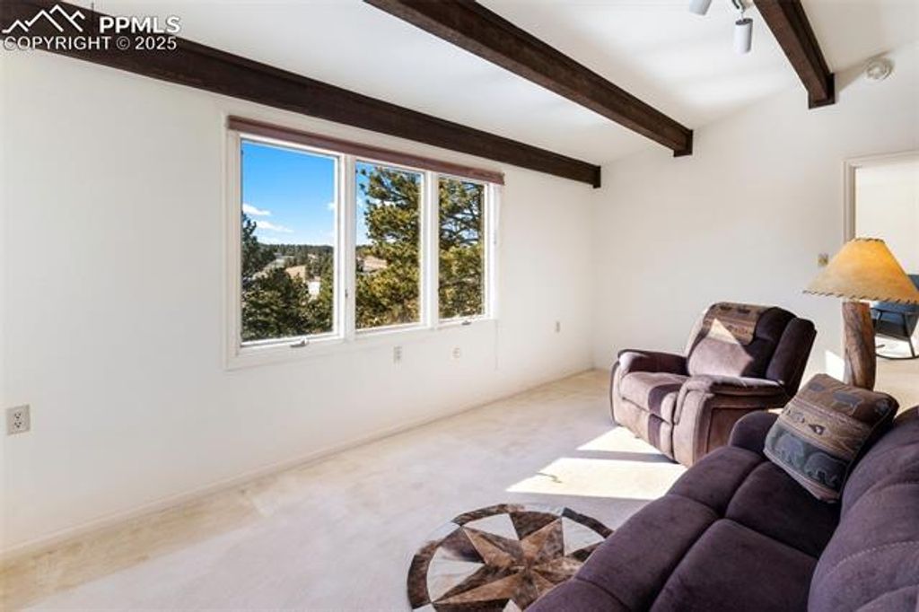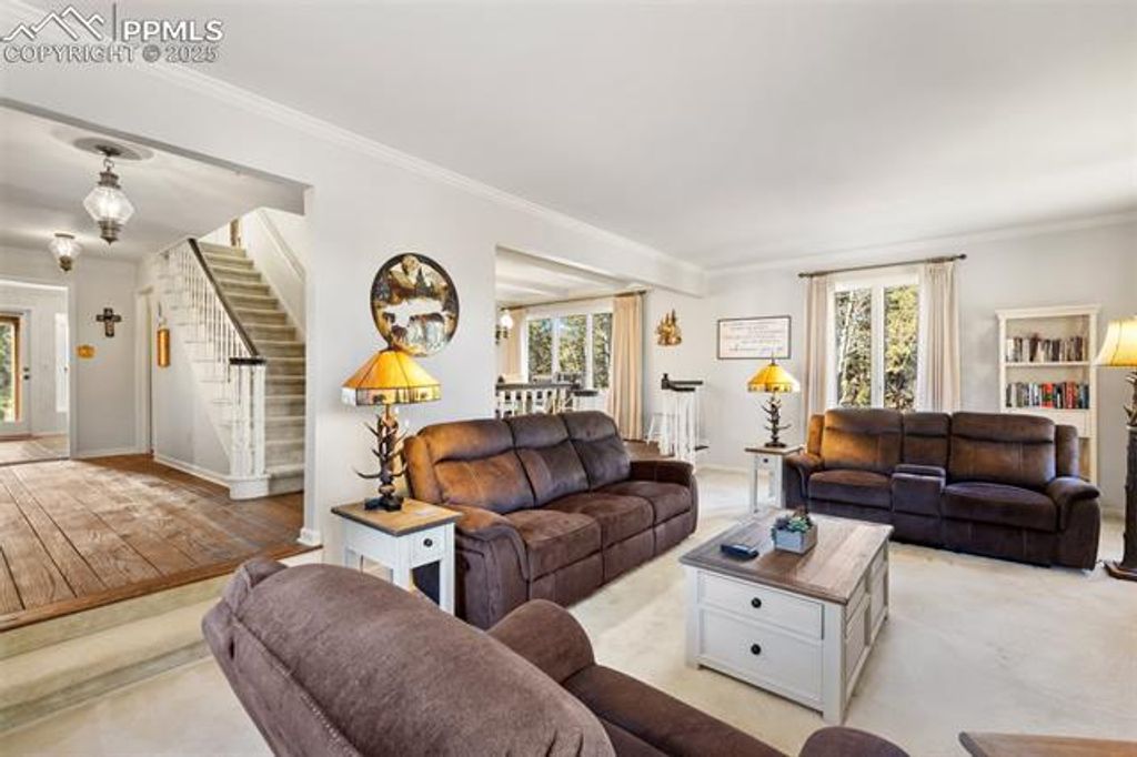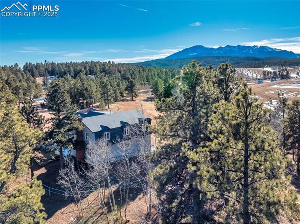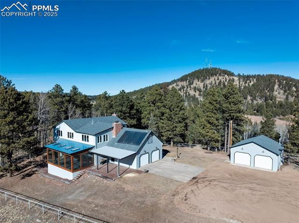 This stunning property showcases breathtaking unobstructed Pikes Peak views & offers the perfect blend of luxury living & exceptional equestrian amenities! Situated on 23.73 agricultural acres, the property features a 6-stall barn, 2 loafing sheds with separate corrals, & an additional outbuilding with 3 stalls & 2 private rooms ideal for an office & additional tack room. The barns have their own well & electric with a private gated entrance off of Hwy 24, creating the potential for a boarding facility or rental income opportunity. The home has been extensively updated, beginning with the beautiful new sunroom. This inviting space features a new electric fireplace, new vinyl windows, tile flooring, stucco, custom log accents, & an active solar temperature control which helps regulate temperature. The Family room has been refreshed with new LVP flooring, paint, & a 3-panel sliding door which opens up to the sunroom. The welcoming living room features a new gas insert fireplace with battery backup providing warmth even during a power outage. The kitchen has been beautifully updated with a new refrigerator, dishwasher, trach compactor, quartz countertop, backsplash, & newly painted cabinetry with new hardware. The primary bath features dual vanities with granite counters & new flooring. The basement has all new carpet & paint. It would make a great game room. Additional improvements include new electrical panels, GFCIs, 220V service to detached garage, & a new main sewer line. This Home is sold mostly furnished with beautiful furnishings. The home is on city water plus there are 2 wells (one is domestic). It offers 3 fireplaces, one is electric, one is gas & one is wood burning . There ae 3 family rooms, a formal living room, a loft with Pikes Peak views, attached 2-car garage & oversized detached 2-car garage. Fully fenced & walking distance to Woodland Park! This property would make a great wedding venue or vacation rental. Properties like this are hard to come by.