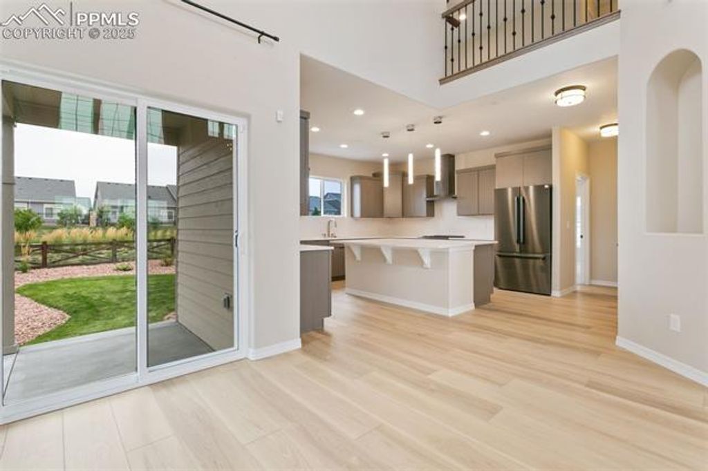 Step into this stunning home located in the highly sought-after Banning Lewis Ranch community"”offering resort-style living and endless amenities! Enjoy access to social events, a beautiful clubhouse, multiple swimming pools and splash parks, a dog park, pickleball courts, playgrounds, walking and biking trails, and a state-of-the-art fitness center. Conveniently situated near the Powers Corridor, this home combines modern luxury with an ideal location. Inside, you'll find beautiful wood laminate floors flowing throughout the main level and a bright, open floor plan perfect for both everyday living and entertaining. The chef's kitchen is a true showstopper, featuring a large island, double oven, pantry, and ample cabinetry for storage. The adjoining living room offers a cozy gas fireplace, creating a warm and inviting space to unwind. Upstairs, the spacious primary suite includes a luxurious five-piece bath, perfect for relaxing after a long day. The mostly finished basement adds even more living space and features a wet bar complete with a dishwasher and extra cabinet storage and it's own beverage fridge"”ideal for hosting friends and family. A small unfinished area provides convenient storage options. Both the front and back yards are fully landscaped, and the covered front porch offers a charming spot to enjoy your morning coffee. With its thoughtful design, modern finishes, and unbeatable community amenities, this move-in-ready home is the perfect blend of comfort, style, and convenience. Don't miss the chance to make it yours!