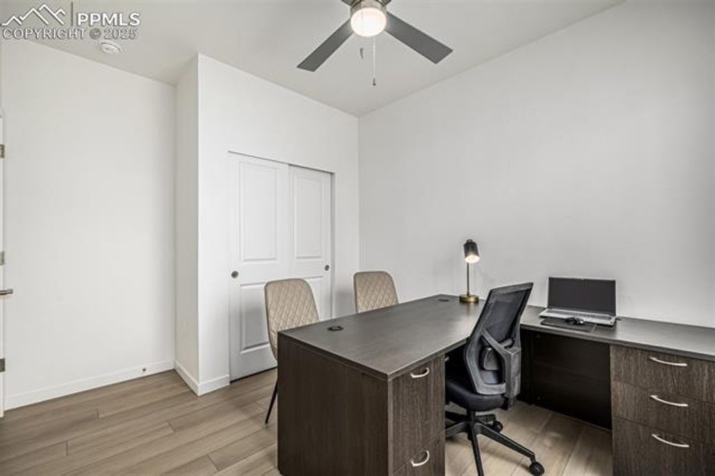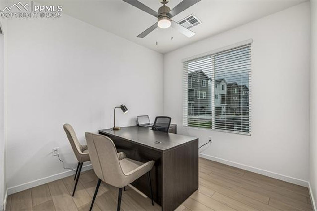 Enjoy low-maintenance living in this premium ground-floor home, perfectly positioned near open green space with easy access to Interquest Parkway, outdoor recreation, and everything Colorado has to offer. This home is move-in ready and features a thoughtfully selected set of elevated standard features. Enjoy Kohler® fixtures, Samsung® appliances (including a washer and dryer), cabinet hardware, a designer backsplash, soft-close cabinetry, and more, all included at no additional cost. The Tymbre floor plan offers a smart, stylish layout with a welcoming entry that leads past a secondary bedroom, full bathroom, and laundry room. The kitchen features abundant cabinetry, a pantry for extra storage, and a central island with seating, flowing effortlessly into the living room and a spacious outdoor patio for relaxing or entertaining. Toward the back of the home, you'll find a second guest bedroom and a well-appointed primary suite complete with a private bathroom, dual vanities, and a large walk-in closet, offering comfort, convenience, and everyday luxury. Located in Colorado Springs' Victory Ridge community, enjoy a connected location with easy access to I-25, shopping, dining, and trails.