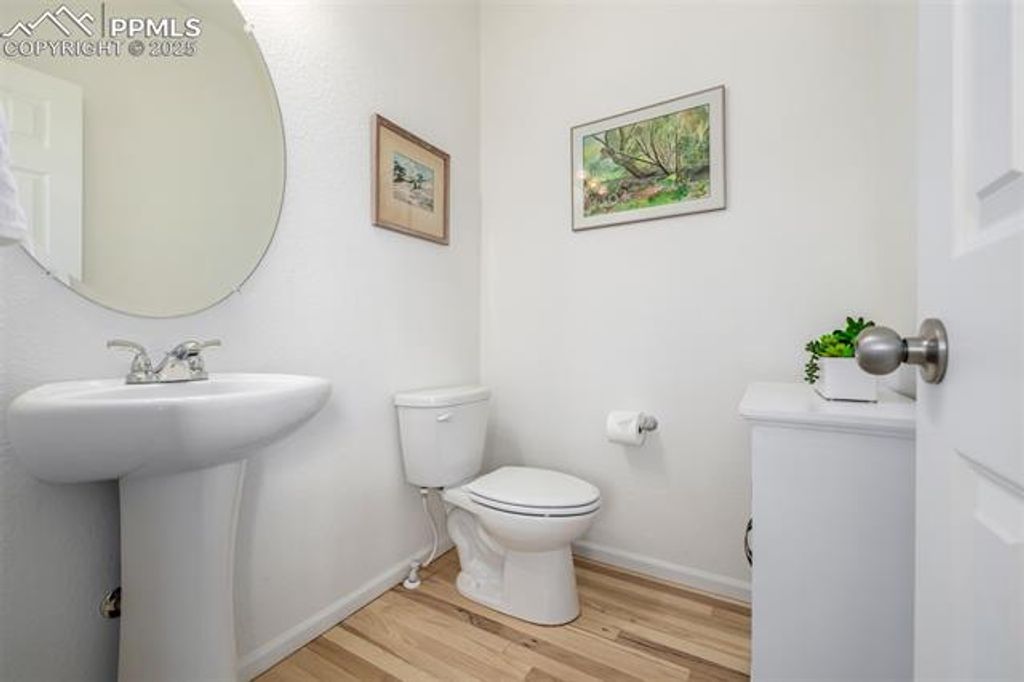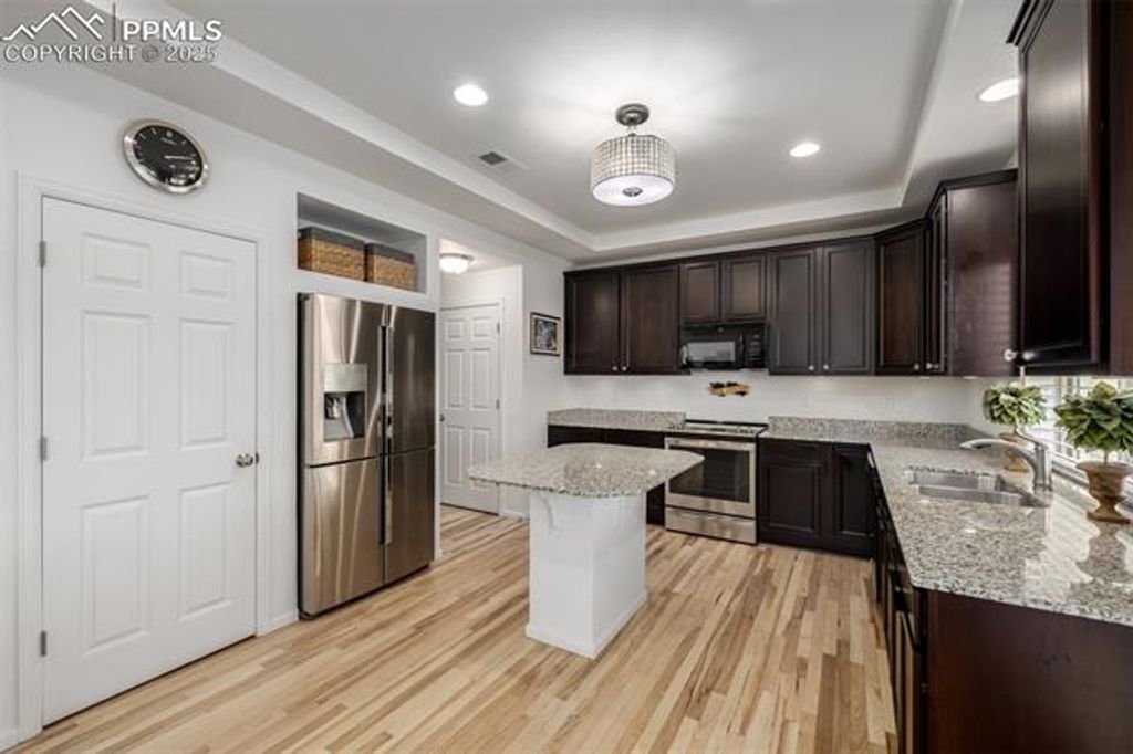 A sense of calm begins at the curb where a petite and charming profile invites a closer look at this well loved residence in the heart of the Banning Lewis Ranch master planned community. Inside, an airy living room unfolds beneath an elegant tray ceiling that adds both height and depth, with recessed lighting that creates a soft and welcoming glow. Chic hardwood flooring stretches across the main level, its timeless character grounding the open layout with warmth and classic appeal. The kitchen becomes the natural centerpiece of daily life, defined by deep espresso cabinetry, graceful granite counters, and stainless steel appliances. The island offers generous prep space while the undermount sink and large pantry elevate the everyday with thoughtful form and function. The nearby dining area opens gracefully to the backyard, creating an easy cadence between indoor and outdoor living. The primary bedroom rises as a serene retreat filled with natural sunlight through oversized windows. Its private ensuite bath adds a comforting sense of ease. Additional bedrooms are arranged with care and capture beautiful mountain views that create a peaceful morning backdrop. Outside, a simple and well designed xeriscaped yard frames a concrete patio that is perfect for quiet mornings or relaxed evenings, all within a community known for its parks, trails, and thoughtful amenities. Move in ready and shaped by approachable charm, this home offers an elevated living experience with mountain views and an inviting sense of place.