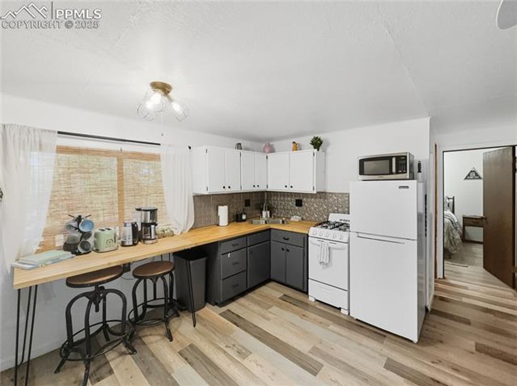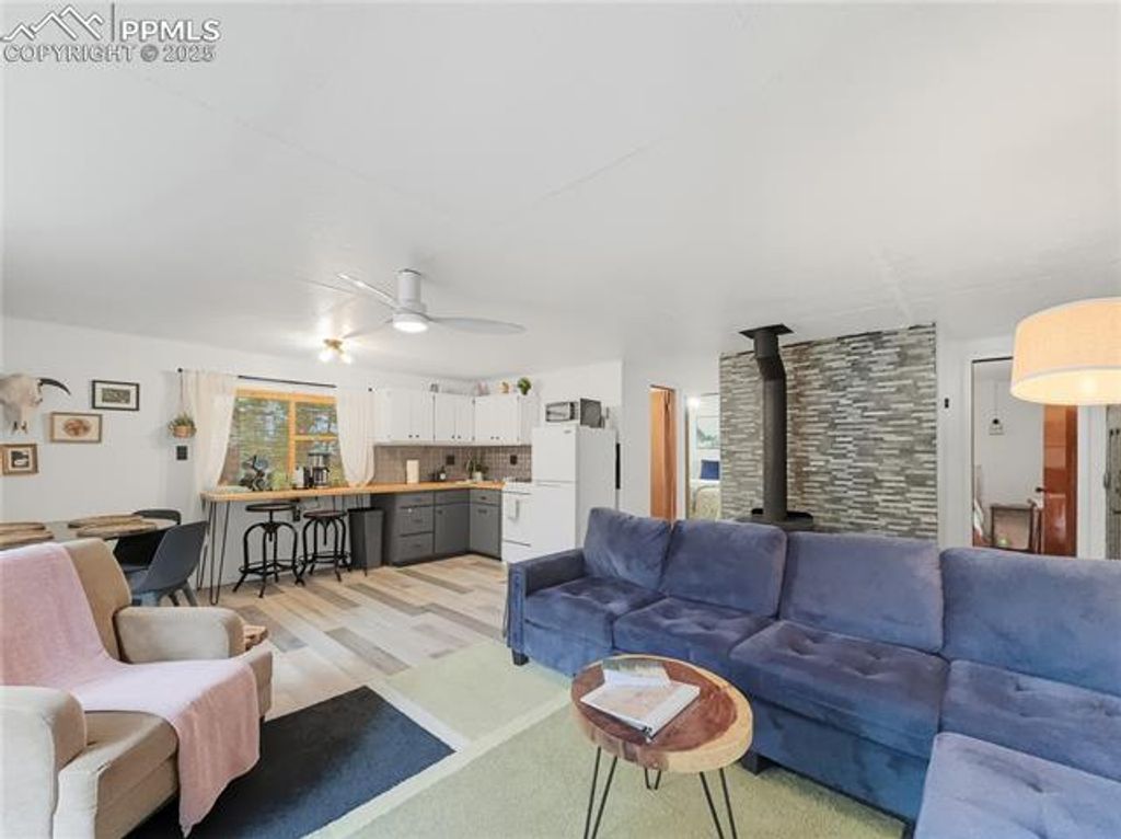 Come see your next cabin in mountains! This turnkey two bedroom, one bathroom property is the perfect getaway. The home enters to an open family room that features beautiful hardwood flooring throughout with plenty of natural light during the day, surrounded by views of the forest. In the evening you can snuggle up next to the wood burning stove after a day of skiing. The full kitchen has plenty of storage and a breakfast bar underneath the window, right next the dining table. Down a short hallway you'll find the bathroom and the primary bedroom. The bathroom features a full sized shower and tub connected to a tankless water heater so you never run out of hot water. The primary bedroom is a cozy place to unwind after a long day after a day of hiking. On the other side of the home, you'll find the secondary bedroom, a great bonus for guests! Both bedrooms feature new flooring and a brand new furnace replaced in 2024. Outside the home, you can spend the afternoon in the hammock on the deck or cooking a meal on the grill. The home has a detached two-car garage to store all of your outdoor gear. This home is the perfect basecamp for all of your mountain adventures or your next investment property! Come see it today!