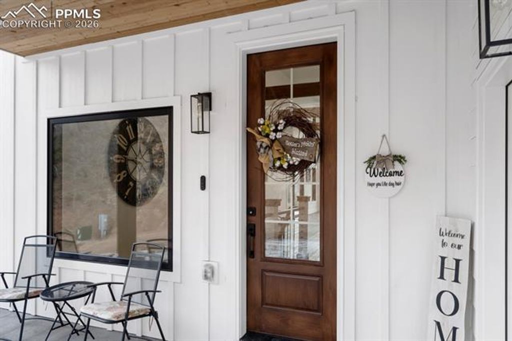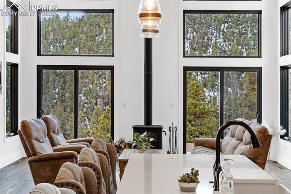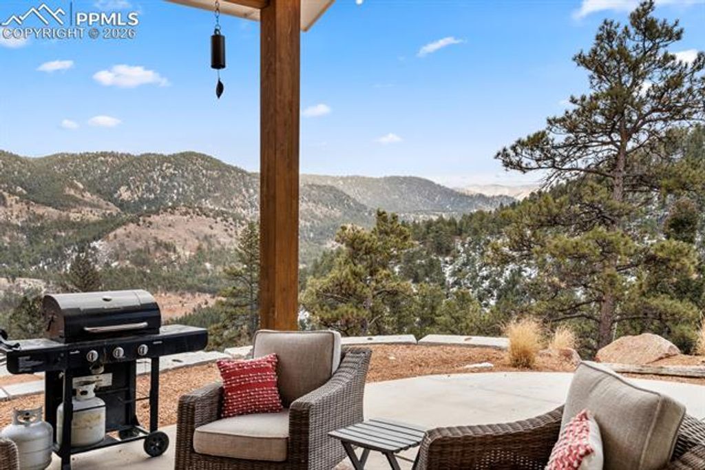 Escape to Peaceful Pines, a newly custom built luxury mountain retreat on 9.19 acres bordering national forest and just 20-25 minutes from downtown Colorado Springs! This secluded, rustic-modern home offers breathtaking views through floor-to-ceiling windows, custom sawblade fir floors, huge rustic beams, and a stunning great room with a wood-burning stove and 16 ft ceilings! The chef's kitchen features Bosch appliances, black hood, quartz countertops, oversized island with integrated sink, custom pecan shelving, pot filler, Sharp pull-out microwave, and a walk-in pantry with custom wood shelving. The main-level primary suite includes a fireplace, sliding doors to the flagstone patio & hot tub, a spa-like bath with heated tile floors, double quartz vanity, designer tile, oversized walk-in shower with rainfall head and quartz bench, and a custom walk-in closet. Additional highlights include: Office with sliding doors to covered patio with tongue-and-groove ceiling, Custom alder wood barn doors throughout, 10 ft ceilings on main level; 9 ft basement ceilings, Dry bar + wet bar hookup, custom low-pile carpet, surround-sound wiring, 20×30 unfinished area ready for additional bedrooms and bathrooms, Oversized 2-car garage (feels like 3-car) with 8 ft doors and has been pre-plumbed for heat, 400 amp service + 200 amp subpanel, as well as a 50 amp RV hookup, Two furnaces, two water heaters, radon system, 1000-gal buried propane tank, Jellyfish lighting, heating cables on north side roof, south-facing driveway, Hardie board siding, concrete window wells, dog run, keypad entry, abundant wildlife, zoned for horses...the list goes on! Located just 2 minutes from Hwy 24. No Airbnb restrictions & currently a short-term rental with perfect ratings. With city conveniences like Amazon delivery and pizza at your doorstep "” yet total privacy with no possibility of neighbors building around you "” this home delivers the best of both worlds and is the perfect Colorado retreat!