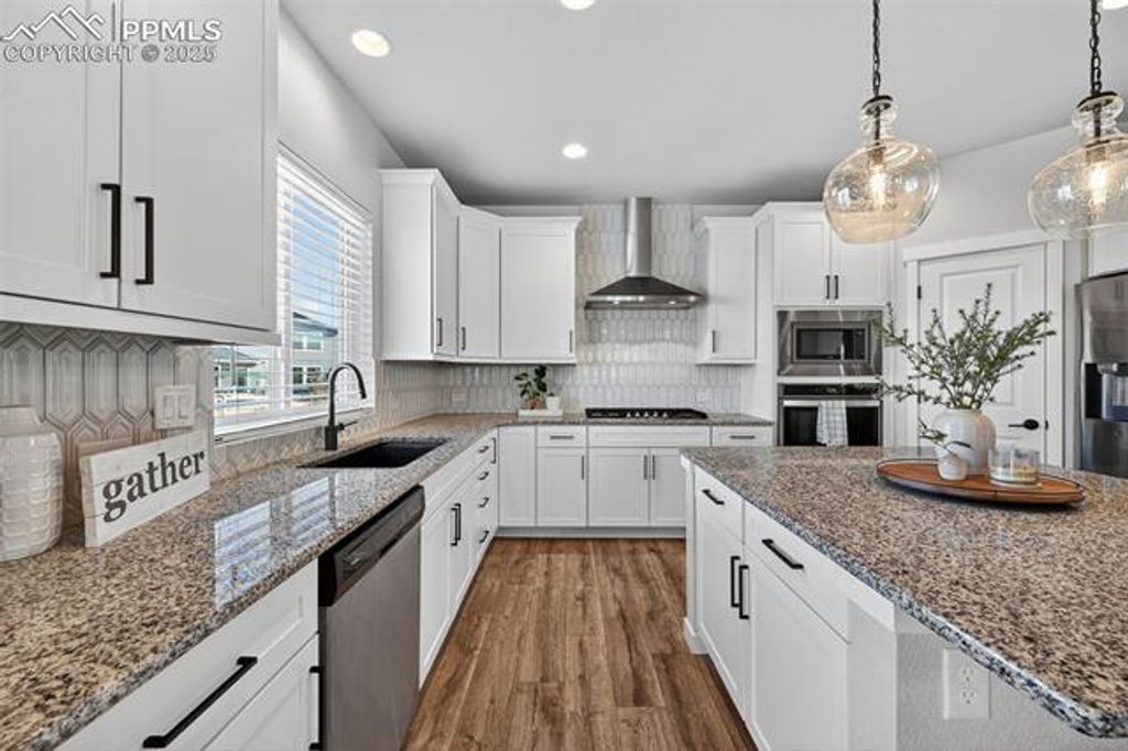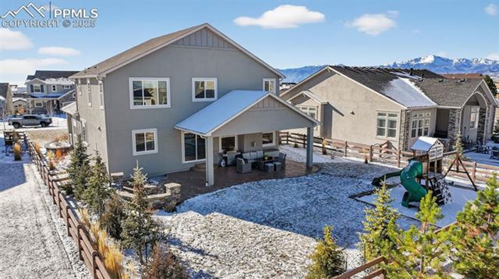 Like new home with many upgrades on a quiet cul-de-sac! This gorgeous home has been lovingly upgraded and maintained and it shows! Enter from the covered porch to a beautiful focus wall and seating bench! Wide hallways and tall ceilings give a spacious feel to this wonderful floor plan! The front office being used as a sitting room has carpet and French doors! The dining area has another custom focus wall and luxury vinyl plank flooring! Your gourmet kitchen has gas range and stainless steel hood, tile backsplash, granite counters, upgraded lighting and center island! Your eating area in the kitchen has more luxury vinyl plank flooring and custom lighting as well as a walk out to the extended and covered stamped concrete patio with built in fire pit and included back yard play set - your own private park! The kitchen opens up to the spacious family room with cozy fireplace! Upstairs you will find four large bedrooms! The private master retreat has coffered ceilings and room for all your large furniture! Your spa like on suite bath has quartz counters, a huge shower, deco tiling, large linen closet and walk in closet! The upstairs laundry room has two windows, built in cabinets and peek-a-boo views to Black Forest! The custom finished basement has a modern tile fireplace, an amazing wet bar with black granite counters, space for entertaining and two more large bedrooms! The basement bath is upgraded with tile behind the mirrors, upgraded lighting and gold faucets. Even the window wells have been upgraded! Fully finished garage as well! Walking distance to the Wolf Ranch lake and to-be-built community center! D20 schools and close to shopping! Blinds throughout out are upgraded, many are remote controlled. Permanent outdoor home lighting for easy holiday lights!