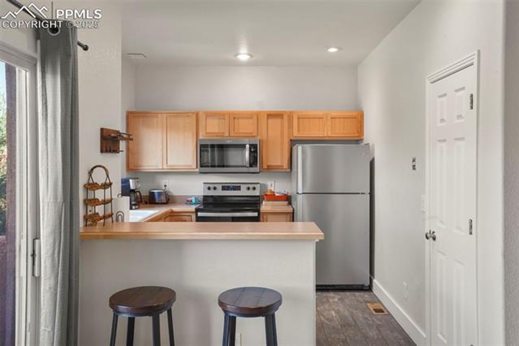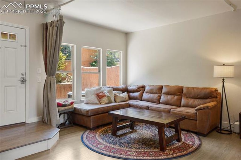 Well-maintained, two-bedroom, three bathroom condo conveniently located in Manitou Springs! Enjoy the Garden of the Gods views from the elevated deck after taking a dip in the pool. Carpet-free living. Nice, clean kitchen with a view and a pantry. Brand new stainless steel appliances. There are sliding glass doors onto the deck, from the dining room. Plenty of natural light and a gas fireplace in the living room. Both bedrooms have private bathrooms. Laundry is located upstairs, by the bedrooms. Extra tall ceilings throughout. Central air conditioning. Private, front courtyard. Two-car garage. Easy walk to the schools, shopping and Manitou's trail system!
