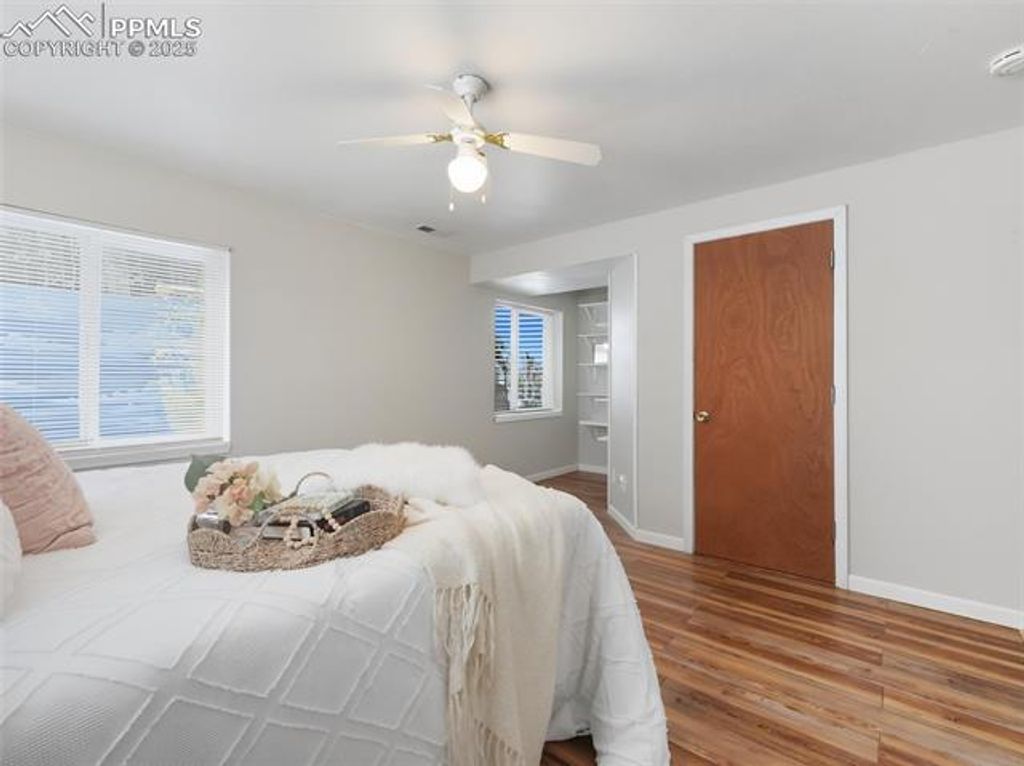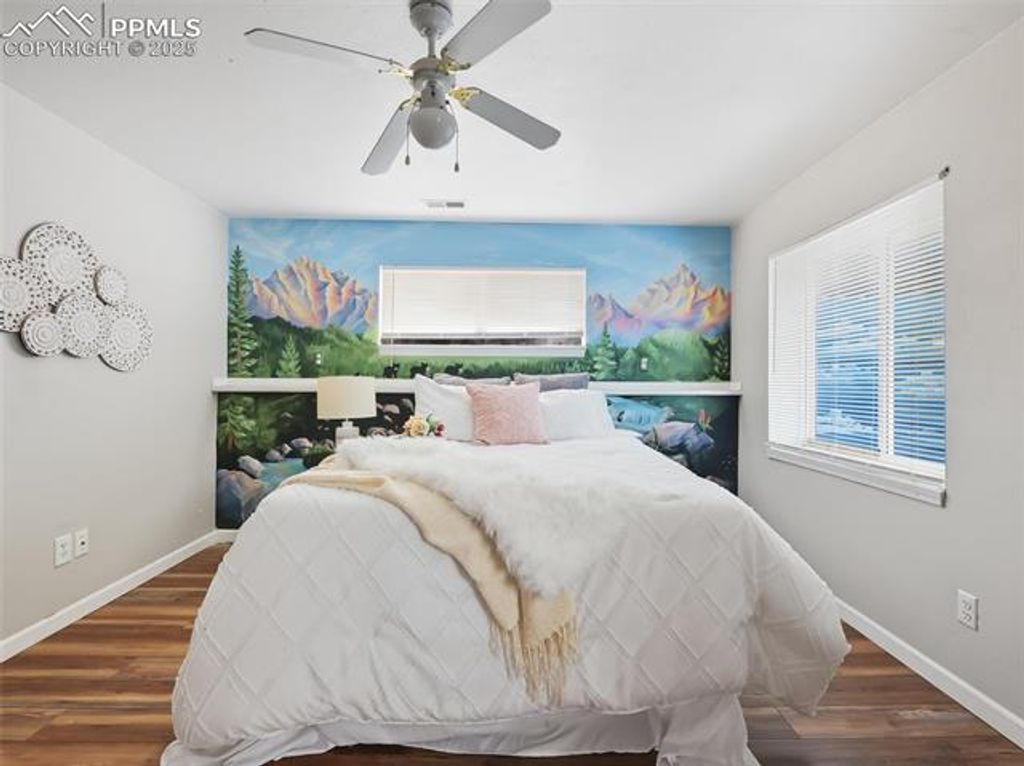 Welcome to this charming 3 bedroom, 2 bathroom home with a 2 car garage, offering comfort, style, and a fantastic location. Two of the bedrooms are exceptionally spacious with one on the main level and one in the basement, giving you plenty of flexibility. The primary suite downstairs features a stunning custom mural that makes the space truly unique. The kitchen is functional and well laid out with granite countertops, stainless steel appliances, and a wider pantry that provides extra storage space. The only carpet in the home is located on the stairs while the rest of the house features beautiful hard surface flooring throughout. French doors off the dining area open to a low maintenance composite deck, perfect for entertaining or relaxing. Central air conditioning was added in 2022 for year round comfort. Located just a 2 minute walk from Pike Park, this home also offers quick access to local restaurants, shopping, and I-25, making your commute and daily errands a breeze.
