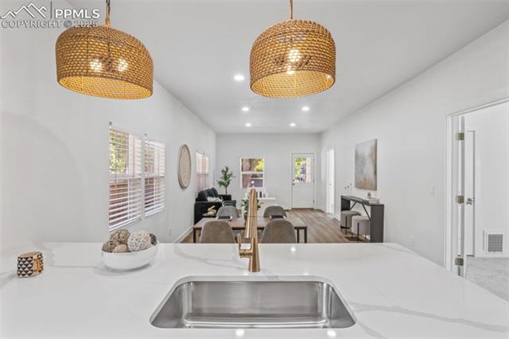 Step inside this stunning home and fall in love with the open floor plan featuring a spacious living room, dining area, and a beautifully updated kitchen. The kitchen is the heart of the home with brand-new cabinets, countertops, appliances, and a large eat-in island that is perfect for entertaining or everyday living. A convenient storage room just off the kitchen doubles as a walk-in pantry or extra storage space. The private primary suite offers double closets and a sleek, modern bathroom. Two additional bedrooms share a stylish Jack-and-Jill bath, making this layout ideal for family or guests. Enjoy Colorado living outdoors with a covered front patio shaded by mature trees and a fully landscaped backyard complete with a new fence and storage shed. You can relax knowing this home has been remodeled the right way, with updates to the roof, siding, windows, doors, electrical, furnace, plumbing, sewer line, paint, flooring, trim, and more. Conveniently located near downtown, I-25, and Colorado College!