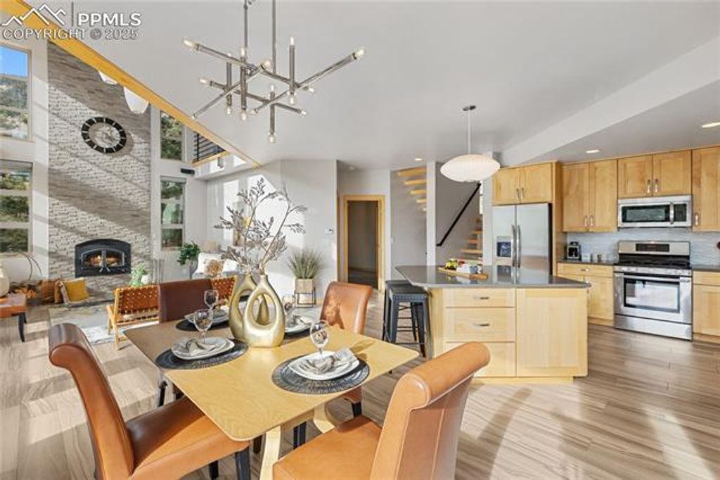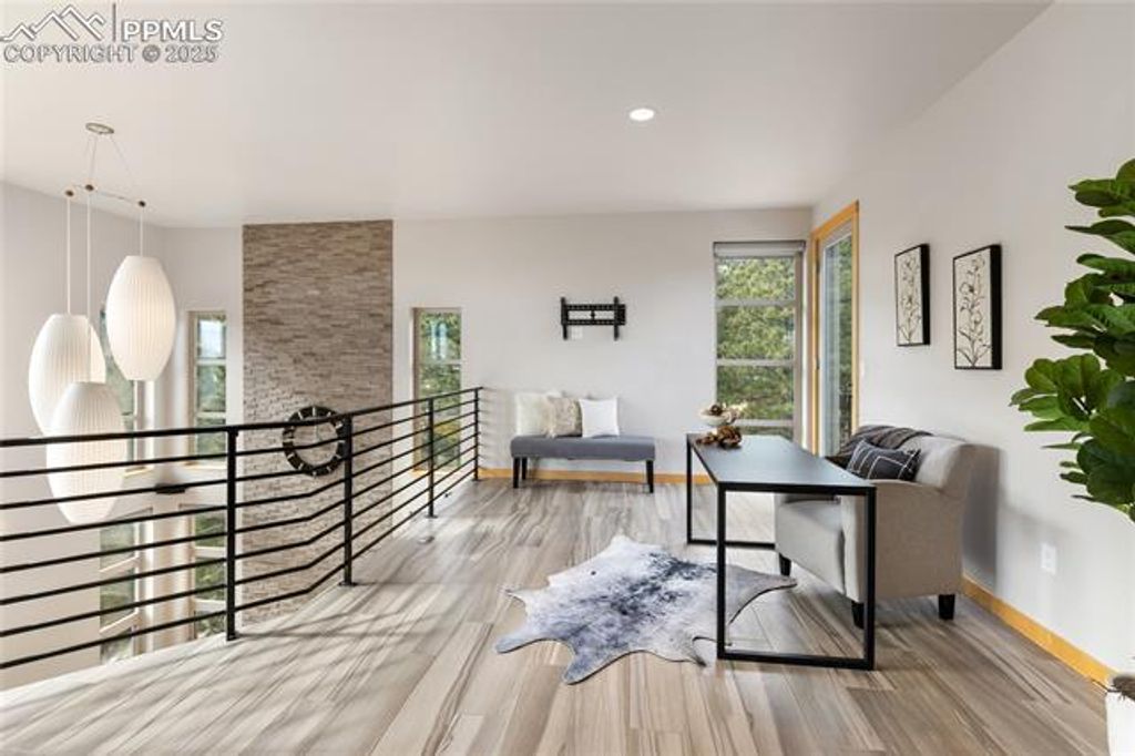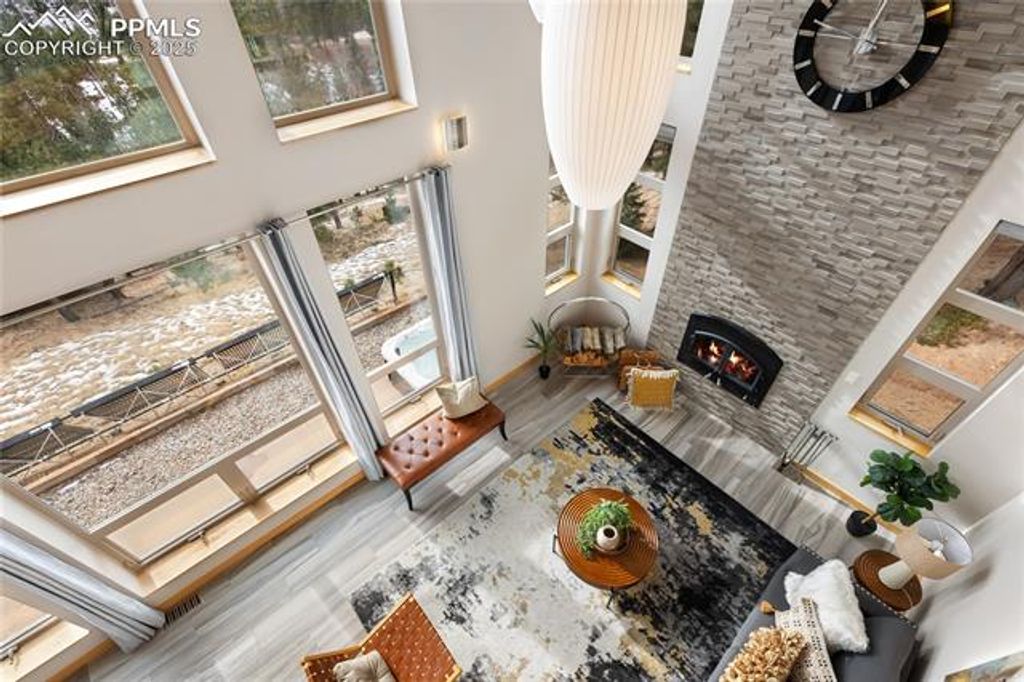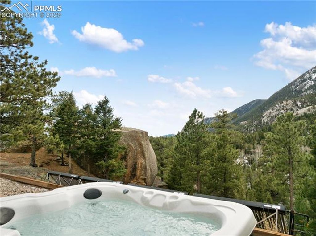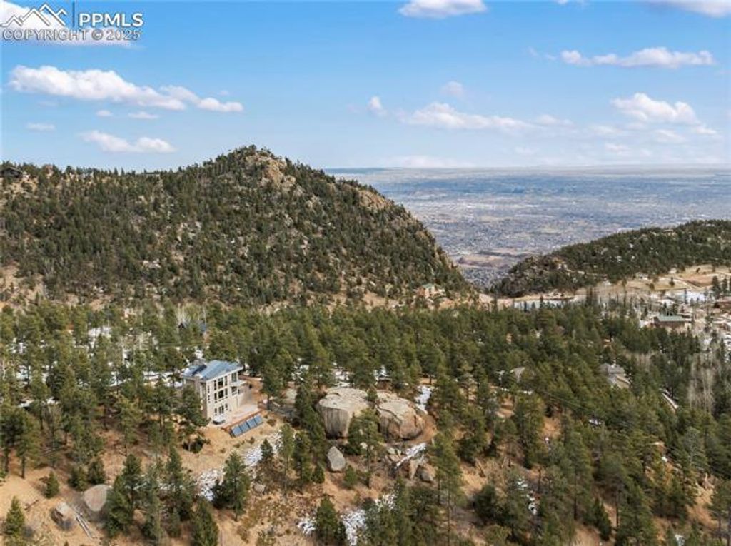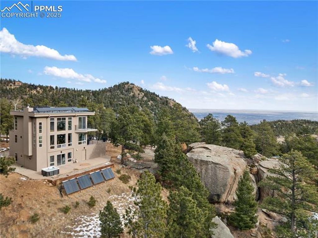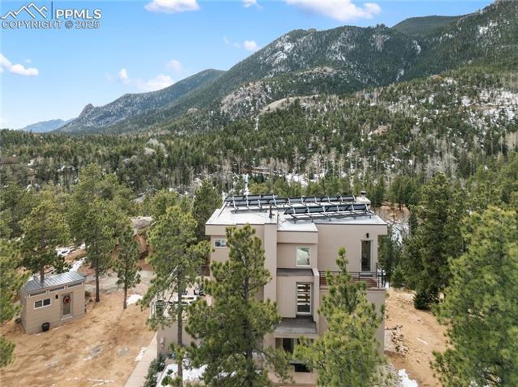 Perched high in the mountains where the sky feels closer and the noise fades away, this modern mountain sanctuary is the definition of elevated Colorado living. Thoughtfully designed to blend luxury, sustainability, and jaw-dropping natural beauty, this home delivers a lifestyle that feels both indulgent and intentional. From the moment you step inside, panoramic views steal the show"”framed by a dramatic 19-foot wall of windows that floods the open main level with light and mountain majesty. High-end maple cabinetry, doors, and refinished cascading natural pine stairs, flow seamlessly throughout the home, paired with quartz countertops and LG stainless steel appliances that anchor the kitchen in both style and function. Step outside to the expansive main-level concrete deck, perfectly positioned for entertaining, sunsets, and star-filled evenings. The upper-level primary retreat is nothing short of spectacular, featuring three private terraces with 360-degree views of the Western Rockies and Southern Colorado. A spa-inspired bath with a deep Jacuzzi tub, walk-in closet, and convenient laundry completes this luxurious escape. Built for year-round comfort with warm radiant floors and complete energy efficiency, this home is truly ahead of its time"”producing as much energy as it consumes. State-of-the-art solar, an advanced air-exchange system, EPA-certified Heatilator fireplace, superior insulation, and airtight Milgard windows ensure it stays cool in summer, warm in winter, and efficient always. Located in Crystal Park, a private gated community spanning 2,000 wooded acres, residents enjoy trails, creeks, springs, wildlife, a stocked trout pond, clubhouse with pool, and full HOA services"”including road maintenance, snow plowing, security, and more. All this, just 15 minutes from Manitou Springs and 30 minutes from downtown Colorado Springs. This isn't just a home"”it's a self-sustaining mountain lifestyle with front-row views of Pikes Peak.