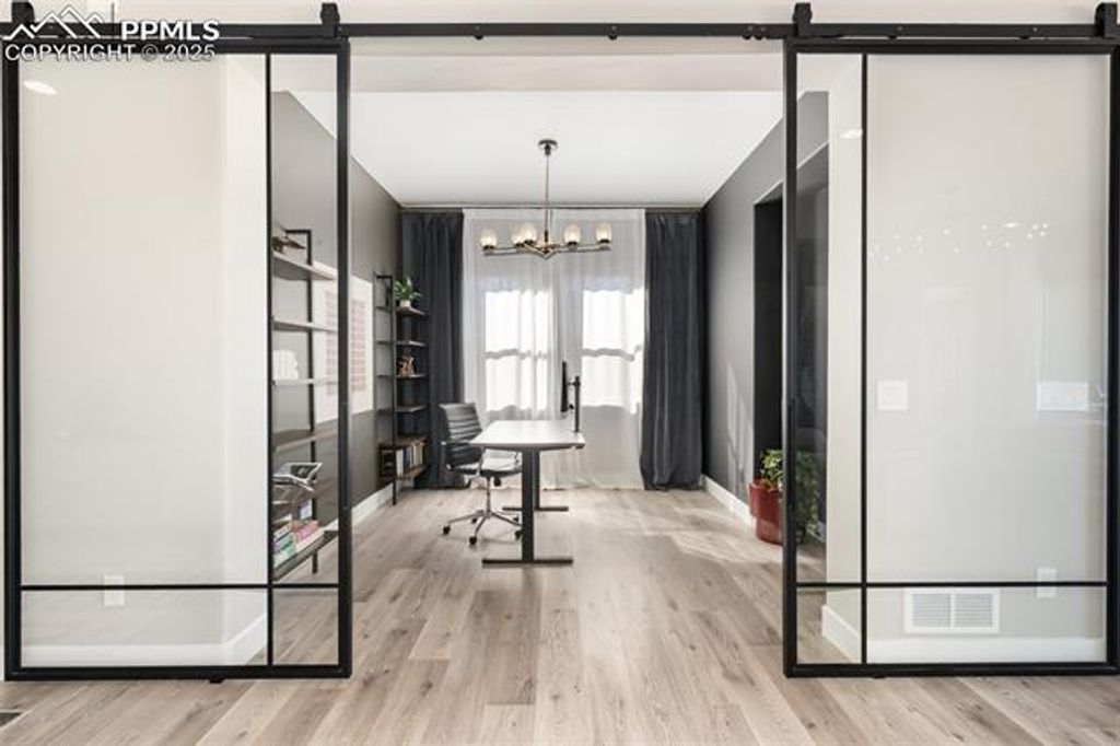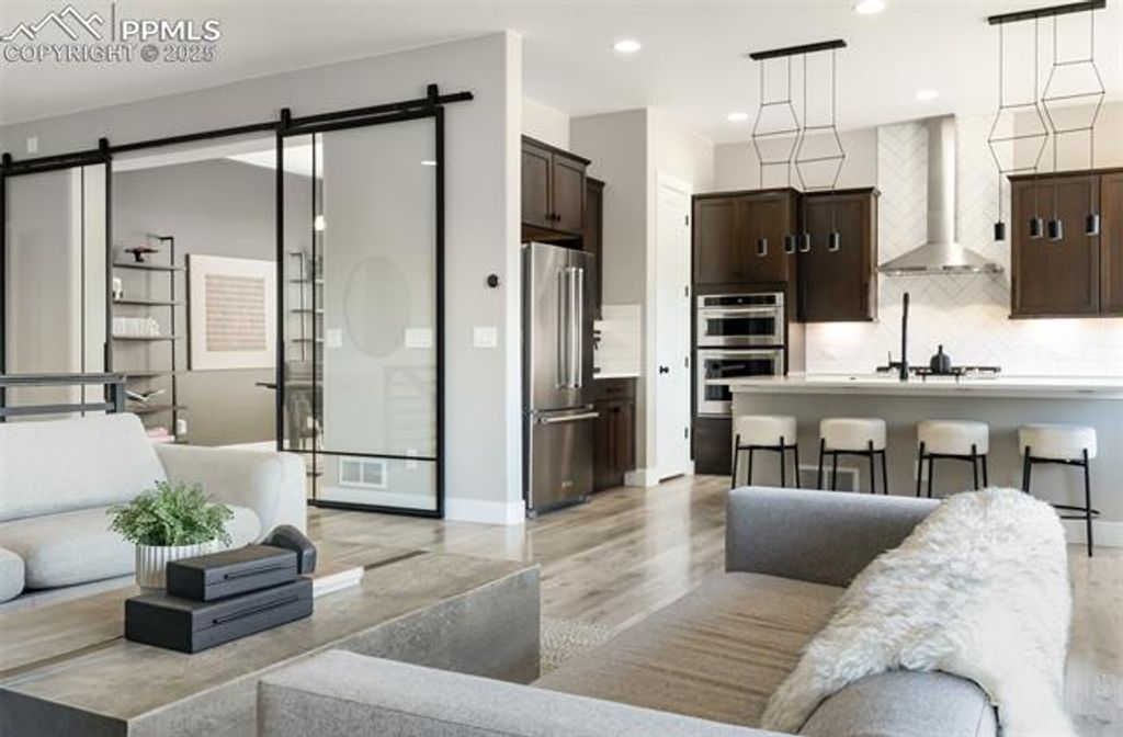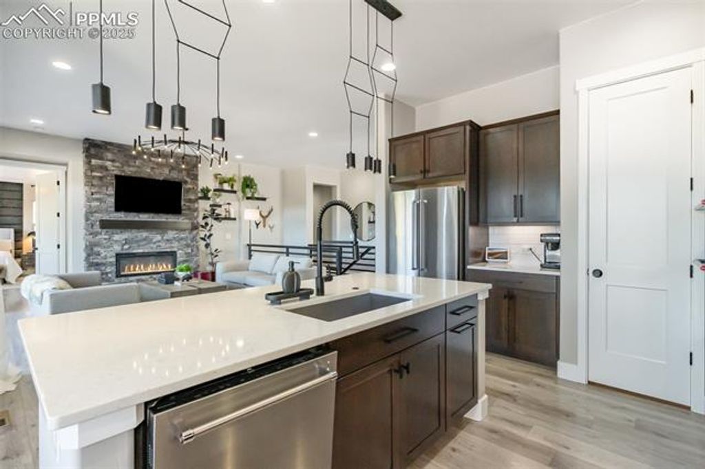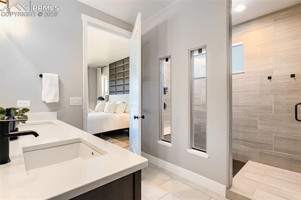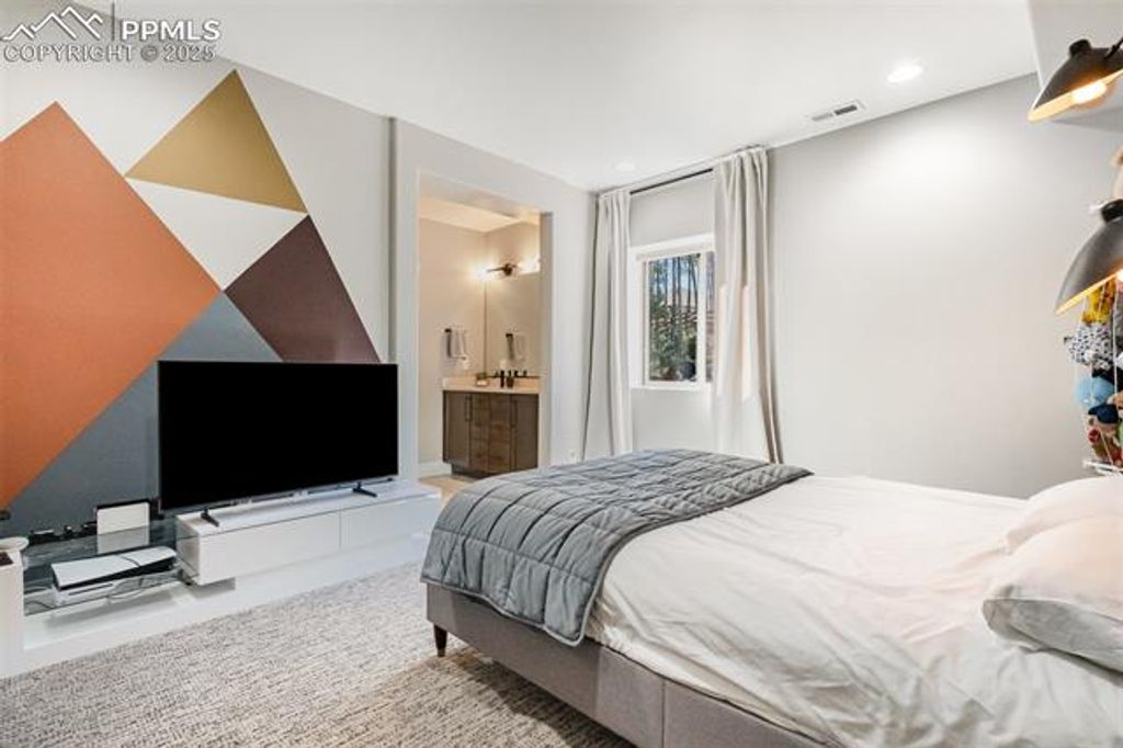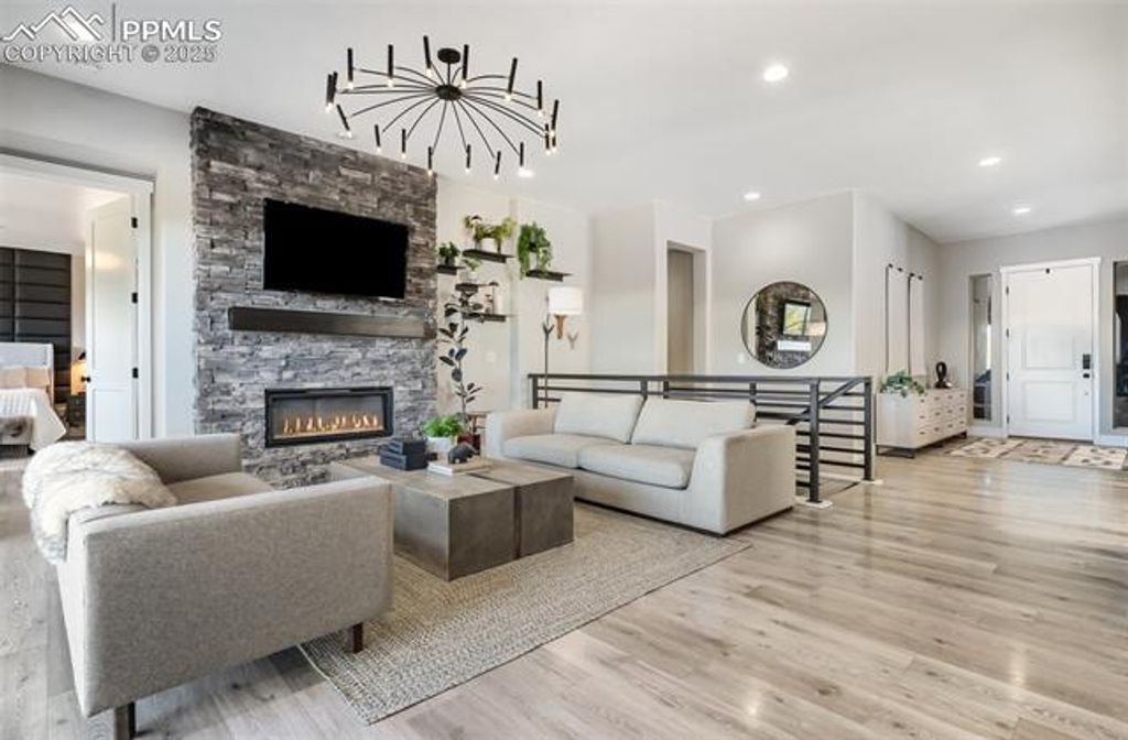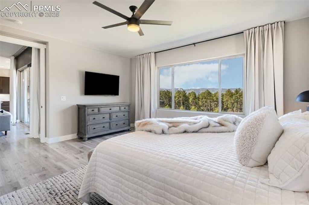 Welcome to one of the most coveted lots in the prestigious Sanctuary Pointe community"”where luxury meets nature in breathtaking harmony. Perched above open space and scenic trails with unobstructed views of Pikes Peak, this expanded Classic Paradise model is a masterclass in refined Colorado living! Versatile layout with the master on the main floor and Junior suite in basement, ideal for guests or multi-generational living! Hand-troweled walls, tall baseboards, and chic black-accented finishes throughout. Custom glass slider doors in dining/study for flexible use. Modern railing, designer light fixtures, and gorgeous contemporary fireplace! The fantastic kitchen features cherry cabinetry, quartz countertops, pantry and KitchenAid appliances! Serene Master retreat with views of Pikes Peak and soothing waterfall sounds from neighboring water feature and walkout to large composite deck! Laundry room conveniently located on main! TV hookups in all bedrooms and walk-in closets for optimal organization. Basement features 9-foot ceilings and walk-out access to covered patio with hot tub! Wet bar with full-size fridge, dishwasher space, and custom barn door shelving. Custom carpet, organized closet space, and radon mitigation system. Custom landscaping with split rail fencing, extended patio and fire pit! Trail system directly across the street and regular snow plowing for convenience Located along the AFA flight path"”enjoy thrilling Thunderbird flyovers! Vibrant neighborhood with food trucks, soccer games, hiking, clubs, and seasonal picnics. Close proximity to Fox Run trails and natural beauty This home is a rare blend of style, serenity, and sophistication"”offering privacy, versatility, and modern luxury in one of Colorado's most desirable enclaves. Whether you're hosting under the stars or enjoying quiet mornings with mountain views, this Sanctuary Pointe gem is truly a dream come true and waiting for you!