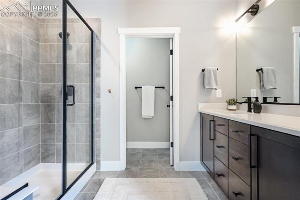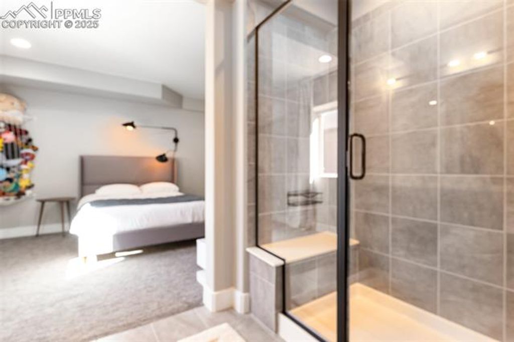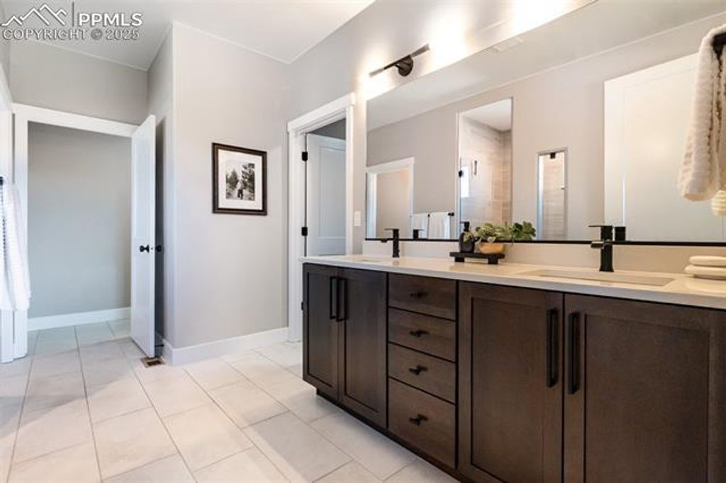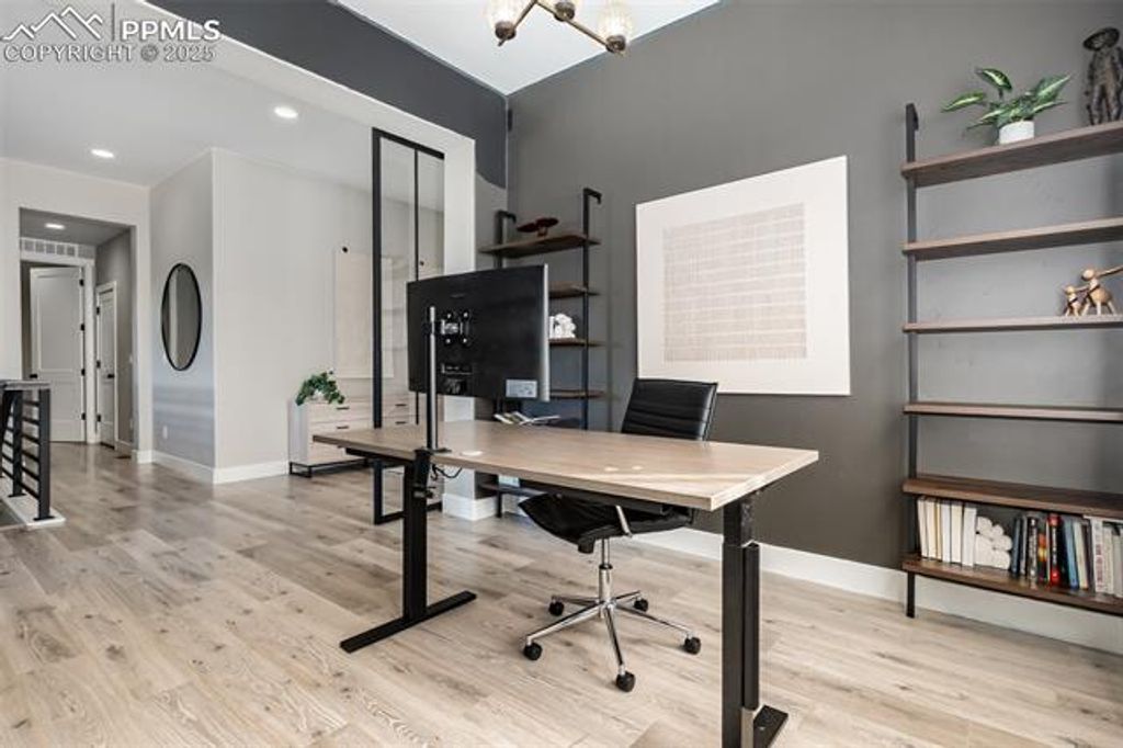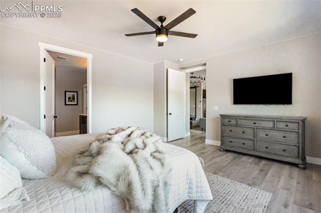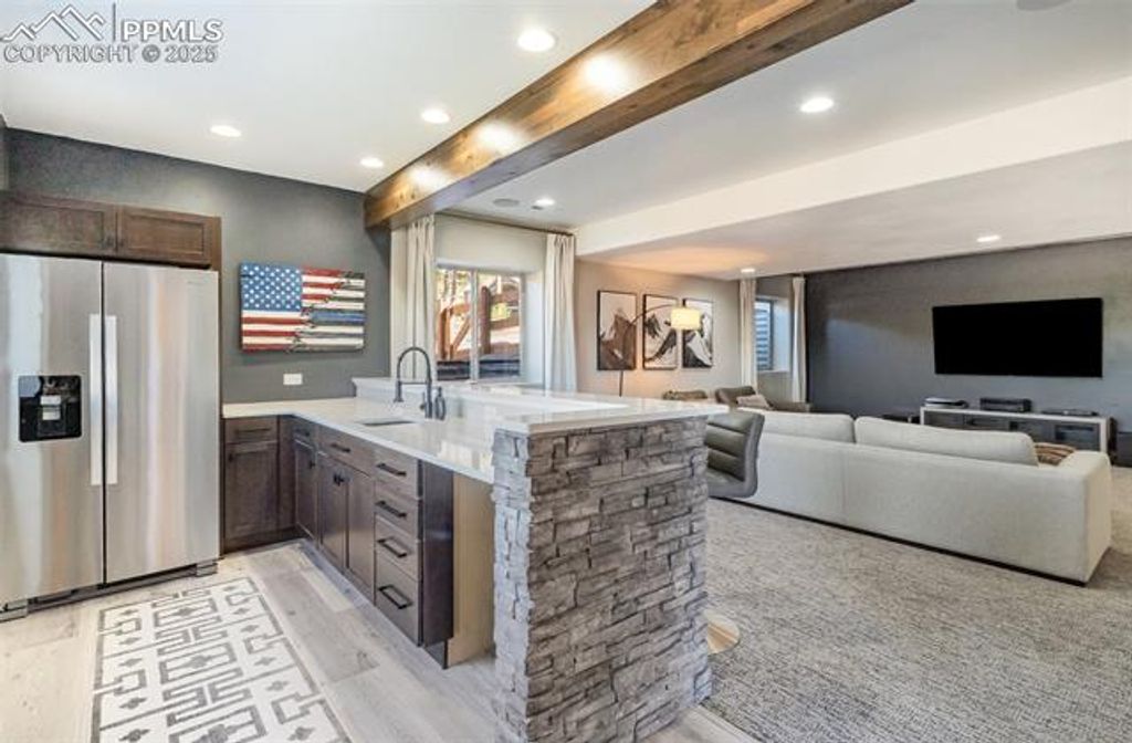 Welcome to one of the most coveted lots in the prestigious Sanctuary Pointe community"”where luxury meets nature in breathtaking harmony. Perched above open space and scenic trails with unobstructed views of Pikes Peak, this expanded Classic Paradise model is a masterclass in refined Colorado living! Versatile layout with the master on the main floor and Junior suite in basement, ideal for guests or multi-generational living! Hand-troweled walls, tall baseboards, and chic black-accented finishes throughout. Custom glass slider doors in dining/study for flexible use. Modern railing, designer light fixtures, and gorgeous contemporary fireplace! The fantastic kitchen features cherry cabinetry, quartz countertops, pantry and KitchenAid appliances! Serene Master retreat with views of Pikes Peak and soothing waterfall sounds from neighboring water feature and walkout to large composite deck! Laundry room conveniently located on main! TV hookups in all bedrooms and walk-in closets for optimal organization. Basement features 9-foot ceilings and walk-out access to covered patio with hot tub! Wet bar with full-size fridge, dishwasher space, and custom barn door shelving. Custom carpet, organized closet space, and radon mitigation system. Custom landscaping with split rail fencing, extended patio and fire pit! Trail system directly across the street and regular snow plowing for convenience Located along the AFA flight path"”enjoy thrilling Thunderbird flyovers! Vibrant neighborhood with food trucks, soccer games, hiking, clubs, and seasonal picnics. Close proximity to Fox Run trails and natural beauty This home is a rare blend of style, serenity, and sophistication"”offering privacy, versatility, and modern luxury in one of Colorado's most desirable enclaves. Whether you're hosting under the stars or enjoying quiet mornings with mountain views, this Sanctuary Pointe gem is truly a dream come true and waiting for you!
