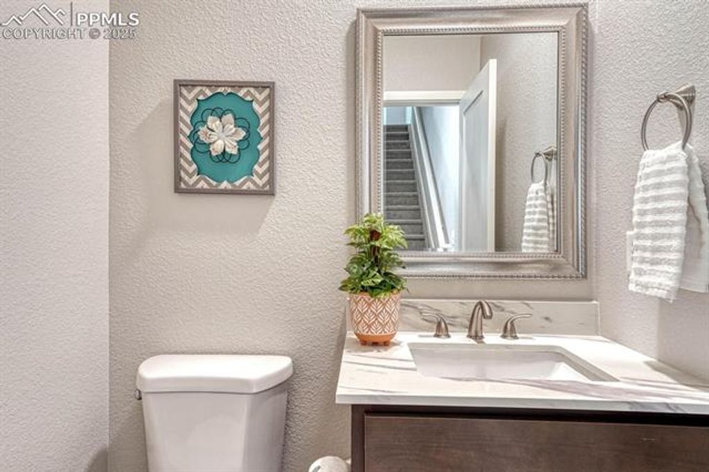 145 and 155 Terrace Drive! Modern exterior elevation welcomes you into this two-story with 3 bedrooms, 4 bathrooms, a 2 car garage, and a full finished basement in each unit! Featuring nine-foot ceilings on both the main and upper levels, the home includes central air conditioning, tankless water heater. Move-In Ready! Main level standard features include beautiful and long-lasting luxury vinyl floor and generous can lighting placement, with a gas fireplace in the living room and sliding door to the back yard from the dining room. Luxurious island, quartz counters, shaker style cabinets, and custom full tile backsplash will accentuate the kitchen along with stainless steel appliances, extended height 42 inch upper cabinetry, and pantry. The powder room competes the main level. Owner's suite upstairs offer both a walk-in closet plus a second closet, and an attached bathroom with double sinks and a walk-in shower. You'll catch some nice mountain views from the primary bedroom too! Second owner's suite includes a walk-in closet and ensuite bathroom with double vanity and walk-in shower. Laundry is upstairs with the two bedrooms. The basement is finished with one bathroom, one bedroom, a wet bar, and rec room. Today's Terrace at Creekwalk is convenient to I-25, Hwy 115, and a wide array of the newest shopping, dining and more exciting nearby amenities. This is an HOA-free community! Move-In ready!