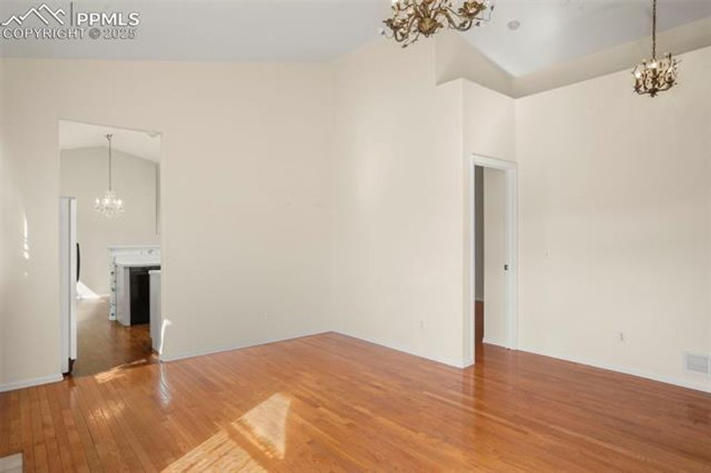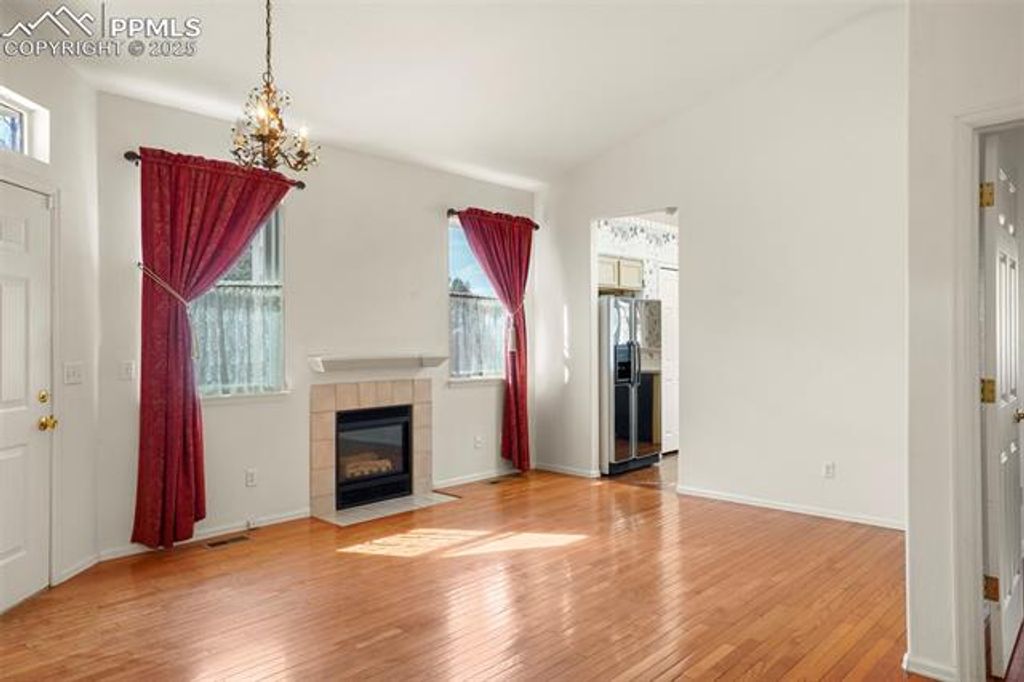 Enjoy effortless living in this charming 3-bedroom end unit condo featuring breathtaking mountain views and abundant natural light throughout. The private primary suite offers a spacious walk-in closet, creating a true retreat. Warm wood floors and a cozy fireplace enhance the inviting living room, while beautiful chandeliers add a touch of elegance throughout the home. The separate dining area is conveniently located off the kitchen and opens to a private paver patio, perfect for morning coffee or evening relaxation. The oversized garage provides ample storage, and the gated community adds an extra layer of security. Ideally situated near shopping and with easy access to Fort Carson, this home is the perfect blend of comfort, style, and convenience.