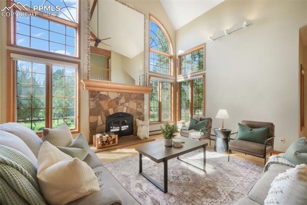 Nestled among the trees in Monument's Shiloh Pines, this meticulously maintained two story home sits on 2.62 treed acres with exceptional fire mitigation. Designed with main level living in mind, the property provides both convenience and functionality. The main level is welcoming with a spacious kitchen featuring real wood cabinetry, stone counters, newer Bosch stainless steel appliances (transferrable warranty), gas range, breakfast bar, island, and an eat in area. Multiple living areas, each anchored by a cozy fireplace, offer plenty of elbow room. The dining room, office (or nursery), two conveniently located powder rooms, and a laundry room with access to both the backyard and garage are wonderful aspects of this incredible floor plan. The primary suite has a sitting area, fireplace, 5 piece bathroom, walk in closet, AC split for personalized comfort and private deck. Upstairs, you'll find a full bathroom and three generously sized bedrooms, one with an attached flex space. The finished garden level basement adds even more versatility with a bedroom, bathroom, flex space, second living room, and a kitchenette, perfect for extended family, guests, or rental potential. Step outside onto the composite deck, installed in 2023, and take in the peaceful, private surroundings. The exterior has been meticulously cared for with newer 6" gutters, fresh stucco treatment, and a heated driveway drain to help with ice melt and proper drainage in the winter months. A fenced yard area makes life easy for pet owners, while a large storage shed and oversized two car attached garage provide ample room for all your essentials. Car enthusiasts and hobbyists alike will love the four car detached garage, currently featuring a separation wall for workshop use that can be removed for full garage space. Additional upgrades include a new septic system and leach field and a QuietCool system, which provides unparalleled whole house cooling in minutes while keeping energy costs low.