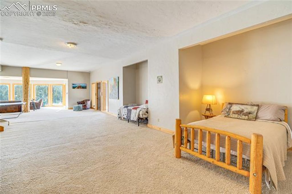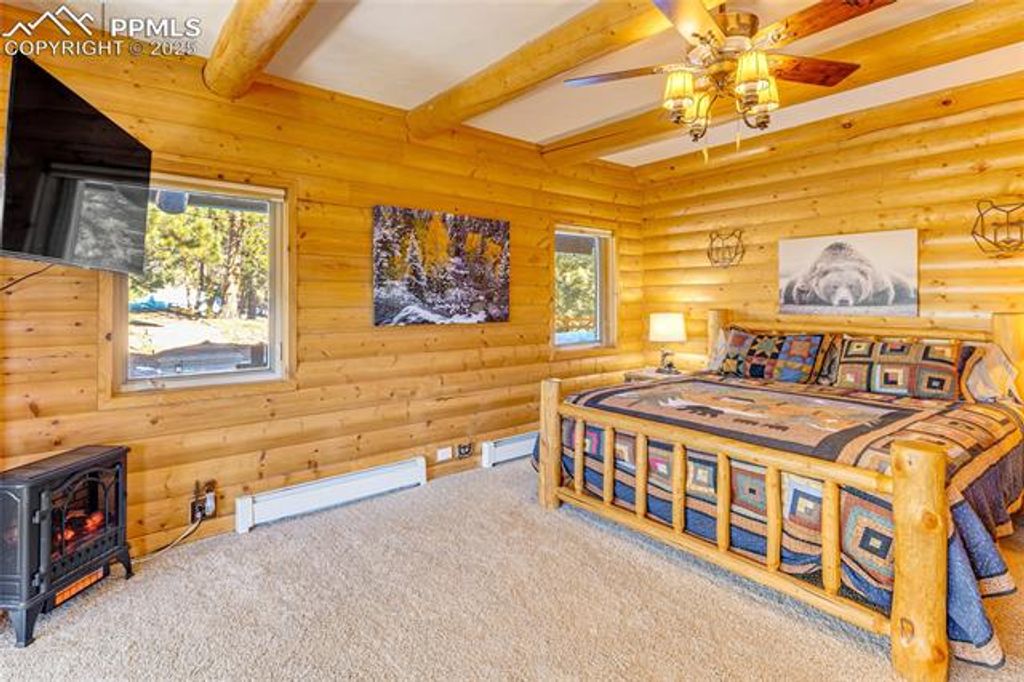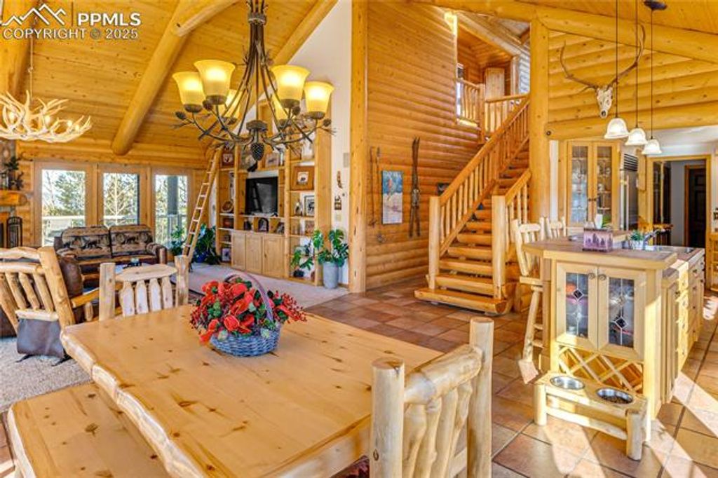 Amazing, custom mountain log home, overlooking your own personal pond w/water rights! This is a turnkey property, set-up as a successful short term rental business! 12 inch log construction, open beams & soaring great room floor plan. Living area boasts soaring beamed ceilings, & a wood-burning fireplace w/ log mantle. Great room is adjacent to an incredible sunken, sunroom, overlooking the large pond! Commercial kitchen equipped w/ Subzero refrigerator, new commercial Zline 6 burner gas stove/oven w/ griddle & commercial hood, beverage refrigerator; counter-bar island seating. Main level master suite, w/ walkout to the deck, attached 5 pc. bath, new walk-in custom shower, plus a claw foot tub. New interior paint, light fixtures, fans, new boiler system, & exterior stain recently completed. Main level laundry, mud room, & 3 car oversized garage. 2 upper level bedrooms nicely appointed, one of the guest rooms has it's own 1/2 bath attached. Upper level addt'l 5 pc. guest bathroom available on this level. Expansive lower level w/ rec room area, + large family room, walkout to the lower patios & new hot tub. 2 large storage rooms also complete this level. Windows surround this room making this a wonderful entertaining area. Perimeter decks include tempered glass panels never obstructing views while picnicking outdoors! Paver stone patios, walkways, paths & garage apron; outdoor fire-pit, gazebo picnic area, trails & hiking throughout the parcel! Property INCLUDES the WATER RIGHTS from the spring fed pond, multiple water feature ponds plumbed for the enjoyment of the sounds of trickling water! Outdoor entertaining is key to this home! South and Western exposure, making solar gain a key aspect in this comfortable home, which also includes hot water in floor & baseboard heating. Located only 10 minutes from Divide and 20 minutes to Woodland Park. Just 1.5 hrs from snow skiing, 30 minutes from trophy trout fisheries, and Mueller State Wildlife Park is just one ridge away!