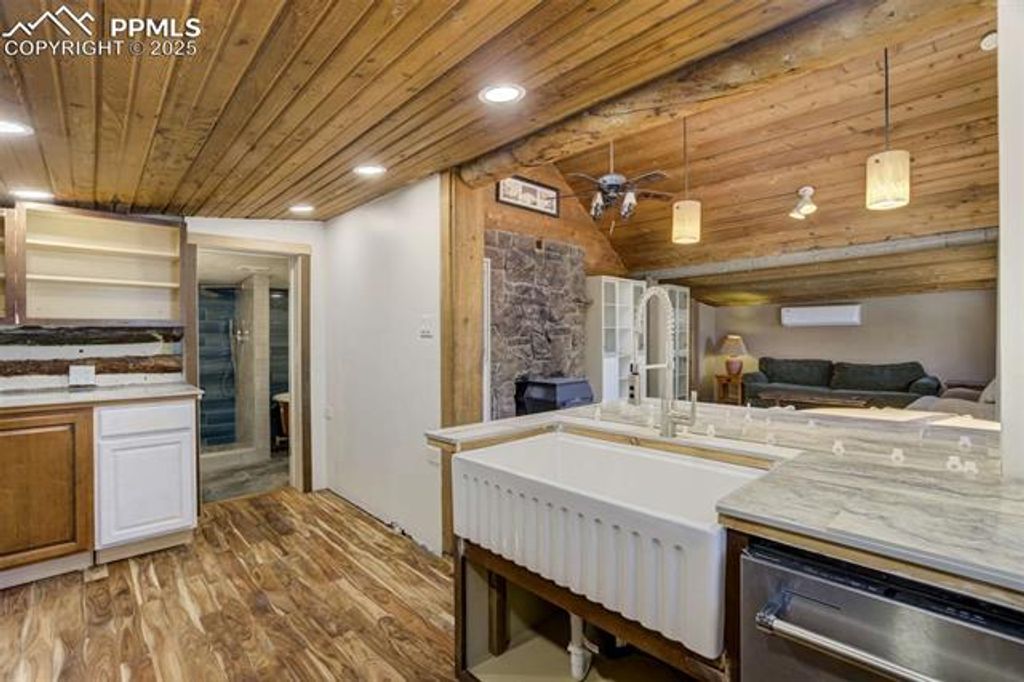 Nestled among the trees in the heart of Cheyenne Canyon, this charming 2-bedroom, 1-bathroom log cabin offers a rare blend of rustic character and tranquil living. Set on a beautifully treed lot with the soothing sounds of a nearby creek, this home invites you to unwind and connect with nature. Step inside to find a cozy living room featuring vaulted ceilings, skylights, concrete floors, exposed log beams, and a wood-burning fireplace"”perfect for chilly Colorado evenings. The partially renovated kitchen includes a new gas stove/oven and provides a solid foundation for your own personal updates. The primary bedroom offers a unique bonus space that can serve as a sitting area, office nook, or walk-in closet. The second bedroom is truly a treehouse-style sanctuary, surrounded by windows on three sides for a 260-degree view of the natural beauty outside and abundant natural light throughout the day. The updated bathroom features a dual vanity, newly tiled walk-in shower, a classic clawfoot tub, and built-in storage for linens. Additional highlights include: mini-split A/C system for year-round comfort, covered carport that doubles as a workshop area, private neighborhood access to hiking trails, close proximity to Helen Hunt Falls, Seven Bridges, North Cheyenne Cañon Park, and outdoor recreation opportunities galore. Whether you're looking for a full-time residence, a peaceful weekend getaway, or an investment with charm and character, this property offers endless potential to make it your own mountain retreat.