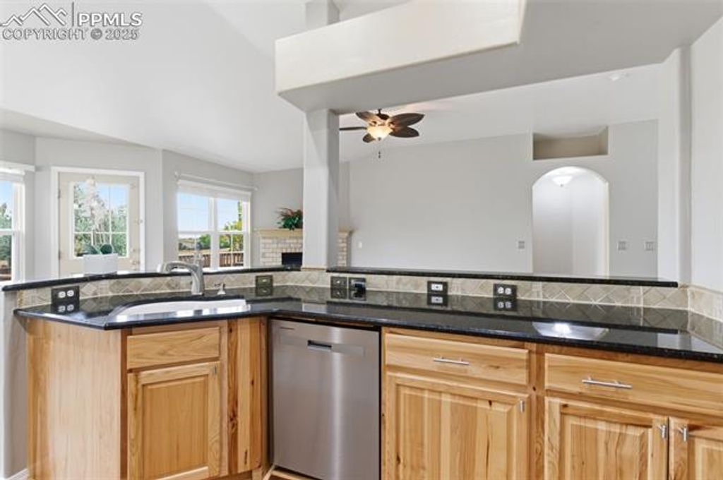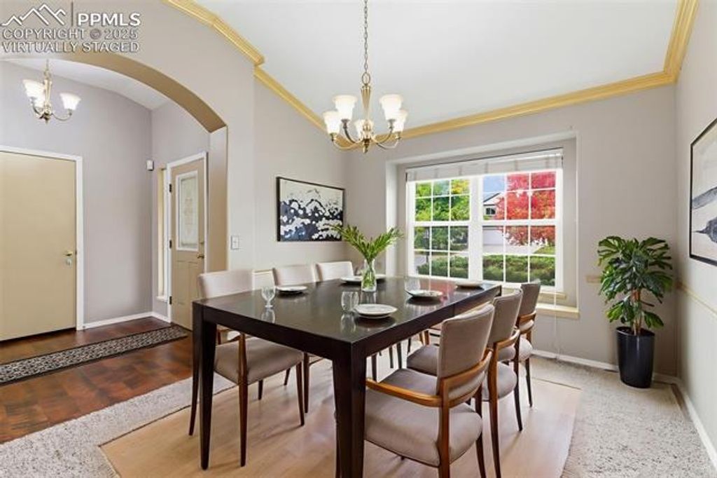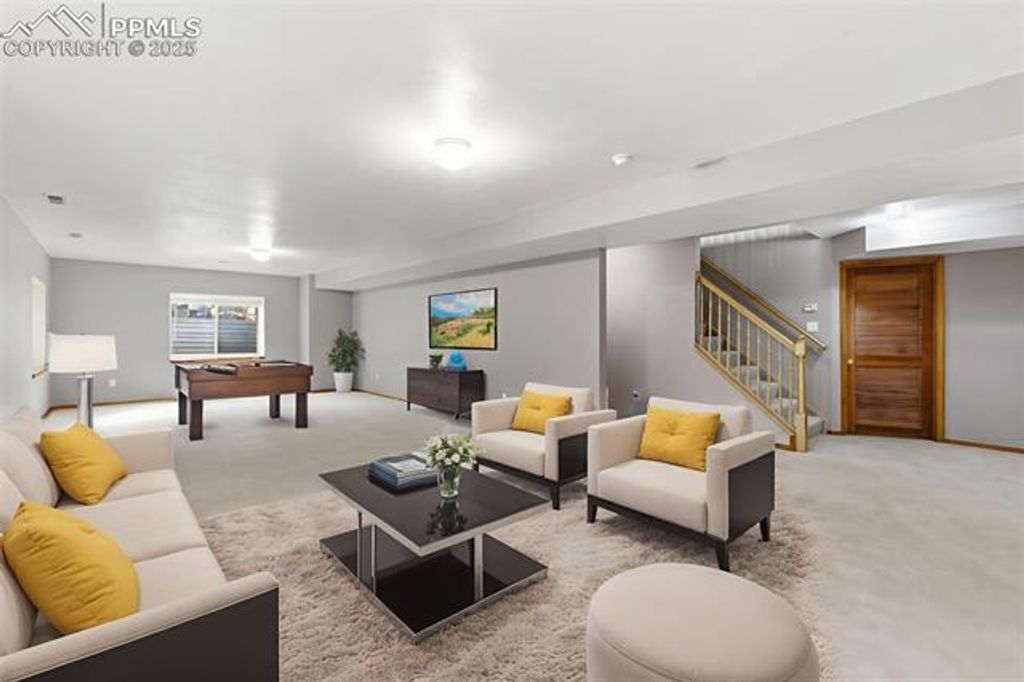 Broadmoor Glen ranch on a quiet cul-de-sac with mountain views (including Cheyenne Mountain) and coveted D12 schools. This spacious 6-bed/3-bath home welcomes you with an open, light-filled layout, 10' ceilings, and fresh interior paint. The formal dining room features a vaulted ceiling with classic trim work. In the kitchen: two-toned soft-close cabinetry, stone counters, stainless appliances (including a gas range), built-in wine rack, and a breakfast bar plus casual dining nook that opens to the back deck"”great for easy indoor-outdoor living. The main-level living room centers on a gas fireplace with a timeless brick hearth. The private primary suite offers a 5-piece bath and walk-in closet; two additional main-level bedrooms add flexibility for guests or a home office. The finished lower level provides an expansive rec/media room and three more bedrooms to fit changing needs. Outside, a large backyard is ready for gatherings. Notable upgrades include a Decre tile roof (Tuscan Sun) with a 50-year transferable warranty. Low annual HOA covers trash and recycling. Blocks to The Reserve Club (pool & tennis), Broadmoor Glen Park, and Pinon Valley Elementary, with everyday conveniences, Cheyenne Mountain State Park, the Cheyenne Mountain Zoo, Fort Carson, and downtown just minutes away. Welcome to Broadmoor Glen"”comfort, space, and location in one.