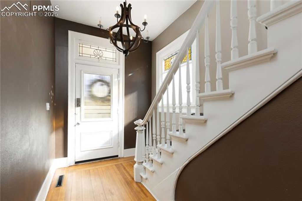 Gracefully blending 1898 character with thoughtful modern updates, this charming home in the coveted Old North End invites you in from the moment you step onto the covered front porch. Inside, rich hardwood floors, custom crown molding, stained glass accents and French doors create a warm, magazine-worthy backdrop. The main floor bedroom adds wonderful flexibility for guests, additional living space, or main-level living. The beautifully remodeled kitchen is truly the heart of the home"”marble counters, under-cabinet lighting, stainless appliances including a high end refrigerator, 4-burner gas stove (new in 2022), microwave, dishwasher and handy island seating. A cozy potbelly wood stove adds old-world charm, while updates like the 2018 roof, 2022 exterior paint, and water heater (approx. 2019) add peace of mind. Clothes washer and dryer are included, and the upstairs bedrooms stay comfortable with two mini-split A/C wall units. Out back, the lifestyle really unfolds: a large wood deck overlooks a fenced yard with mature trees, vine arbor, stone paths, garden area, firepit and a serene, almost secret-garden feel. The detached 2-car garage plus a shed plumbed with electric and water provide rare convenience for this historic area. All of this just moments from downtown, Penrose Hospital, shopping, restaurants, transit, and with quick I-25 access to military bases. Historic architecture, modern comforts, and a truly special setting. Colorado Springs living at its best.