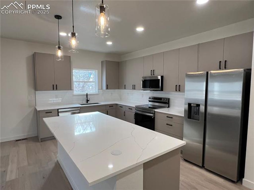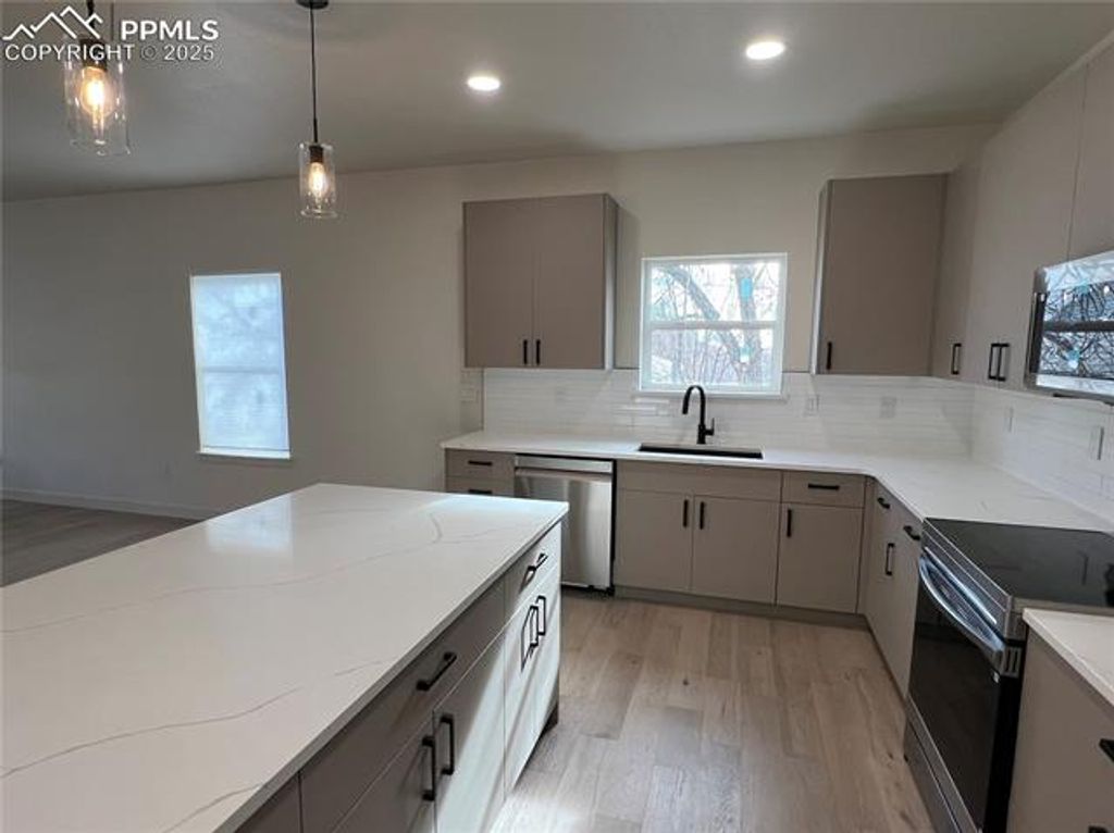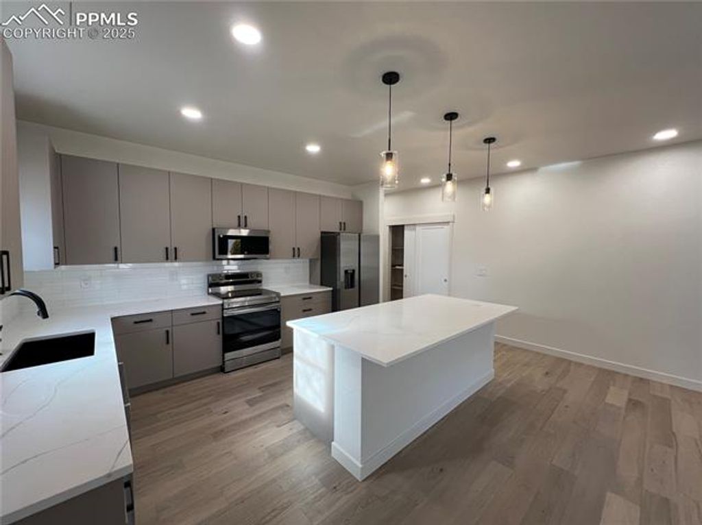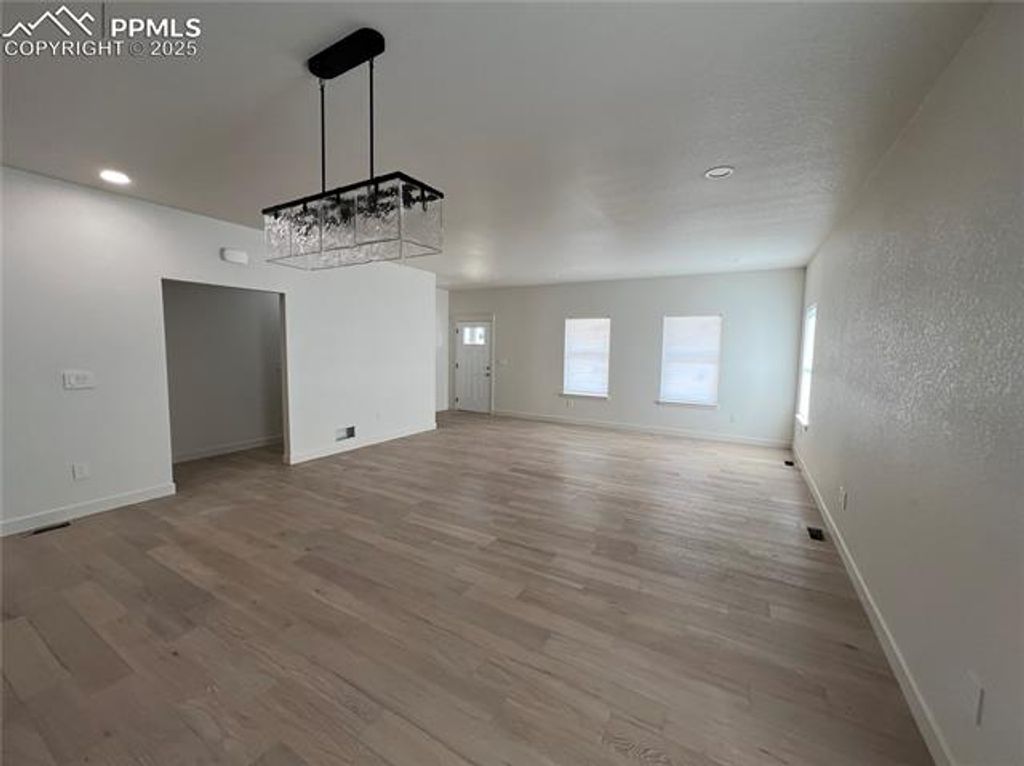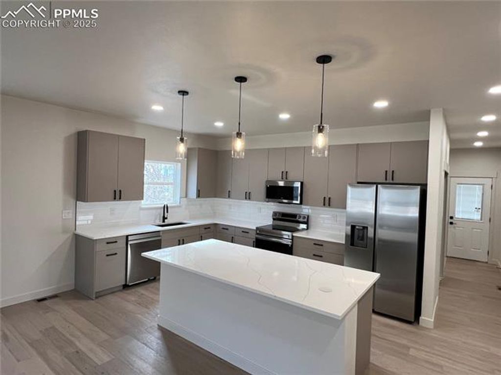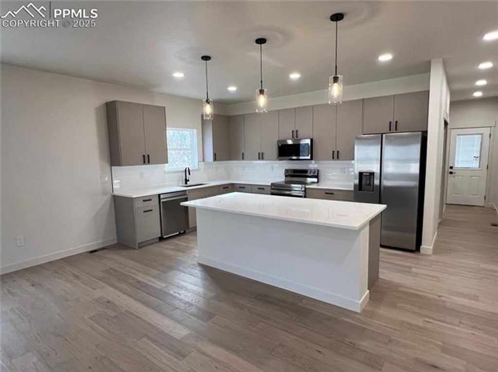 Looking for something new? Here is a custom home that is near completion, in a well-established neighborhood with no hoa. Designed with a craftsman style exterior and a modern interior, this incredible home offers true one level living. The kitchen is open in design and includes granite counter tops, a decorative tile back splash, LED can lighting, stainless steel appliances, under mount sink, a large functional island, a generously sized pantry, matte black hardware & light fixtures, and beautiful cabinets with quiet close doors and drawers. Gorgeous white oak, low maintenance, engineered flooring continues throughout a majority of the home. You will find high quality carpet and pet friendly pad in all the bedrooms. The living room is generously sized and will accommodate the largest of furniture. The primary bedroom has a private full bathroom with soaking tub and a spacious walk-in closet. From the back door there is a mud room that is steps away from the tiled laundry room with included washer and dryer. The floor plan is well designed and includes 9' tall ceilings. Access to the furnace and water heater is on the main level, so keeping up with filter replacement is simple and easy. This home will be fenced with 6' cedar privacy fencing and front yard landscaping will be included. The concrete driveway will be over 40' long and you will be able to access the back yard with a swing gate, providing you a convenient place to store your toys. Enjoy some privacy as the home backs to mature trees and large 23 acre residential lot, or take some time to relax on the covered front porch. You will be able to keep your cost of living low with no Hoa, no metro district, and low property taxes. Conveniently located just 6 minutes from Fort Carson and 4 minutes from shopping centers. Set your private showing today!