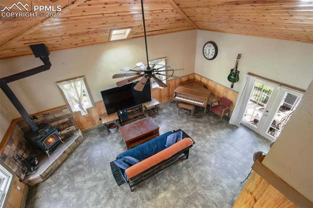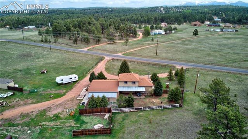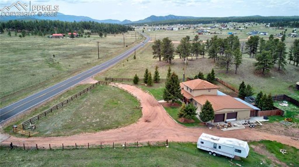 This beautiful stucco home, located on 11.31 acres, offers stunning 360-degree views and is perfectly suited for horse enthusiasts and homesteaders. Zoned for horses, the property includes a well originally permitted for a 35-acre parcel, providing abundant water use for domestic, agricultural, and livestock purposes, along with irrigation for up to one acre of lawns and gardens. Whether you're looking to raise animals, cultivate gardens, or simply enjoy the natural beauty, this property has it all. The exterior features include a fully fenced backyard, three pastures, two loafing sheds, and a five-stall barn with a tack room and additional storage space. There's also a dedicated RV pad with its own electrical and septic hookups, ideal for visitors or personal use. The expansive 400-square-foot patio is perfect for outdoor entertaining, while the circular gated front driveway ensures easy access and added privacy. The oversized garage offers plenty of room for a long-bed quad cab truck, plus there's a separate workshop, a storage room, and an adjacent third bay with a roll-up door. Inside, the home is equally impressive with warm tongue-and-groove ceilings, wainscoting, and vaulted ceilings with skylights that flood the family room with natural light. A cozy wood-burning stove efficiently heats the heart of the home, making this space perfect for family gatherings. From the covered front porch and living room, you can enjoy breathtaking views of Pikes Peak and the surrounding landscape. Located just minutes from the Florissant Fossil Beds, approx an hour from Breckenridge and Buena Vista, and only 15 miles from Woodland Park and 13 miles from Cripple Creek, this home combines the tranquility of rural living with easy access to local amenities. Whether you're an equestrian lover, a homesteader, or someone seeking space and privacy, this property is an incredible opportunity to live your Colorado dream.