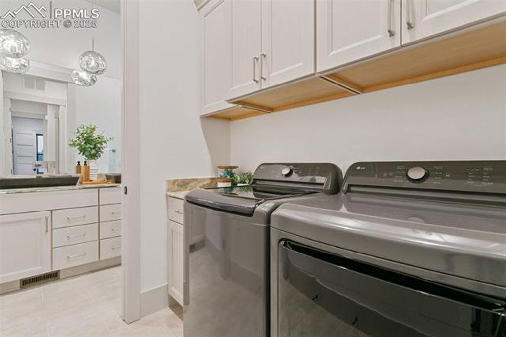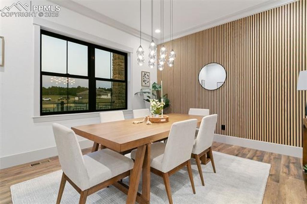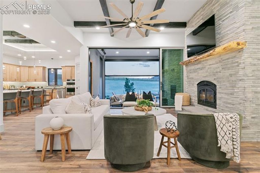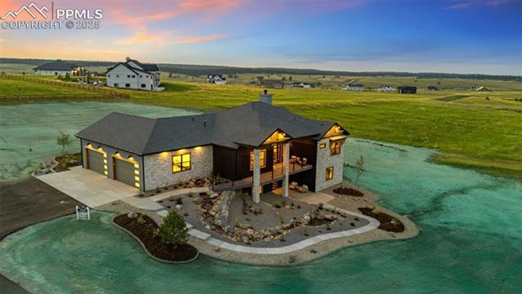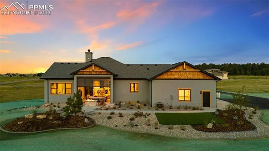 Nestled on a spacious homesite in the picturesque Winsome community, this 2025 Parade Home built by JS Luxury Homes blends refined design, timeless craftsmanship, and modern livability. The stately exterior of stone, wood, and rich architectural detail sets the tone for the luxurious interior within. Expansive windows capture sweeping views of Colorado's landscape, while the soft glow of evening light enhances the home's warm, inviting presence. Inside, every detail is thoughtfully curated. The open-concept great room features soaring ceilings with exposed beams, a stunning stacked-stone fireplace, and wide-plank flooring throughout. Oversized glass doors connect the living space to a covered patio with a double-sided fireplace and stone fire pit, creating the perfect setting for indoor-outdoor living. The chef's kitchen is elegant and functional, highlighted by natural wood cabinetry, a large quartz island, full tile backsplash, and stainless appliances including a gas range and double ovens. Pendant lighting and a built-in workspace make this kitchen the heart of the home. The dining area with wood-slat accent wall offers an intimate setting framed by designer lighting and large picture windows. The primary suite is a true retreat with mountain views, a stone fireplace, and a spa-like bath featuring custom cabinetry, dual vanities, and a glass-enclosed shower. The finished lower level includes a wet bar, rec room, home gym, and guest suites. Outdoors, enjoy year-round living by the covered patio fireplace or fire pit while taking in stunning sunsets.