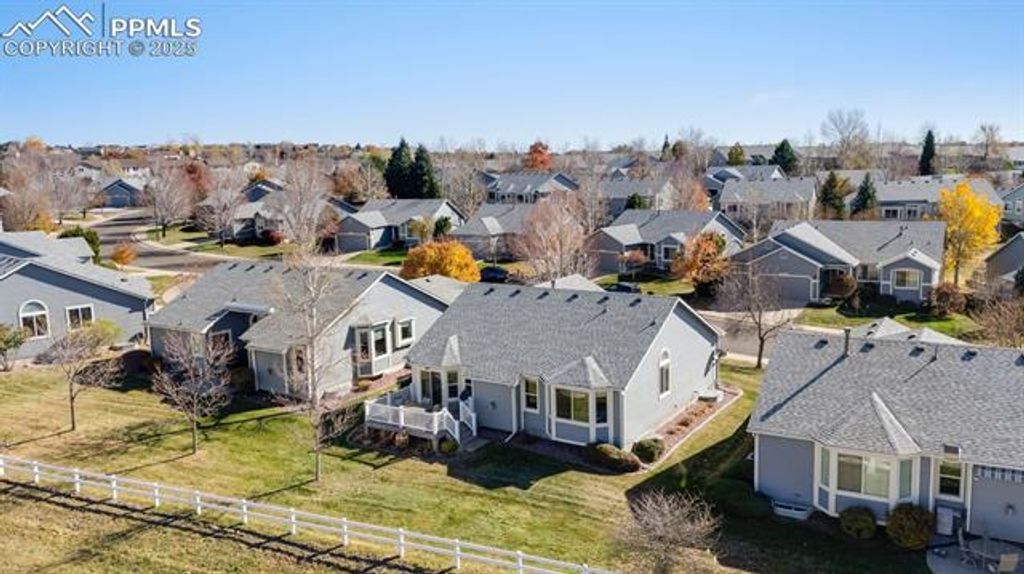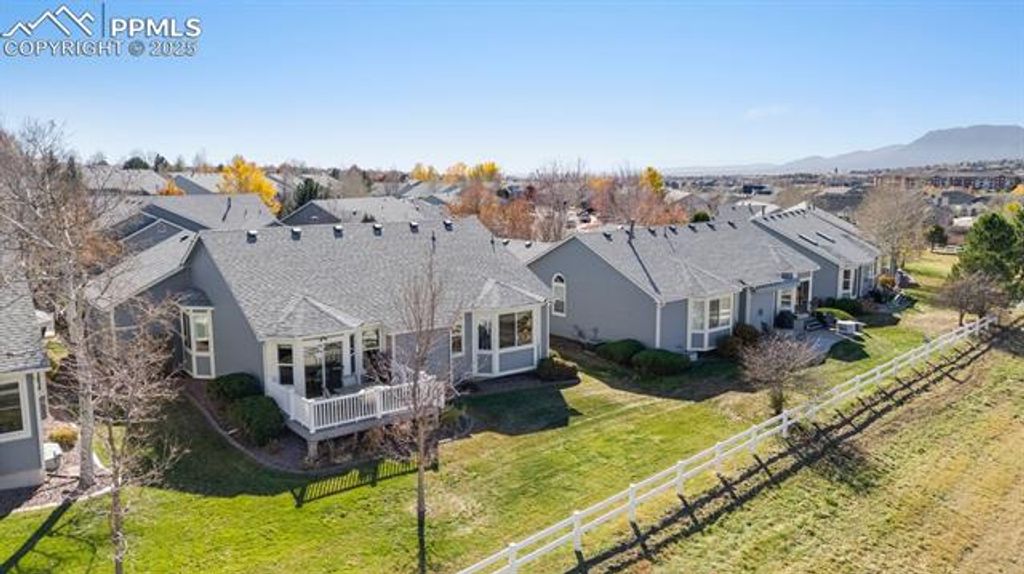 Take in breathtaking, snowcapped Pikes Peak views from this meticulously maintained 4-bedroom, 3-bath ranch home in the highly desirable Springs Ranch community. Built in 2004, this thoughtfully designed home offers main-level living for comfort and convenience, ideal for retirees, or anyone seeking low-maintenance, move-in-ready luxury. The open-concept main living area seamlessly connects the kitchen, dining, and great room under soaring vaulted ceilings, flooded with natural light that enhances the sense of space and warmth. The great room serves as the heart of the home, anchored by a cozy gas fireplace, plush upgraded carpet (2024), and new light fixtures (2025). The kitchen features tile countertops and hardwood floors, with a walkout to a composite deck offering spectacular views, overlooking the open space behind the home and future Coleman Park. A separate formal dining room with a charming bay window provides a welcoming space for gatherings and entertaining. The primary suite offers tall ceilings, a walk-in closet, and serene views of the open space behind the home, paired with an ensuite 5-piece bath. Main-level convenience continues with an additional bedroom and bath, plus the laundry room all on the main floor. The finished basement expands living options with two additional bedrooms, a full bath, and a large flexible-use space ideal for a recreation area, home gym, office, or family room. Other highlights include a rare 3-car garage, Class IV roof (2024), and low-maintenance HOA that handles snow removal, trash, and landscaping. Backing to open space and mountain views, this home offers privacy and a sense of serenity while just minutes from shopping, entertainment, Powers Corridor, Peterson SFB, Schriever SFB, and amenities of Northeast Colorado Springs. A genuine find, cared for by its original owner, delivers move-in-ready ranch living with style, comfort, and a peaceful setting, perfect for enjoying Colorado's beauty year-round.