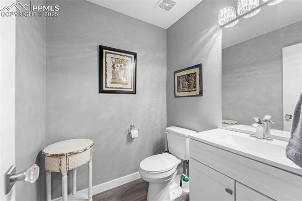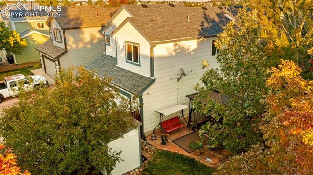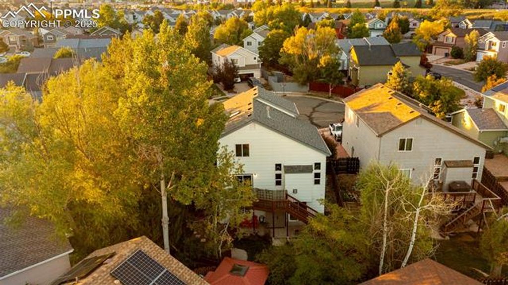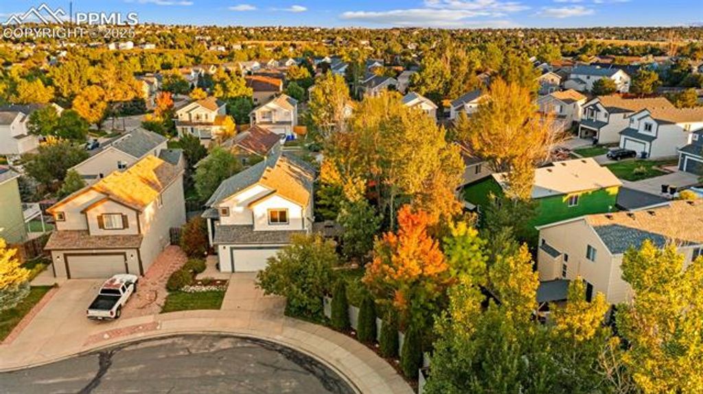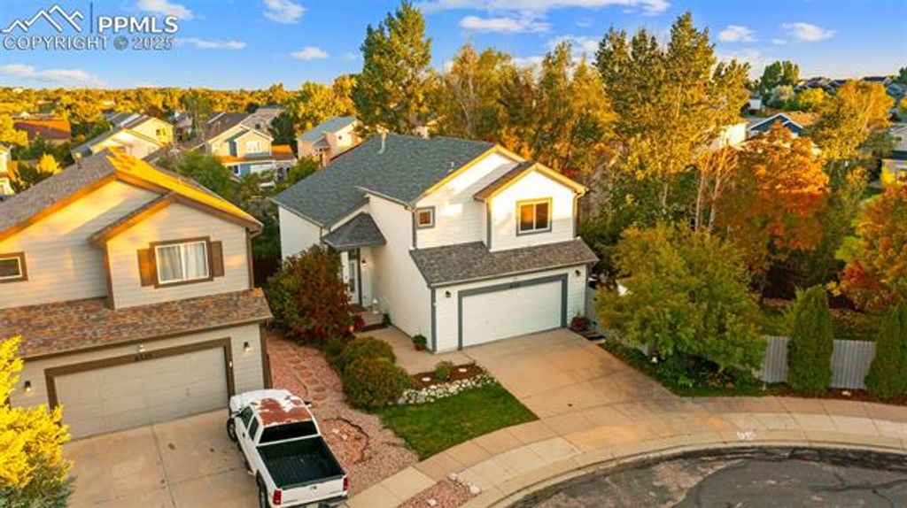 Come and explore this stunning home set on a cul-de-sac with a one-of-a-kind OVERSIZED lot featuring a beautifully landscaped secret garden like outdoor entertainment space. Walking inside you'll be greeted with soaring ceilings in the living room, perfectly framed by a gas fireplace with a custom built-in display. Luxury vinyl flooring extends throughout the main level, leading from the living and dining areas into the showstopping kitchen. The professionally upgraded kitchen will truly dazzle you with calcite countertops (an upgrade from traditional granite), custom cabinets with soft-close features and under-cabinet lighting, stainless steel appliances, a beautiful glass backsplash, and a pantry. The dining nook in the kitchen features a large picture window "”which was added by the sellers"” that overlooks trees and the stunning yard with vibrant fall colors. This window, along with the sliding patio doors that open to the back deck, fill the space with abundant natural light. Step onto the deck overlooking a green lawn, then explore further to discover a gate opening to a stone pathway with stunning landscaping. This leads to an additional expansive lawn with a stone patio, gazebo, and two storage sheds. This one-of-a-kind yard is unique to this lot, making it truly special. Plus, a large utility gate in the fence provides space to accommodate a trailer or trash cans from the curb. Back inside, move upstairs to find the primary suite with an en-suite bathroom featuring a double vanity, tub/shower combo, water closet, and walk-in closet. The upper level also includes two additional bedrooms and a full bathroom. The walkout basement offers a perfect space for family movie or game nights, along with a fourth bedroom with en-suite access"”ideal for guests or a home office. Located in the coveted Stetson Hills area, enjoy close proximity to entertainment, dining, and shopping right off Powers Blvd. This home shows pride of ownership throughout and is a true gem!