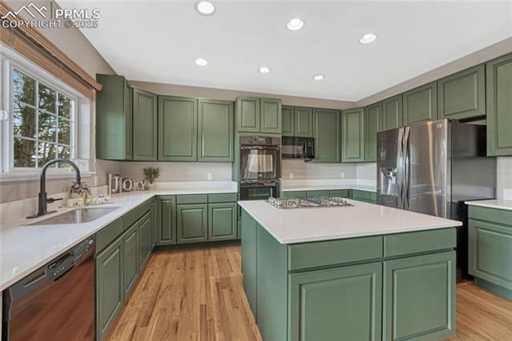 Welcome to your own private oasis that BACKS TO OPEN SPACE with GREAT VIEWS. Gorgeous and classic brick adorns the front of the home, for a timeless style. As you enter, gleaming hardwood floors lead to the GREAT ROOM, bathed in natural light centered by a brick surround GAS FIREPLACE framed by with large DOUBLE WINDOWS on each side then huge picture windows on top of them - all overlooking the open space view of the old Springs Ranch golf course. The GOURMET KITCHEN has just had a beautiful makeover with freshly painted cabinets of a gorgeous forest green and BRAND NEW QUARTZ countertops lends such a classy look to the huge kitchen. The main level also has an office, a flex space front room and a formal dining room. Upstairs, the primary retreat is spacious and bright. With a 5 piece ensuite, brand new ceramic tile and an extra large closet. It's a serene space to relax and rejuvenate. There are 3 other bedrooms upstairs, all bright and airy. The basement has a gym area, another bedroom and 3/4 bath and family room. With almost 4,000 square feet, you can really spread out. The backyard is the crowned glory of this home though. A huge deck that's a walkout from that glorious kitchen then a brick patio with a pergola and swing - all facing a serene open space that was once a golf course. It's a setting that lends to relaxation, peace and tranquility. It's also perfect for entertaining with so much space to mingle and roam. Come for the beautiful big house, stay for sense of peace and relaxation you can feel here.