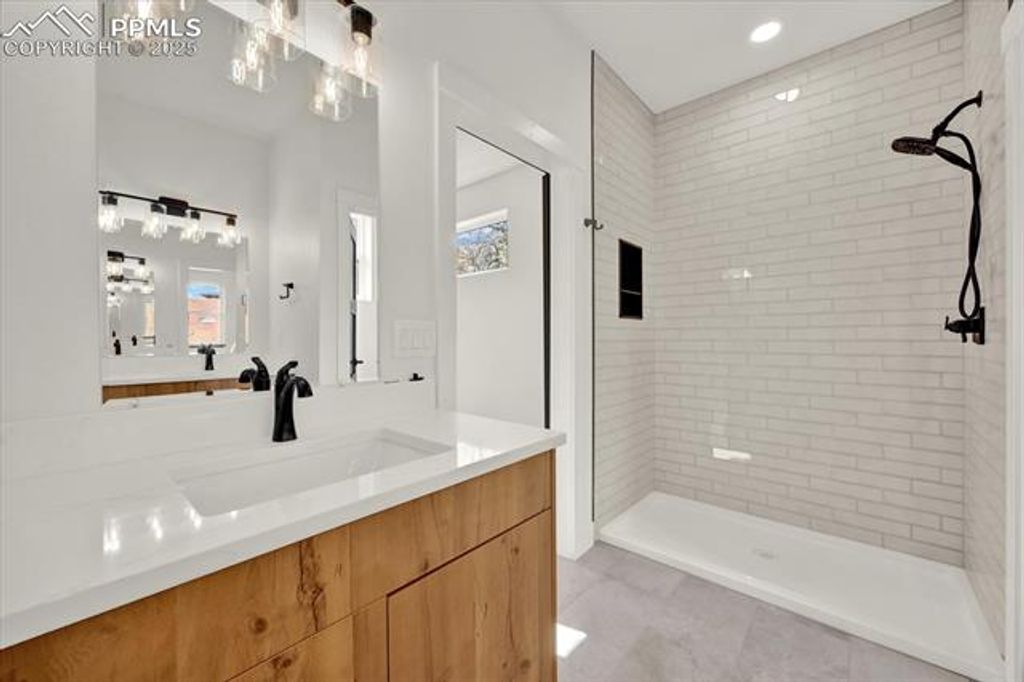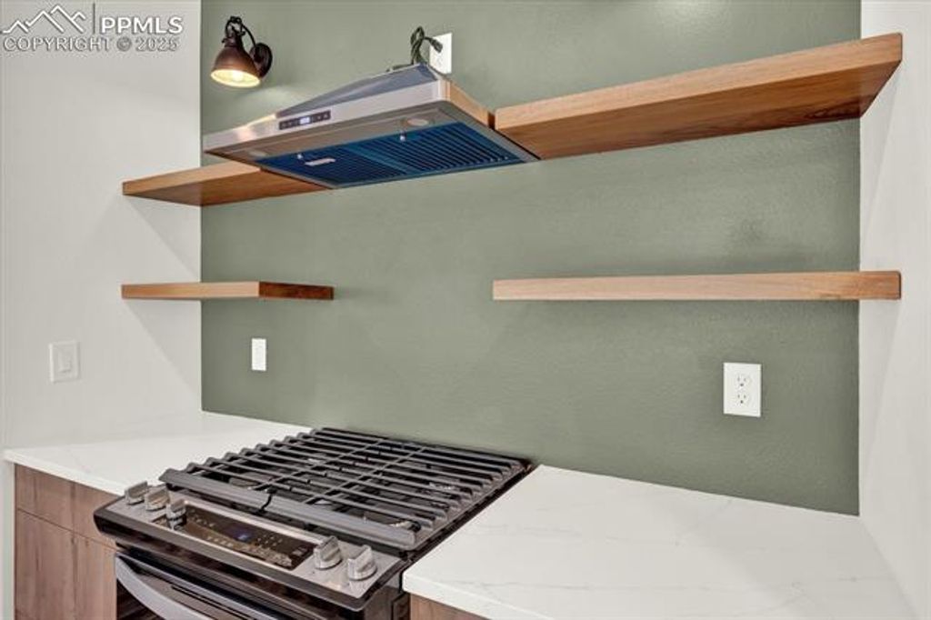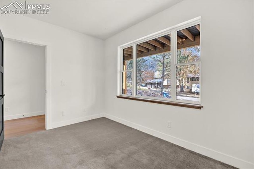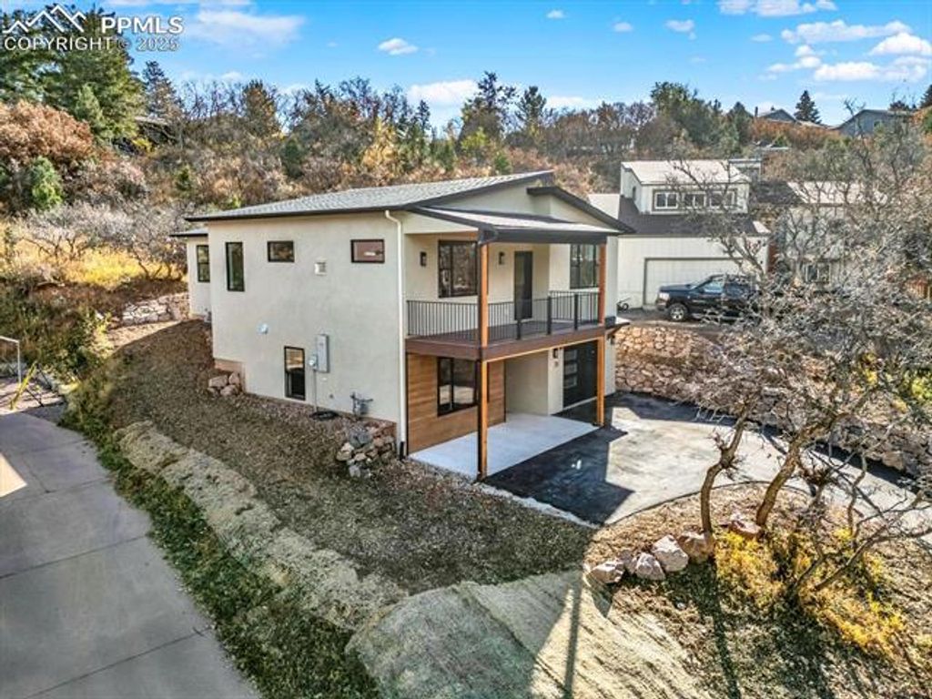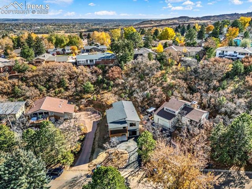 Discover this brand-new, custom-built, Mountain Modern-style home nestled in an established neighborhood known for its mature trees and scrub oak. This is a rare find"”a newly constructed home offering the peace and space of a developed community with NO homeowner's association (HOA)! The spacious living room is anchored by a cozy gas fireplace, perfect for relaxing evenings. The home boasts custom touches throughout, including elegant white oak flooring, stairs, and windowsills. The gourmet kitchen is a chef's delight, featuring an eight-foot center island with lower cabinetry, a classic farmhouse sink, and stainless-steel appliances, including a dishwasher and vent hood. Attractive floating shelving and cabinet drawers flanking the gas range. A large walk-in pantry provides ample storage and includes an additional power supply for a microwave or other appliances. The expansive kitchen and dining area offer plenty of space for entertaining guests. Take in Pikes Peak and mountain views from the covered composite deck, framed by beautiful Douglas Fir accents. Outside, you'll appreciate the low-maintenance yard and a large driveway with ample parking leading to the oversized one-car garage. Enjoy the nearby walking and biking trails for easy outdoor access. The home includes a luxurious large primary suite that easily accommodates a king-sized bed. The accompanying bathroom features two separate vanities, a private toilet area, a large walk-in shower, and a substantial walk-in closet. A convenient office near the front door, complete with a large, bright window, is perfect for working from home. The lower level also includes a full bathroom with a shower. For modern convenience, the home is pre-wired with ethernet and cable and includes air conditioning. Don't miss this exceptional opportunity to own a unique, custom, and brand-new home in a sought-after, established location!