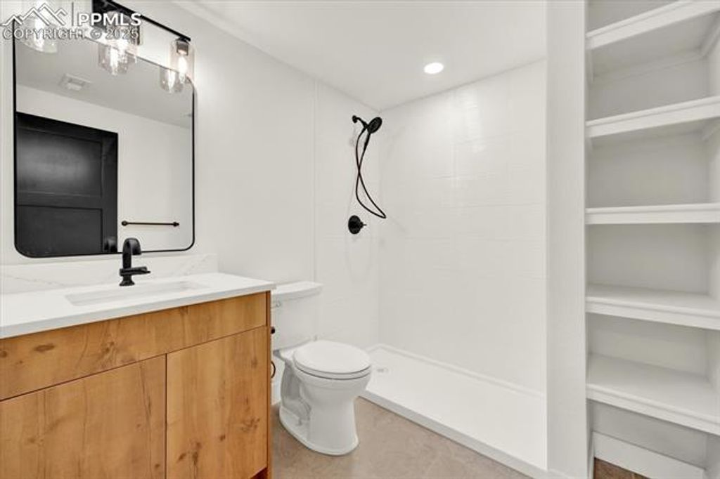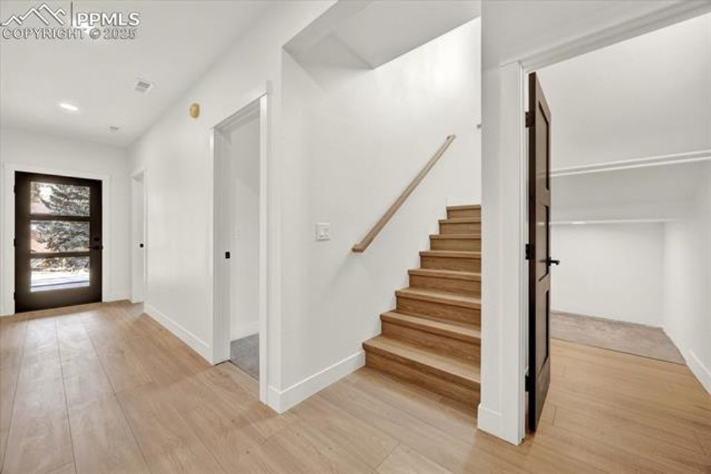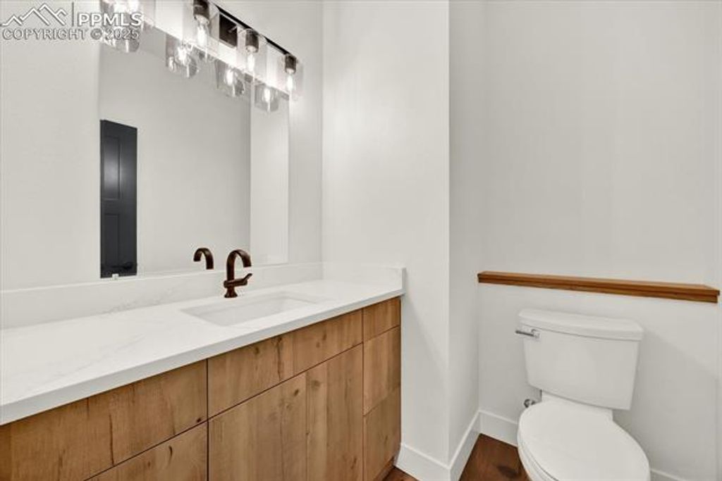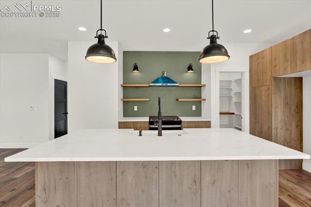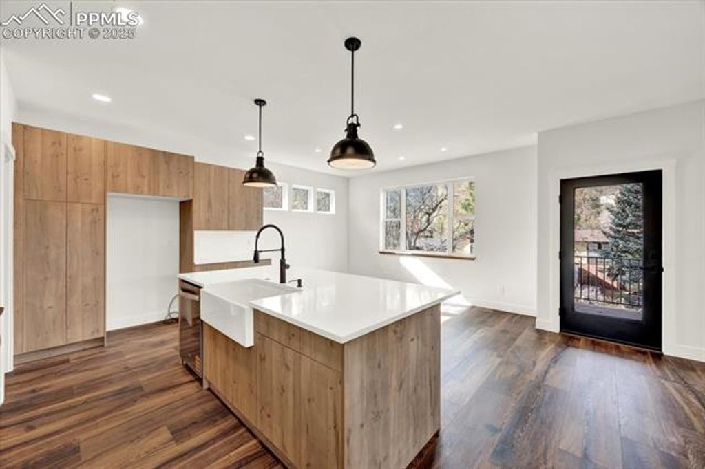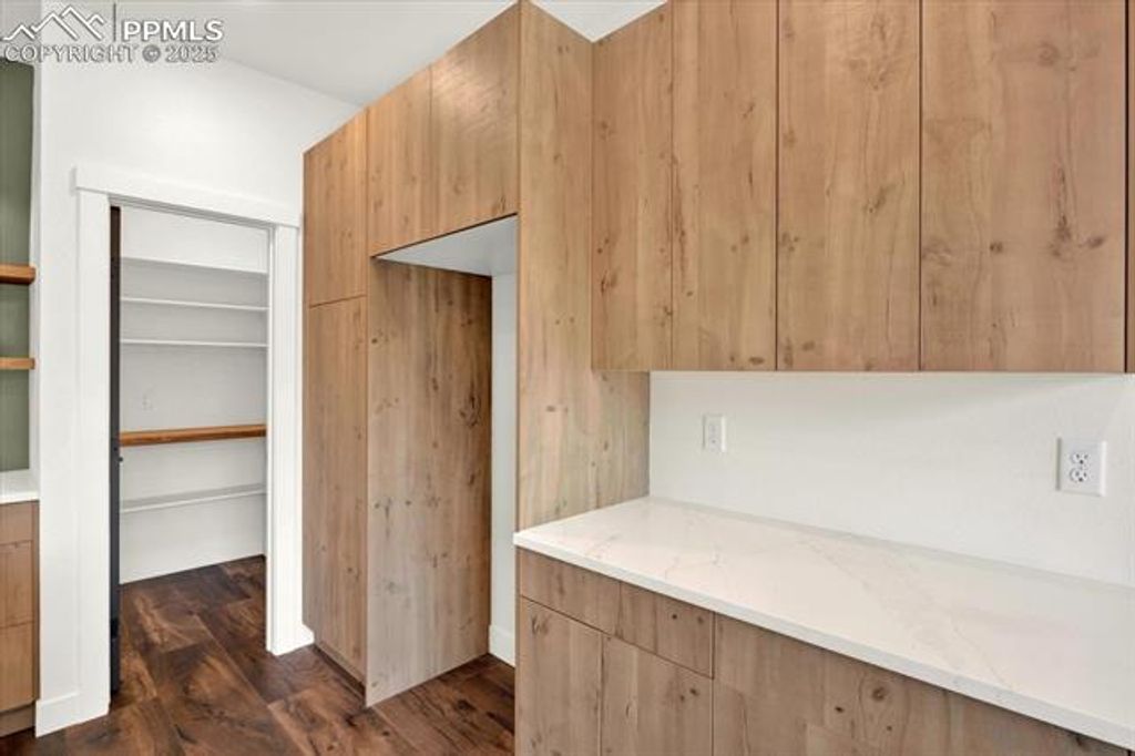 Discover this brand-new, custom-built, Mountain Modern-style home nestled in an established neighborhood known for its mature trees and scrub oak. This is a rare find"”a newly constructed home offering the peace and space of a developed community with NO homeowner's association (HOA)! The spacious living room is anchored by a cozy gas fireplace, perfect for relaxing evenings. The home boasts custom touches throughout, including elegant white oak flooring, stairs, and windowsills. The gourmet kitchen is a chef's delight, featuring an eight-foot center island with lower cabinetry, a classic farmhouse sink, and stainless-steel appliances, including a dishwasher and vent hood. Attractive floating shelving and cabinet drawers flanking the gas range. A large walk-in pantry provides ample storage and includes an additional power supply for a microwave or other appliances. The expansive kitchen and dining area offer plenty of space for entertaining guests. Take in Pikes Peak and mountain views from the covered composite deck, framed by beautiful Douglas Fir accents. Outside, you'll appreciate the low-maintenance yard and a large driveway with ample parking leading to the oversized one-car garage. Enjoy the nearby walking and biking trails for easy outdoor access. The home includes a luxurious large primary suite that easily accommodates a king-sized bed. The accompanying bathroom features two separate vanities, a private toilet area, a large walk-in shower, and a substantial walk-in closet. A convenient office near the front door, complete with a large, bright window, is perfect for working from home. The lower level also includes a full bathroom with a shower. For modern convenience, the home is pre-wired with ethernet and cable and includes air conditioning. Don't miss this exceptional opportunity to own a unique, custom, and brand-new home in a sought-after, established location!