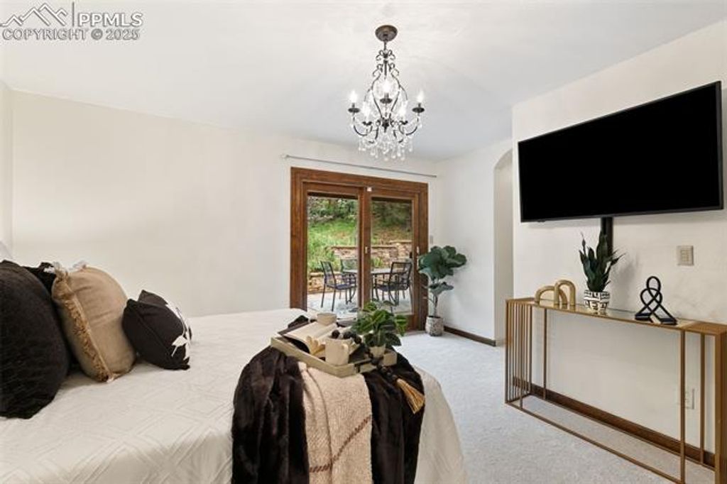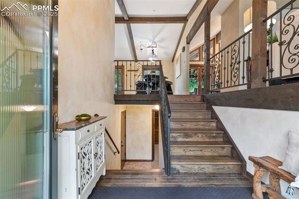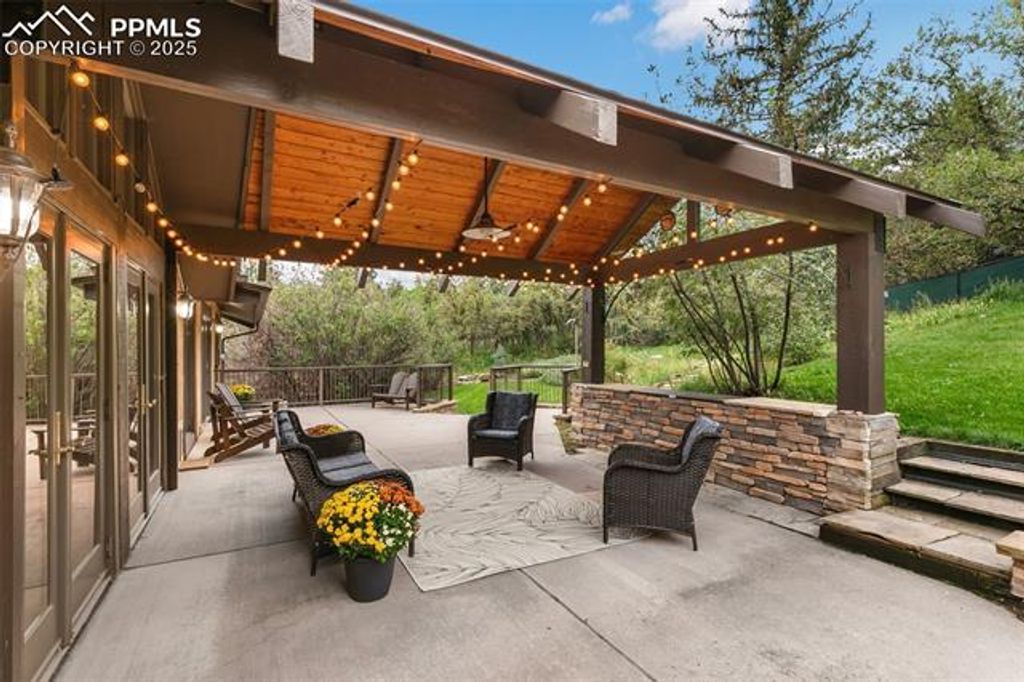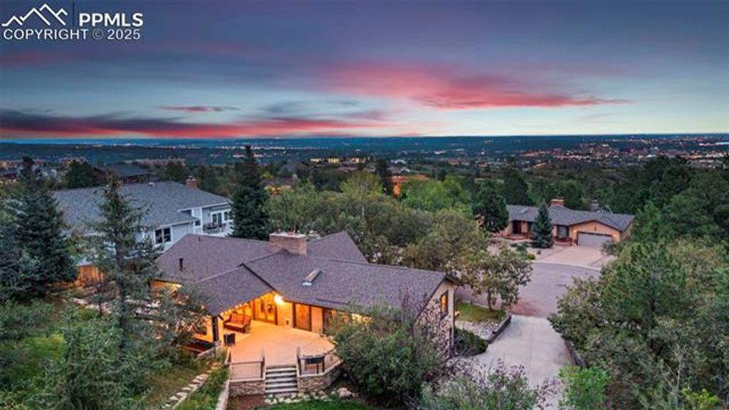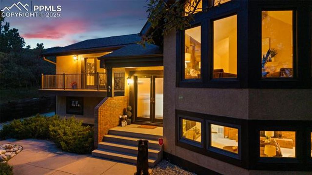 Situated on a quiet cul-de-sac in Upper Skyway, this one-of-a-kind custom home offers timeless character, great privacy & a desirable location within the award winning School District 12. Step inside a spacious open-concept layout with vaulted, beamed ceilings, elegant wrought iron railings, sophisticated light fixtures, & abundant natural light throughout. Designed for both everyday comfort & unforgettable entertaining, this residence features multiple indoor & outdoor gathering spaces. The gourmet kitchen is a true centerpiece- combining warm rustic charm with timeless Italian design elements & featuring rich, hardwood floors, granite countertops, a large custom island, built-in shelves, & a beautiful stained glass window. Enjoy sunrises & city views from the East balcony off the kitchen. Walk out from the kitchen, formal dining room or luxurious primary suite to the expansive 900 sqft. patio. This breathtaking outdoor space is complete with a covered living area, built-in gas fireplace, lush yard & natural Colorado landscaping all around. There is plenty of room for everyone with 6 bedrooms (3 on the upper level & 3 on the lower level), which would also make great office, hobby or workout spaces. The primary suite offers private patio access, an attached spa bathroom with Italian marble floors, vanity with granite countertops, a soaking tub, walk-in shower & walk-in closet. You'll find a cozy family room in the lower level with a wood burning fireplace, built-in wet bar including a wine cooler, mini fridge, + built-in spirits dispenser, as well as, a large laundry room, huge storage space with an extra refrigerator & plenty of storage cabinets. Additional highlights include; brand new carpet throughout, new roof & new gutters, new laundry room tile, & Anderson windows + doors. Just steps from Bear Creek hiking & biking trails & a short drive to Downtown, OCC & Manitou. This home provides a wonderful Colorado lifestyle- don't miss the opportunity to make it yours!
