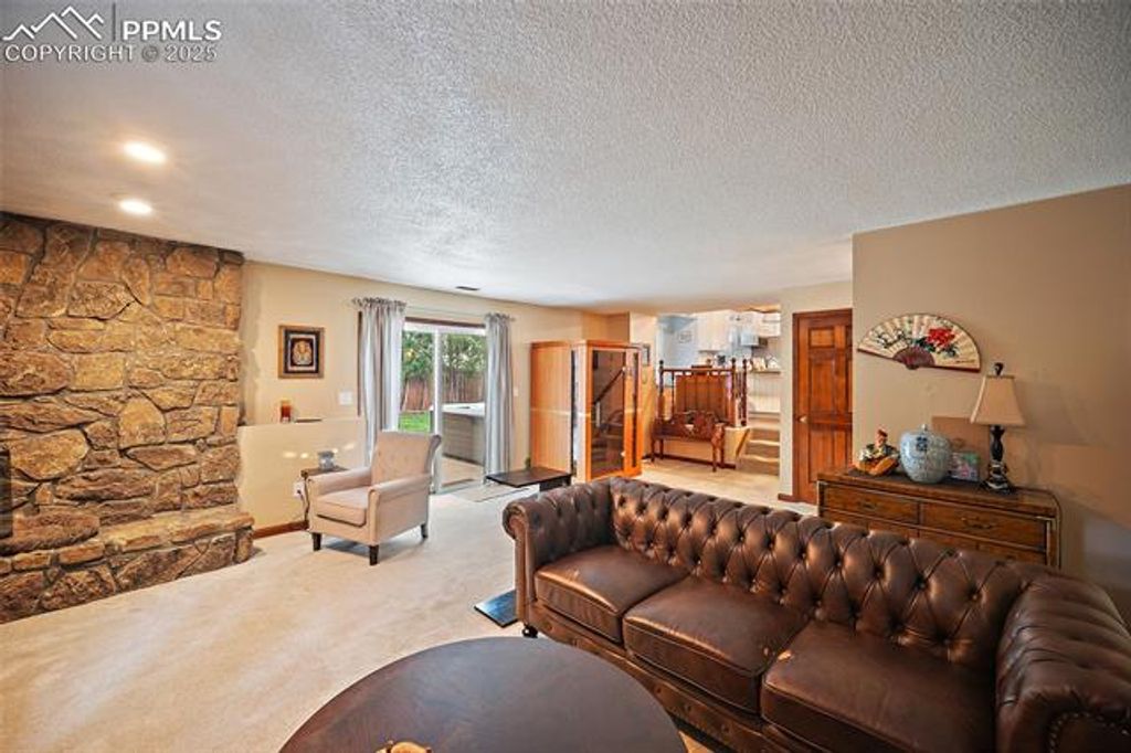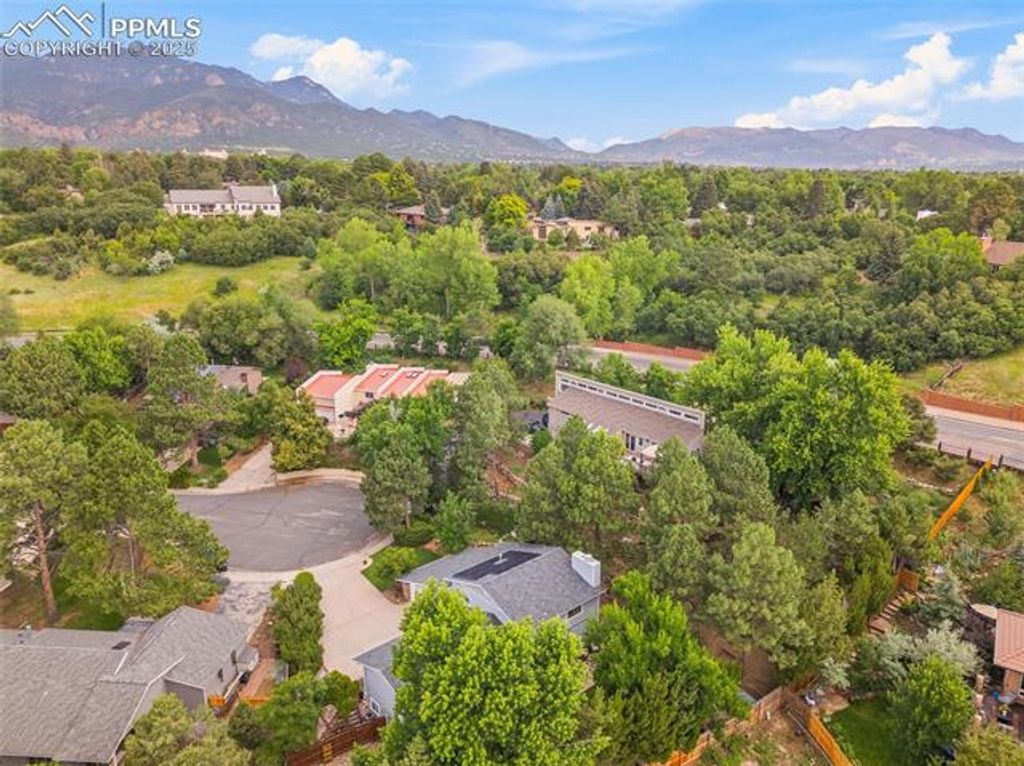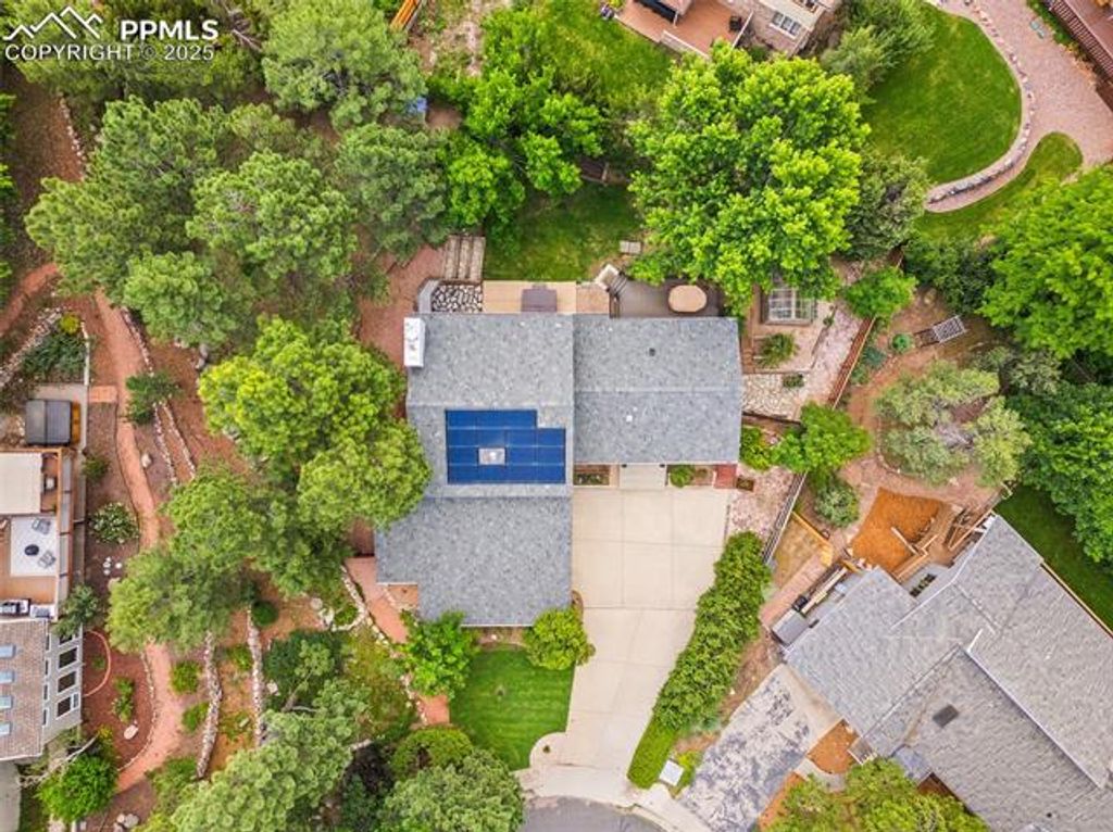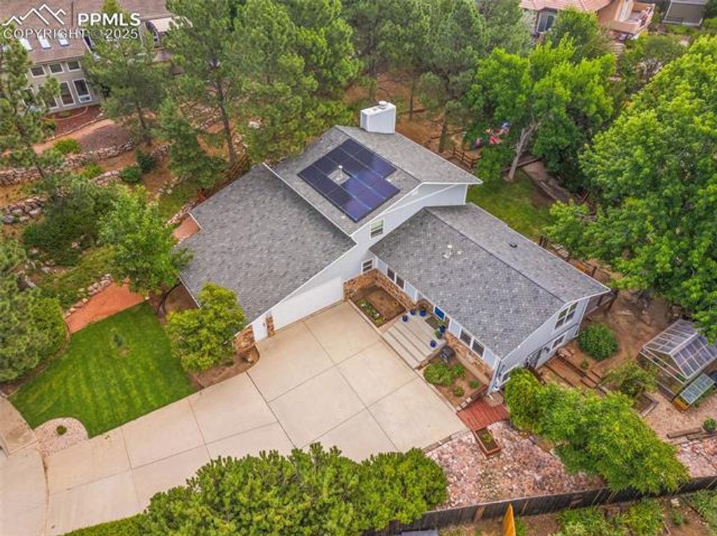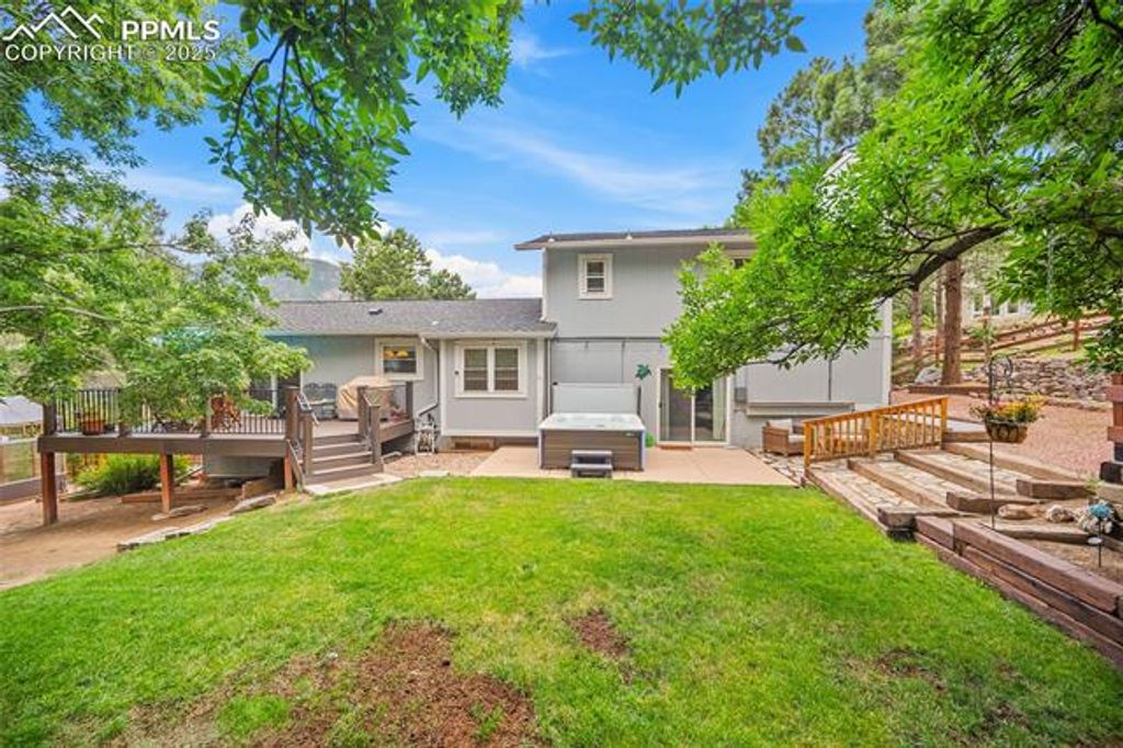 Rare Opportunity in Coveted D-12 School District! Beautifully updated 5-bedroom, 4-bathroom home located at the end of a quiet cul-de-sac, offering both privacy and convenience. From the moment you enter, you'll appreciate the open-concept floor plan and the warm, inviting charm of the wood plank ceilings"”giving the home a unique, resort-like feel. Step out onto the new, low-maintenance composite deck and enjoy gorgeous mountain views"”the perfect setting for family meals or entertaining guests. The fully fenced backyard is a true private retreat with mature trees, featuring a custom greenhouse with power, a hot tub off the lower-level patio, and a custom-designed fire pit area ideal for relaxing evenings under the stars. Inside, you'll love the updated open concept. The kitchen and bathrooms, new carpet, and zoned heating and cooling with dual HVAC systems for year-round comfort. The cozy, remote-controlled fireplace sets the mood for intimate family time, while the finished walk-out basement"”secured with a custom security gate"”offers bonus living space and versatility for guests, a home office, or a game room. The home features custom security features, such as 3M Security Film on both patio doors, custom security gate to basement and commercial grade exterior garage door. Sustainability meets savings with Tesla solar panels and low-water-use turf in the front yard"”both environmentally friendly and budget-conscious. Enjoy the benefits of being within walking distance to the country club, and close to Cheyenne Canyon, downtown Colorado Springs, Ft. Carson, and hiking trails. This home truly has it all"”style, space, updates, location, and unbeatable outdoor amenities. All that's left is for you to move in and jump in the hot tub!