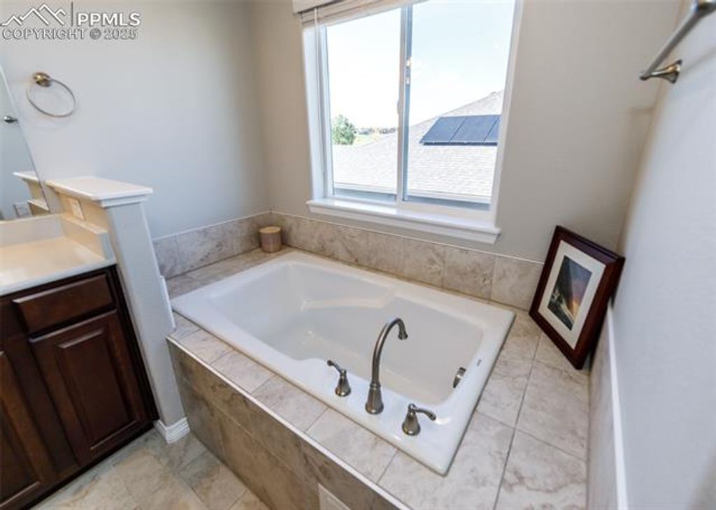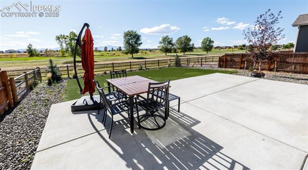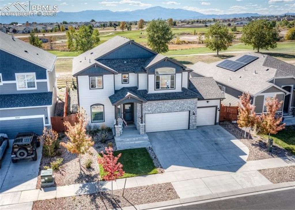 Welcome Home! Beautiful Home in Meridian Ranch with Unmatched Golf Course and Pikes Peak Views! Open space and Golf Course are in your back yard, with outstanding views of the Front Range. Your yard is beautifully landscaped with low-maintenance, water-saving artificial turf. And a fully fenced back yard. Inside, you'll find a lovingly maintained home featuring luxury vinyl plank flooring throughout the main level and a soaring great room anchored by a stunning full-height fireplace mantle and gas log fireplace, that fills the space with warmth and character. Plenty of windows bring in the sunshine, complimenting the open floor plan. The kitchen is a chef's delight with quartz countertops, a spacious butler's pantry offering abundant storage, and an inviting eat-in breakfast area that walks out to a huge concrete patio"”perfect for entertaining or simply soaking in the views and Colorado sunshine. Upstairs, the expansive primary suite impresses with vaulted and coffered ceilings, an ensuite bath featuring a double vanity, a luxurious soaking tub, a separate shower, and a large walk-in closet. Two secondary bedrooms, a full main bath, a convenient bedroom-level laundry, and an open loft area provide plenty of space for family and guests. The unfinished basement is a blank canvas ready for your personal touch"”ideal for adding more living space, a home gym, or a recreation area. Enjoy the best of Meridian Ranch living with golf, trails, and mountain views right outside your door!