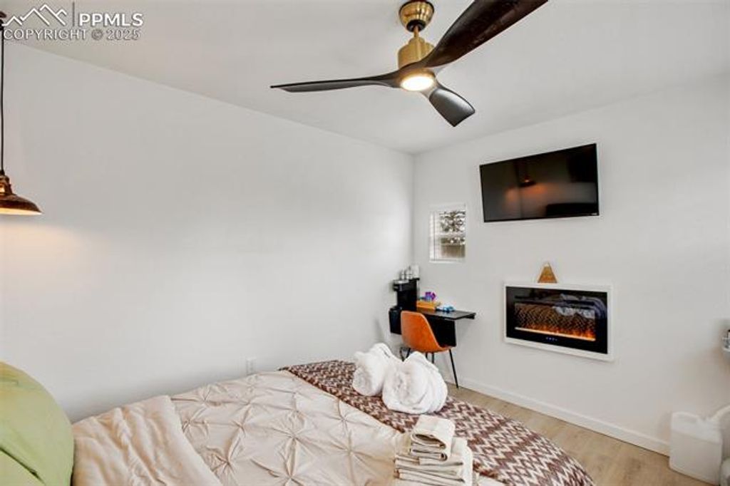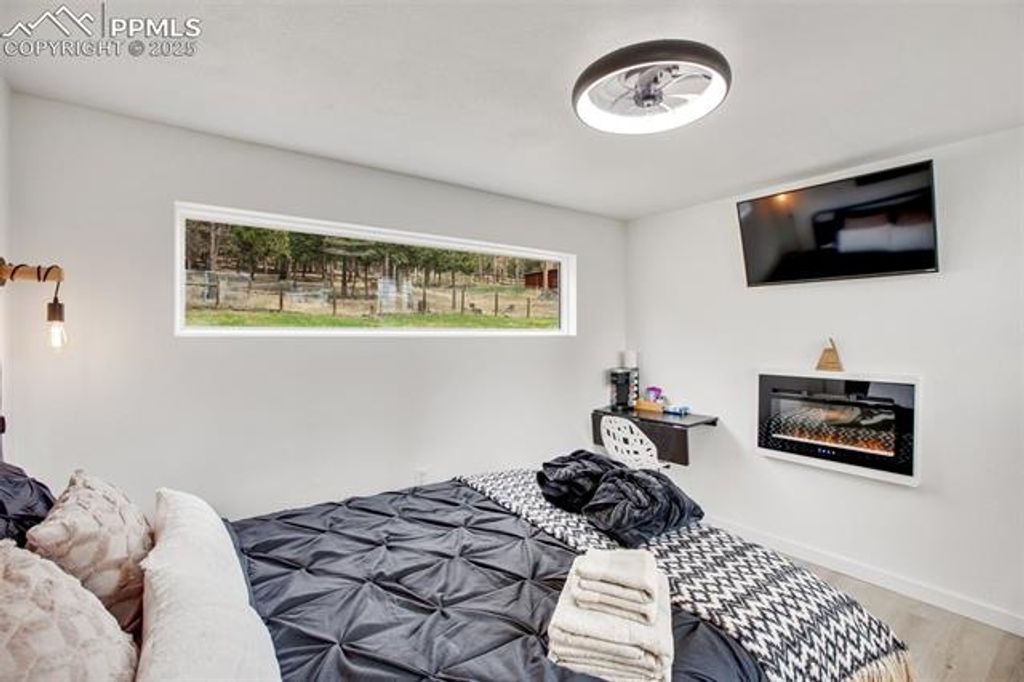 Nestled along Pike's National Forest land in the City Above the Clouds is a gorgeous property known as Rampart Reserve. The estate sits on over 4 acres, off of paved, county maintained roads & only 5 minutes to downtown Woodland Park. The Reserve has mature aspens and pine trees galore! A large, updated home with 4 bedrooms plus a den/5th bedroom/office, 4 bathrooms, 2 massive wood fireplaces (1 on each floor), 2 incredible kitchens with granite & 2 laundry hookups. Each floor in the main home has a split bedroom layout: primary suites with attached spa-like bathrooms & large walk-in closets on one side and large secondary bedrooms w/big closets and new, updated bathrooms on the other. Double insulation with sound gap between the 2 floors has been added to minimize sound. Walk out onto the expansive deck to soak in the views of Pikes Peak & the western mountain summits. Behind the primary home are 4 remodeled dry cabins w/in-wall electric fireplaces, mounted TVs, views of the Forest, Pikes Peak & neighboring horse farm. There's also a 660+ square foot building with another full kitchen & 2 beautiful bathrooms + dryer hookup! A very unique cedar, domed shower building is a one-of-a-kind amenity & guest favorite! Do you have animals or perhaps want to keep the alpaca/llama farm that exists at Rampart Reserve today? No problem! There's a lofted barn w/a new lean-to addition. The whole property is fully fenced w/an electronic/automatic gate at the front & other fencing in the back to separate animals, plus two dog runs directly off of the main home. A gate at the back of the property allows you to go on endless hiking adventures in the national forest. The 3 stall, extended garage is heated, offers a workshop & lots of storage including pulleys for your kayak & bicycles. Plenty of other parking is available on the all-paved driveway! New roof on the large back building (2024), an additional 2 compartment septic tank added (2024) + septic system was re-rocked (2024).