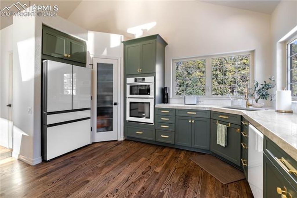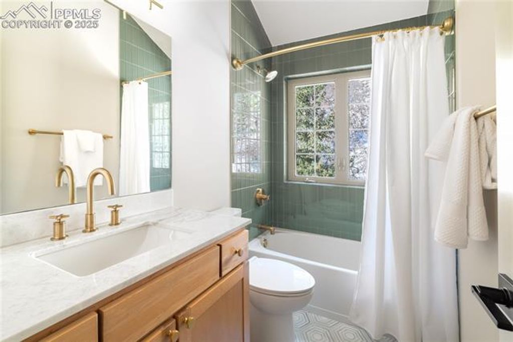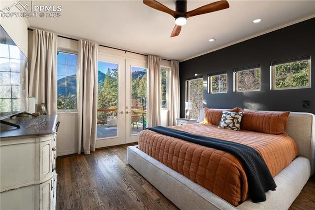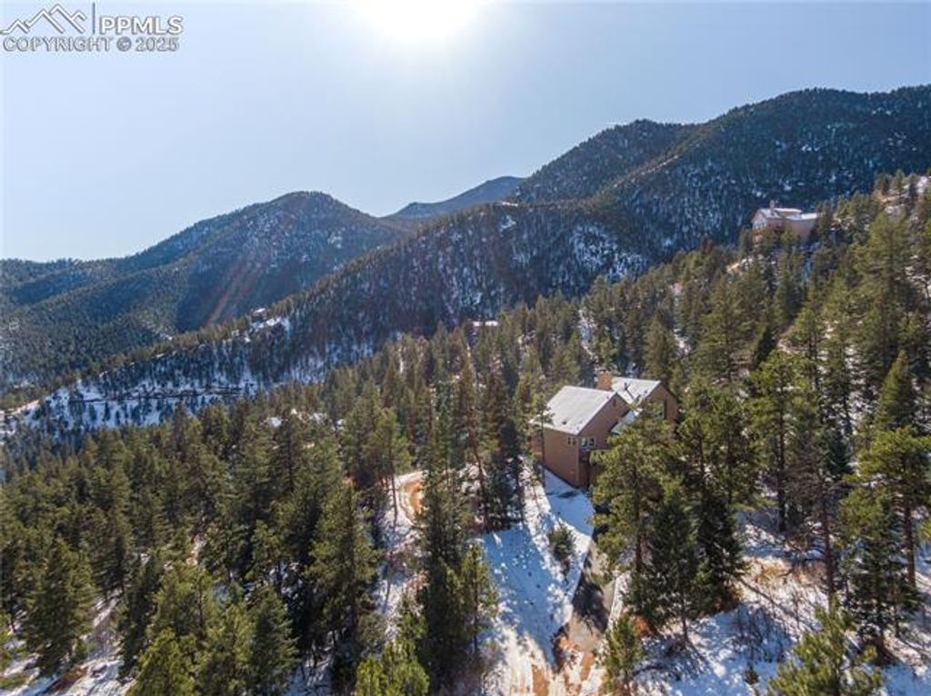 Welcome to this stunning remodeled Crystal Park home, located just 7 to 8 minutes from the manned, guarded gatehouse, an especially desirable setting offering easier access than homes higher in the park. This custom home captures beautiful views of Sugarloaf Summit and the Pikes Peak foothills and offers updated mountain living. The home features 3 spacious bedrooms, 3 bathrooms, and an oversized tandem 3-car garage. The light-filled main level showcases soaring vaulted ceilings, newly refinished hardwood floors, and an open-concept living, dining, and kitchen layout. The fully remodeled kitchen is ideal for entertaining and features soft-close cabinetry, an expanded island, Taj Mahal quartzite countertops, Samsung Bespoke appliances, an induction cooktop, and under- and over-cabinet lighting. The living room centers around a custom wood-burning fireplace with stacked stone surround, while the dining area walks out to a spacious back deck, pre-wired for a hot tub and perfect for enjoying mountain views. The main-level primary suite offers deck access, a sitting area, and a remodeled 5-piece bath with quartzite countertops, jetted tub, standalone shower, double vanity, and walk-in closet. Upstairs are two additional bedrooms and a fully remodeled bathroom. Additional upgrades include solid wood interior doors with modern hardware, fresh interior paint, LED lighting and ceiling fans, a high-efficiency heat pump with central A/C and propane furnace backup, whole-home water softener and humidifier, new garage door openers with MyQ camera keypads, and a new asphalt-paved driveway with extra parking. Major exterior updates include a new roof, gutters, and exterior paint in 2024. Crystal Park offers gated living with road maintenance, snow removal, private fire department, heated pool, stocked fishing pond, clubhouse, tennis and pickleball courts, basketball court, and park. This Lower Mountain Crystal Park home truly stands out. Schedule your showing today.
