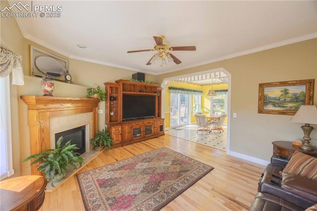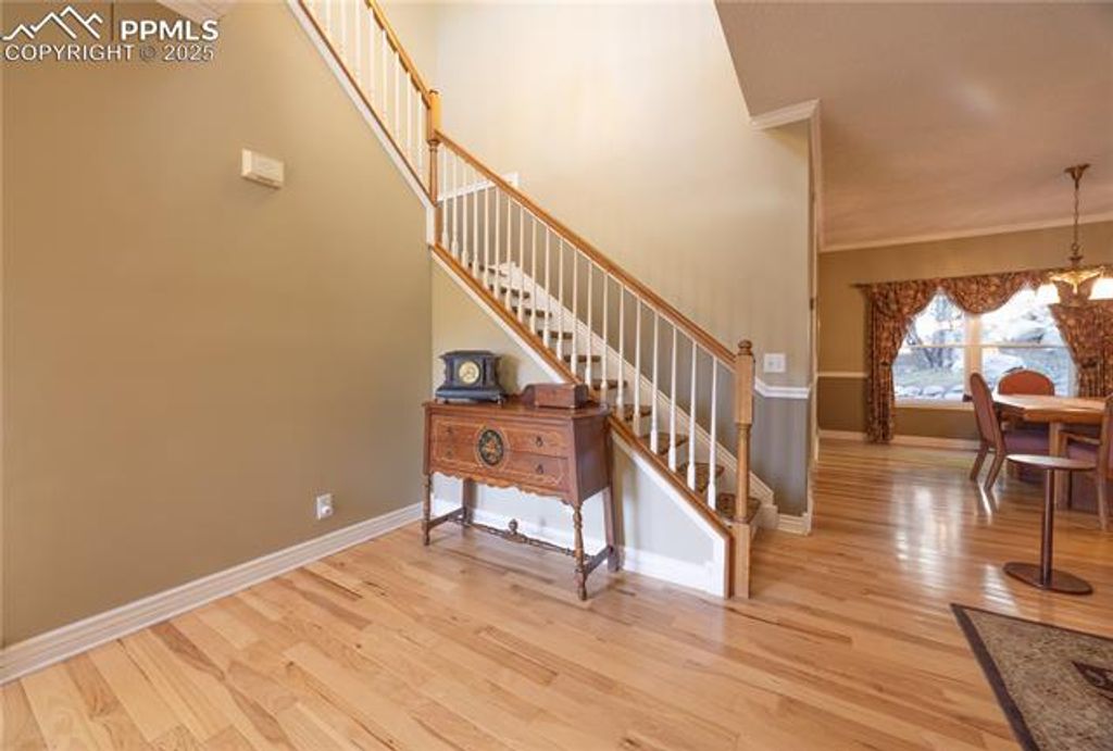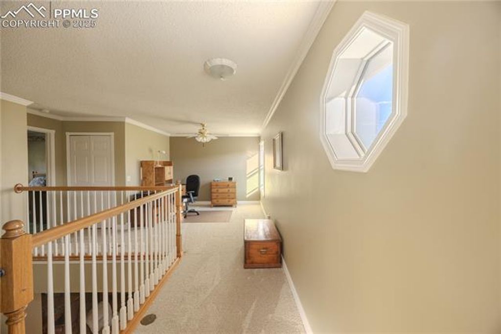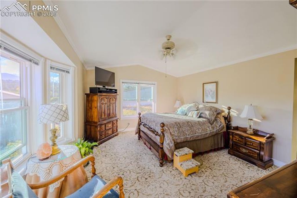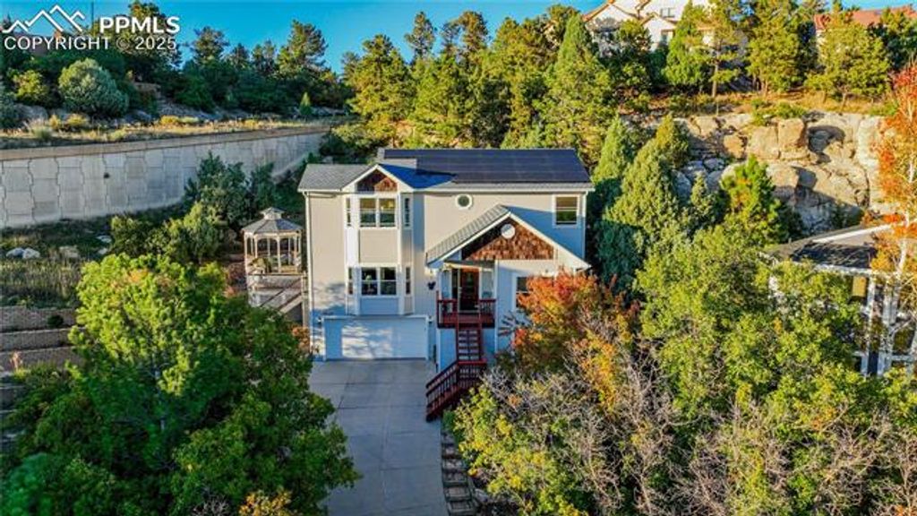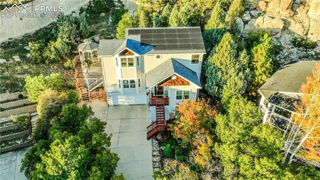 Welcome this amazing Colorado home! Nestled among mature Ponderosa pines in the desirable Pinecliff neighborhood, this home offers privacy, mountain views, and the perfect blend of nature and convenience. Enjoy ever-changing views of Pikes Peak and daily visits from wildlife. Relax in the west-facing gazebo at sunset or on the terraced back patio and garden beds. Soak in the hot tub after riding nearby Ute Valley Park. Oversized double-hung windows capture natural light and views, while 10' ceilings, crown molding, tall baseboards, and chair rails showcase custom craftsmanship. A private office offers charm and function. The kitchen and breakfast nook are warm and inviting with custom pantry pull-outs and lower cabinet drawers for easy storage. Upstairs, the primary suite is a true retreat with vaulted ceilings, & a bay window overlooking Pikes Peak. The attached bath has heated tile floor, two walk-in closets, and a five-piece bath with a jetted tub. The upper landing flex space is perfect for a reading nook or second office. A secondary bedroom includes a walk-in closet, private bath, and views of the natural rock formations which border the rear of the property & offer seclusion and privacy. On the lower level you'll find a sunny bedroom, adjacent bath, workshop/storage, and unfinished space ready for your home gym, theater, or expansion. The garage, also on this level, includes ample storage and the controls for the paid-off solar panels. The Pinecliff neighborhood offers sidewalks, pocket parks, and trail access into Ute Valley Park. The voluntary HOA brings neighbors together for recycling, beautification projects, and seasonal events. Conveniently located near Garden of the Gods Rd and I-25, you'll enjoy easy access to shopping, dining, and amenities while feeling tucked away in nature. This one-of-a-kind property combines thoughtful design, community spirit, and Colorado's natural beauty"”an ideal balance of retreat and accessibility.