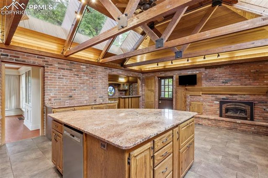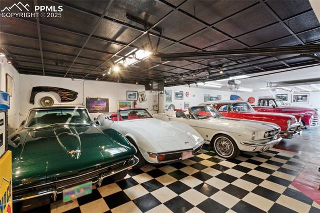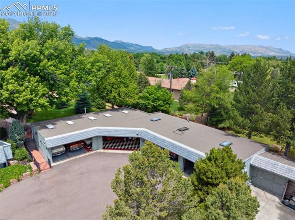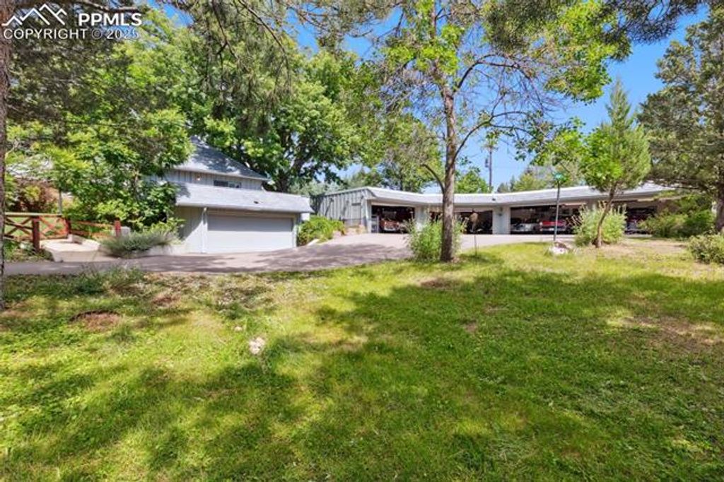 Welcome to this Broadmoor estate, nestled on 1.25 beautifully landscaped acres in one of Colorado Springs' most prestigious neighborhoods. Boasting an impressive pedigree with only two owners, as the home was built in 1958! Tucked within a quiet neighborhood, the home is accessed via a gated circular driveway, providing both seclusion and standout curb appeal. Car enthusiasts will appreciate the incredible 16-car garage capacity, a true rarity. Designed for effortless entertaining, the home features a stunning panoramic folding door system that seamlessly connects the family room to one of several patios, blurring the lines between indoor and outdoor living. The entertaining kitchenette in the family room makes hosting guests easy, while the patios open to lush, mature landscaping that feels like your own private park. At the heart of the home lies a spacious, light-filled kitchen, featuring granite countertops, a large island with breakfast bar, beamed ceilings, and multiple skylights. A cozy fireplace stove adds character and warmth to this space. The primary suite retreat has its own sitting room, private wet bar, and walk-out to a deck. The 5pc bath offers dual vanities, a walk-in tub, and a separate shower. Two additional bedrooms in this wing share a Jack-and-Jill bathroom. The living and dining rooms each showcase their own fireplace, providing spaces for gathering. An office/study off the kitchen includes extensive built-ins and another fireplace stove, creating a productive workspace. A separate wing features an additional bedroom, a three-quarter bath, and access to an upstairs playroom, perfect for children, hobbies, or additional guests. With six fireplaces, and exceptional outdoor living spaces, this one-of-a-kind estate is a Broadmoor legacy, offering a truly coveted location.