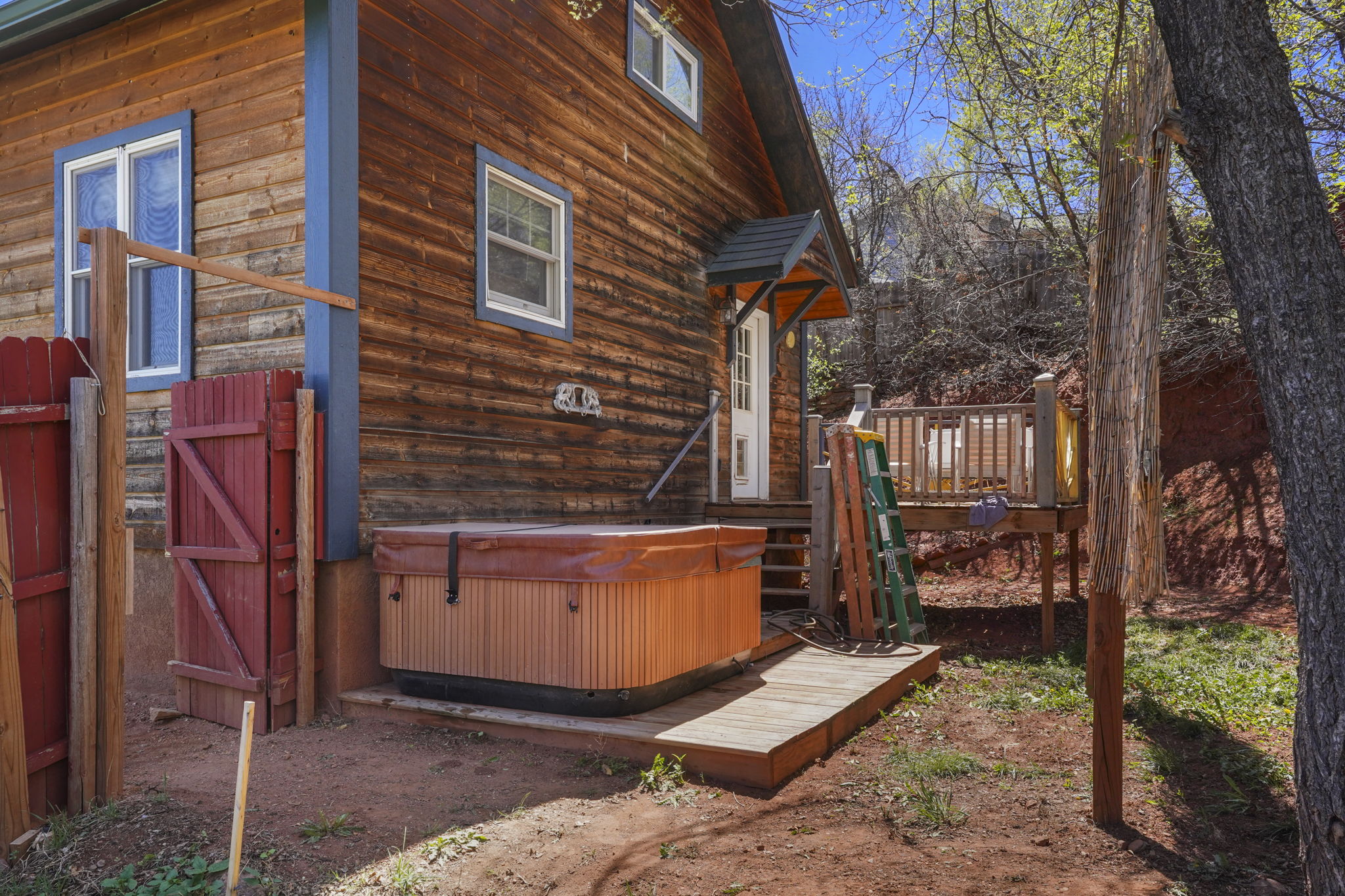 Mountain cabin in downtown Manitou Springs! Enjoy the views from almost every window. The kitchen, living room, dining area are all one, large room with beautiful wood floors and a vaulted ceiling. Nice kitchen appliances including a gas stove. Warm up to the gas fireplace and oversized window in the living room. There is a claw-foot tub and an on-demand water heater in the bathroom. The loft overlooking the main level is currently being used as an office and a guest bedroom. Step out the back door, into the secluded yard and hop in the hot tub. There are elevated decks in both the front and rear of the home. Newer water heater, ceiling fans and off-street parking. The home is built on three massive beams with huge footers. Easy walk to Memorial Park, downtown Manitou Springs shopping area and Manitou’s trail system!